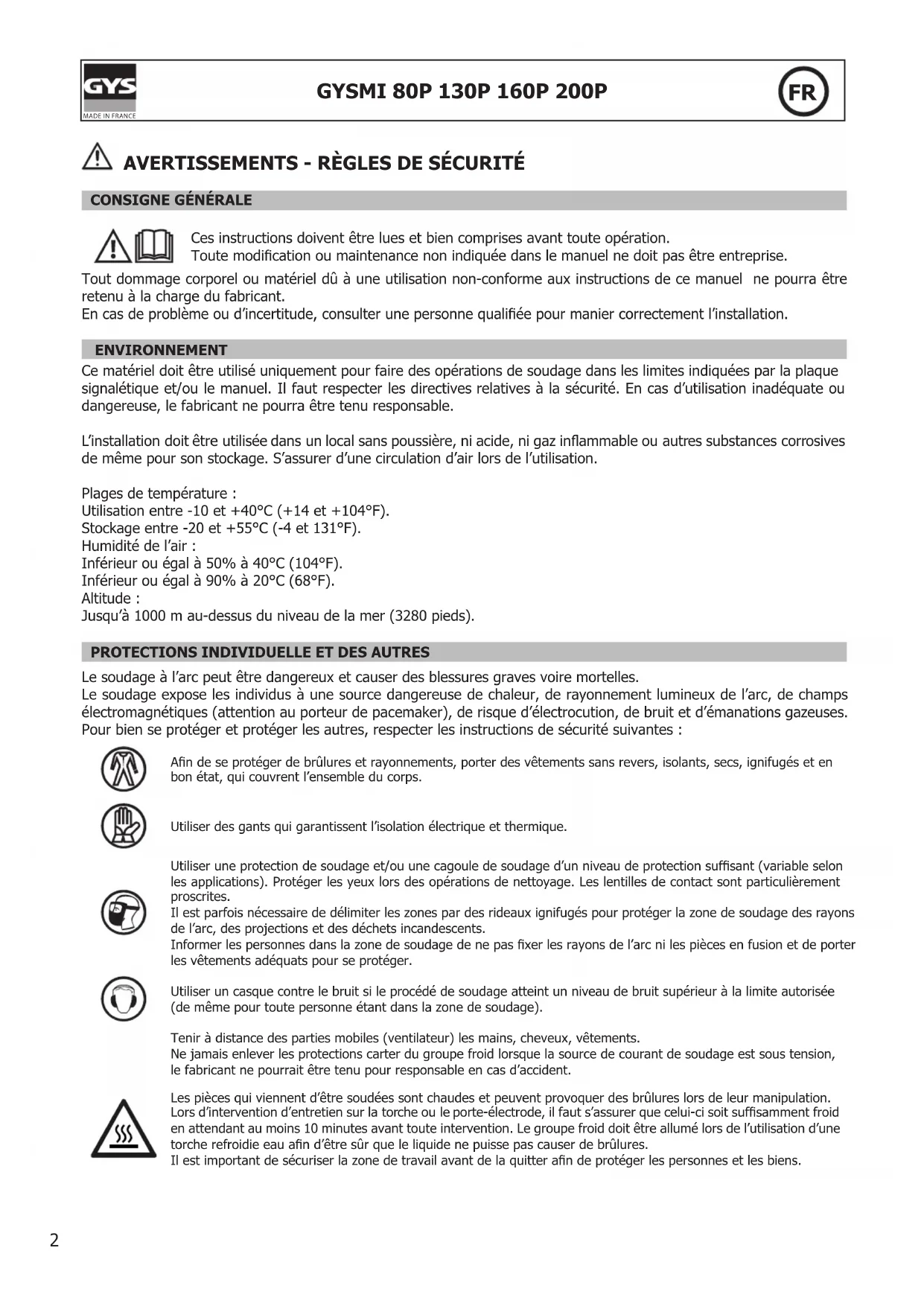 Le soudage à l’arc peut être dangereux et causer des blessures graves voire mortelles. Le soudage expose les individus à une source dangereuse de chaleur, de rayonnement lumineux de l’arc, de champs électromagnétiques (attention au porteur de pacemaker), de risque d’électrocution, de bruit et d’émanations gazeuses. Pour bien se protéger et protéger les autres, respecter les instructions de sécurité suivantes : An de se protéger de brûlures et rayonnements, porter des vêtements sans revers, isolants, secs, ignifugés et en bon état, qui couvrent l’ensemble du corps.Utiliser des gants qui garantissent l’isolation électrique et thermique. Utiliser une protection de soudage et/ou une cagoule de soudage d’un niveau de protection sufsant (variable selon les applications). Protéger les yeux lors des opérations de nettoyage. Les lentilles de contact sont particulièrement proscrites.Il est parfois nécessaire de délimiter les zones par des rideaux ignifugés pour protéger la zone de soudage des rayons de l’arc, des projections et des déchets incandescents.Informer les personnes dans la zone de soudage de ne pas xer les rayons de l’arc ni les pièces en fusion et de porter les vêtements adéquats pour se protéger.Utiliser un casque contre le bruit si le procédé de soudage atteint un niveau de bruit supérieur à la limite autorisée (de même pour toute personne étant dans la zone de soudage).Tenir à distance des parties mobiles (ventilateur) les mains, cheveux, vêtements.Ne jamais enlever les protections carter du groupe froid lorsque la source de courant de soudage est sous tension, le fabricant ne pourrait être tenu pour responsable en cas d’accident.Les pièces qui viennent d’être soudées sont chaudes et peuvent provoquer des brûlures lors de leur manipulation. Lors d’intervention d’entretien sur la torche ou le porte-électrode, il faut s’assurer que celui-ci soit sufsamment froid en attendant au moins 10 minutes avant toute intervention. Le groupe froid doit être allumé lors de l’utilisation d’une torche refroidie eau an d’être sûr que le liquide ne puisse pas causer de brûlures.Il est important de sécuriser la zone de travail avant de la quitter an de protéger les personnes et les biens. FR3
