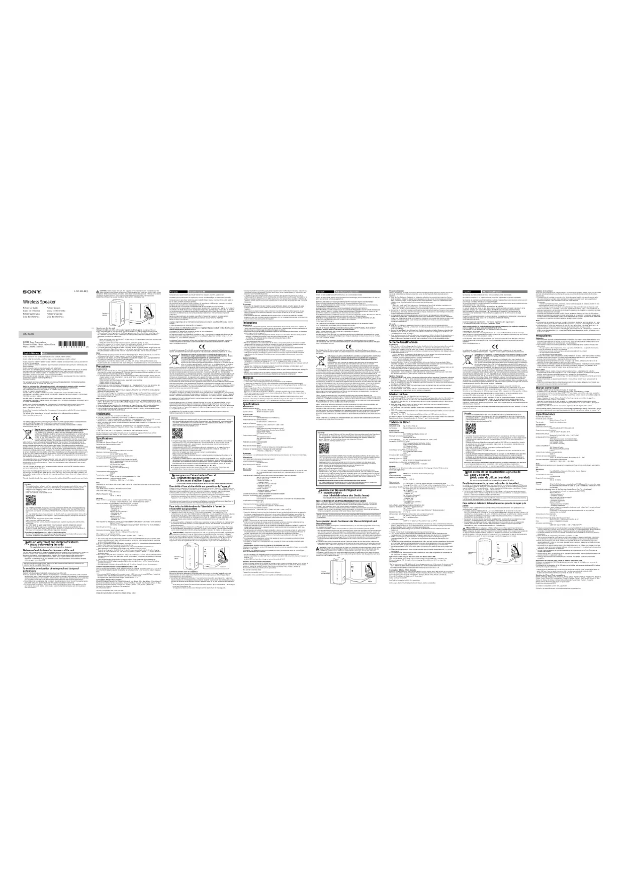 - When using a USB AC adaptor with an output current of 3.0 A, be sure to use a USB Type-C cable that conforms to the USB standard and supports an output current of 3.0 A. The supplied USB cable supports an output current of up to 1.5 A.Compatible iPhone/iPod modelsiPhone 13 Pro Max, iPhone 13 Pro, iPhone 13, iPhone 13 mini, iPhone 12 Pro Max, iPhone 12 Pro, iPhone 12, iPhone 12 mini, iPhone SE (2nd generation), iPhone 11 Pro Max, iPhone 11 Pro, iPhone 11, iPhone XS Max, iPhone XS, iPhone XR, iPhone X, iPhone 8 Plus, iPhone 8, iPhone 7 Plus, iPhone 7, iPhone SE, iPhone 6s Plus, iPhone 6s, iPod touch (7th generation)(As of November 2021)The unit is compatible with iOS 10.0 or later.Design and specifications are subject to change without notice.• Essuyez l’humidité sur sa surface, puis placez l’appareil sur un chiffon doux et sec pour évacuer l’eau recueillie à l’intérieur de l’appareil. Ensuite, laissez aussi sécher l’appareil dans un endroit bien aéré jusqu’à ce que l’humidité disparaisse.• La qualité du son peut changer lorsque de l’eau pénètre dans la partie enceinte ou la partie du radiateur passif de l’appareil. Cela ne constitue pas un dysfonctionnement. Essuyez l’humidité sur sa surface, puis placez l’appareil sur un chiffon doux et sec pour évacuer l’eau recueillie à l’intérieur de l’appareil. Ensuite, laissez aussi sécher l’appareil dans un endroit bien aéré jusqu’à ce que l’humidité disparaisse.Remarque• Si la surface de l’appareil est sale, n’utilisez pas de détergent, diluant, benzène, alcool, etc. pour nettoyer l’appareil, sous peine d’affecter la fonction qui repousse l’eau de la partie en tissu de l’appareil.• Surtout dans les régions froides, veillez à éliminer l’humidité après avoir utilisé l’appareil. Si vous laissez l’humidité sur la surface de l’appareil, celui-ci risque de geler et de ne plus fonctionner correctement.• Si des grains de sable, etc. pénètrent dans la partie en tissu ou toute autre partie de l’appareil, enlevez-les avec soin. N’utilisez jamais un aspirateur, etc. sur l’appareil. Cela pourrait endommager le haut-parleur ou toute autre partie de l’appareil. Précautions Rangement• Lorsque vous transportez l'appareil, saisissez-le fermement d'une main et posez-le sur la paume de l'autre main pour éviter qu’il ne glisse. Dans le cas contraire, l’appareil peut provoquer des blessures, s’endommager ou endommager les articles ménagers en glissant.• Pour éviter tout risque de dysfonctionnement, évitez les emplacements ci-dessous lors du placement ou du rangement de cet appareil : – un endroit soumis à des températures élevées, tel que sous la lumière directe du soleil, sous un dispositif d'éclairage, à proximité d'une source de chaleur ou dans un sauna; – à l'intérieur d'un véhicule dont les vitres sont fermées (surtout en été); – un endroit très poussiéreux; – un endroit soumis à de fortes vibrations.• Placez cet appareil sur une surface plane et de niveau. Lorsqu'il est placé sur une surface inclinée, l'appareil peut se renverser ou tomber de la surface en raison de ses propres vibrations, entraînant des blessures, des dysfonctionnements ou une dégradation des performances.• Selon les conditions dans lesquelles cet appareil est placé, il peut se renverser ou tomber de la surface. Ne laissez aucun objet de valeur à proximité de l’appareil.• Cet appareil n'est pas antimagnétique. Veuillez éloigner les objets sensibles à un rayonnement magnétique (cassettes enregistrées, montres, cartes de paiement, cartes de crédit avec codage magnétique, etc.) de l'appareil. N'oubliez pas ces recommandations lorsque vous transportez l'appareil.Autres remarques• N’utilisez ou ne laissez pas l’appareil dans un environnement extrêmement froid ou chaud (température à l’extérieur de la plage de 5 °C - 35 °C). Si l’appareil est utilisé ou laissé à une température à l’extérieur de cette plage, il pourrait s’arrêter automatiquement pour protéger le circuit interne.• Lorsque vous n'utilisez pas cet appareil pendant une période prolongée, sa température peut s'élever ; il ne s’agit pas d’un dysfonctionnement.• À haute température, il est possible que la charge s’arrête ou que le volume diminue pour protéger la batterie.• Même si vous envisagez de ne pas utiliser l’appareil pendant une période prolongée, chargez entièrement la batterie tous les 6 mois pour maintenir son niveau de performance. Marques