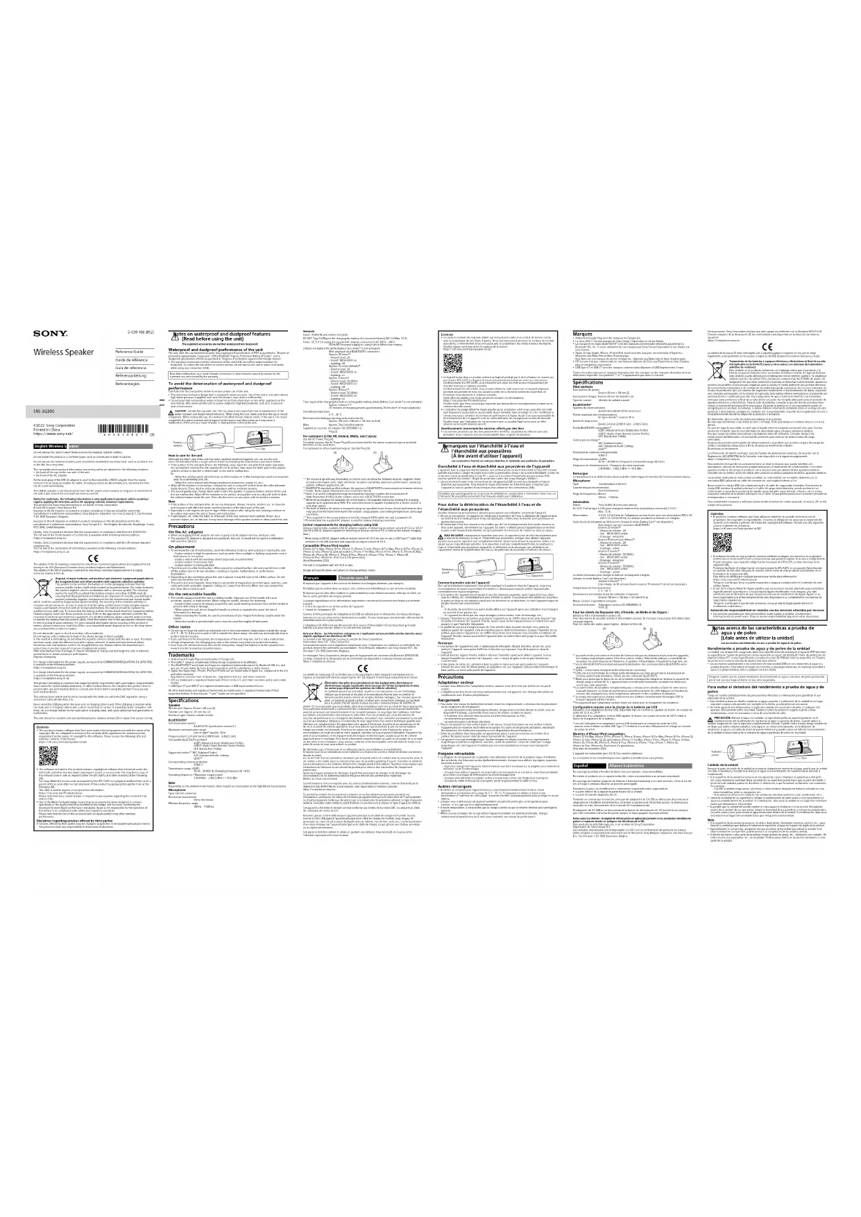 - When using a USB AC adaptor with an output current of 3.0 A, be sure to use a USB Type-C® cable that conforms to the USB standard and supports an output current of 3.0 A.Compatible iPhone/iPod modelsiPhone 13 Pro Max, iPhone 13 Pro, iPhone 13, iPhone 13 mini, iPhone 12 Pro Max, iPhone 12 Pro, iPhone 12, iPhone 12 mini, iPhone SE (2nd generation), iPhone 11 Pro Max, iPhone 11 Pro, iPhone 11, iPhone XS Max, iPhone XS, iPhone XR, iPhone X, iPhone 8 Plus, iPhone 8, iPhone 7 Plus, iPhone 7, iPhone SE, iPhone 6s Plus, iPhone 6s, iPod touch (7th generation)(As of November 2021)The unit is compatible with iOS 10.0 or later.Design and specifications are subject to change without notice. Français Enceinte sans fil N’exposez pas l’appareil à des sources de flamme nue (bougies allumées, par exemple).N’installez pas le produit dans un espace clos, comme une bibliothèque ou une armoire encastrée.N’exposez pas les piles (bloc-batterie ou piles installées) à une chaleur excessive, telle que le soleil, un feu ou autre, pendant une longue période.La plaque signalétique et les informations importantes concernant la sécurité sont fixées aux endroits suivants:• le dos du capuchon sur la face arrière de l’appareil.• l’avant de l’adaptateur CAComme la fiche principale de l’adaptateur CA USB est utilisée pour le débrancher du réseau électrique, branchez-le sur une prise secteur facilement accessible. Si vous remarquez une anomalie, débranchez-le immédiatement de la prise secteur.L’adaptateur CA USB n’est pas déconnecté de la source d’alimentation CA (secteur) tant qu’il reste branché à la prise murale, même s’il a été mis hors tension.Avis aux clients: les informations suivantes ne s’appliquent qu’aux produits vendus dans les pays/régions appliquant les directives de l’UE.Ce produit a été fabriqué par ou pour le compte de Sony Corporation.Importateur dans l’UE : Sony Europe B.V.Les questions basées sur la législation européenne pour l’importateur ou relatives à la conformité des produits doivent être adressées au mandataire : Sony Belgium, bijkantoor van Sony Europe B.V., Da Vincilaan 7-D1, 1930 Zaventem, Belgique.Le soussigné, Sony Corporation, déclare que cet équipement est conforme à la Directive 2014/53/UE.Le texte complet de la déclaration UE de conformité est disponible à l’adresse internet suivante :https://compliance.sony.euLa validité du marquage CE est limitée aux seuls pays/régions dans lesquels il est légalement en vigueur, principalement dans les pays/régions de l’EEE (Espace économique européen) et en Suisse.Élimination des piles et accumulateurs et des équipements électriques et électroniques usagés (applicable dans les pays de l’Union Européenne et dans les autres pays disposant de systèmes de collecte sélective)Ce symbole apposé sur le produit, la pile ou l’accumulateur, ou sur l’emballage, indique que le produit et les piles et accumulateurs fournis avec ce produit ne doivent pas être traités comme de simples déchets ménagers. Sur certains types de piles, ce symbole apparaît parfois combiné avec un symbole chimique. Le symbole pour le plomb (Pb) est rajouté lorsque ces piles contiennent plus de 0,004% de plomb. En vous assurant que les produits, piles et accumulateurs sont mis au rebut de façon appropriée, vous participez activement à la prévention des conséquences négatives que leur mauvais traitement pourrait provoquer sur l’environnement et sur la santé humaine. Le recyclage des matériaux contribue par ailleurs à la préservation des ressources naturelles. Pour les produits qui, pour des raisons de sécurité, de performance ou d’intégrité des données, nécessitent une connexion permanente à une pile ou à un accumulateur intégré(e), il conviendra de vous rapprocher d’un service technique qualifié pour effectuer son remplacement. En rapportant votre appareil électrique, les piles et accumulateurs en fin de vie à un point de collecte approprié, vous vous assurez que le produit, la pile ou l’accumulateur intégré sera traité correctement. Pour tous les autres cas de figure et afin d’enlever les piles ou accumulateurs en toute sécurité de votre appareil, reportez-vous au manuel d’utilisation. Rapportez les piles et accumulateurs, et les équipements électriques et électroniques usagés au point de collecte approprié pour le recyclage. Pour toute information complémentaire au sujet du recyclage de ce produit ou des piles et accumulateurs, vous pouvez contacter votre municipalité, votre déchetterie locale ou le point de vente où vous avez acheté ce produit.Ne démontez pas, n’ouvrez pas et ne détruisez pas les accumulateurs ou les batteries.N’exposez pas les accumulateurs ou les batteries à la chaleur ou à un feu. Évitez de stocker à la lumière directe du soleil.En cas de fuite d’un accumulateur, ne laissez pas le liquide entrer en contact avec la peau ou les yeux. Si un contact a été établi, lavez la zone touchée avec de grandes quantités d’eau et consultez un médecin.Les accumulateurs et les batteries doivent être chargés avant d’être utilisés. Reportez-vous toujours aux instructions du fabricant ou au manuel du produit pour obtenir des instructions de chargement pertinentes.Après de longues périodes de stockage, il peut être nécessaire de charger et de décharger les accumulateurs ou les batteries plusieurs fois pour obtenir une performance maximale.Mettez au rebut correctement.Les informations d’écoconception pour les sources d’alimentation externes, comme demandé par le règlement (UE) 2019/1782 de la Commission, sont disponibles à l’adresse suivante:https://compliance.sony.euCe produit (y compris les accessoires) comporte un ou des aimants qui peuvent perturber les stimulateurs cardiaques, les valves de dérivation programmables pour le traitement de l’hydrocéphalie ou d’autres appareil
