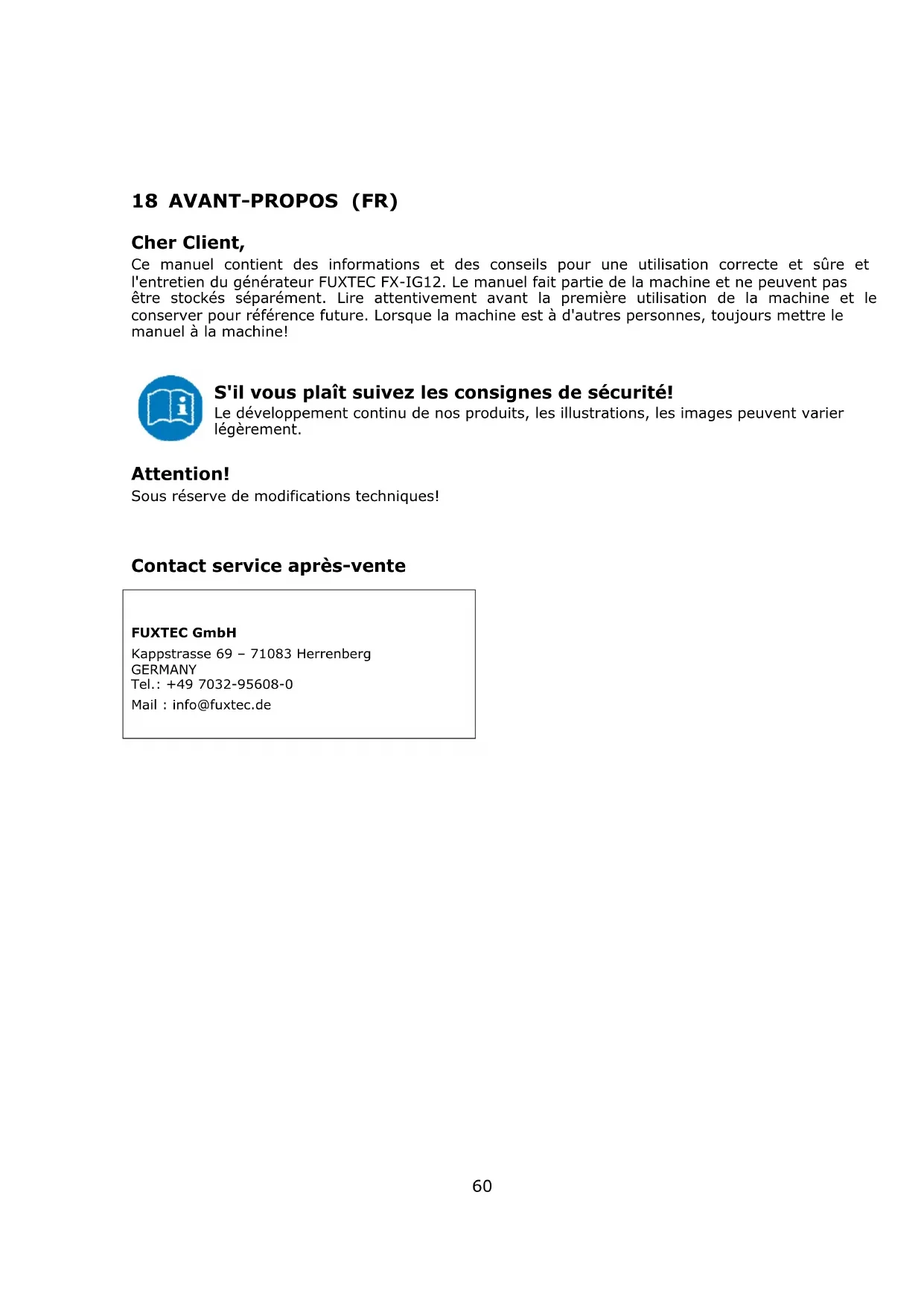 18 AVANT-PROPOS (FR) Cher Client, Ce manuel contient des informations et des conseils pour une utilisation correcte et sûre et l'entretien du générateur FUXTEC FX-IG12. Le manuel fait partie de la machine et ne peuvent pas être stockés séparément. Lire attentivement avant la première utilisation de la machine et le conserver pour référence future. Lorsque la machine est à d'autres personnes, toujours mettre le manuel à la machine!