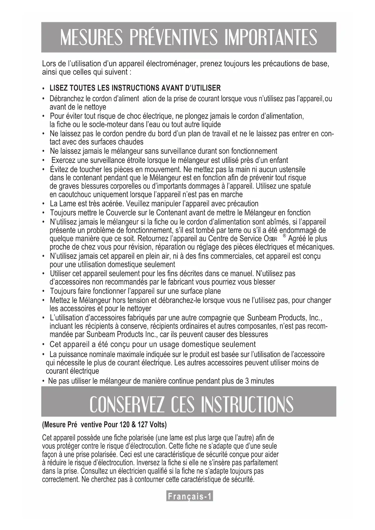 - Ne pas utiliser le mélangeur de manière continue pendant plus de 3 minutes ConsErVEZ CEs instruCtions (Mesure Pré ventive Pour 120 & 127 Volts) Cet appareil possède une fiche polarisée (une lame est plus large que l’autre) afin de vous protéger contre le risque d’électrocution. Cette fiche ne s’adapte que d’une seule façon à une prise polarisée. Ceci est une caractéristique de sécurité conçue pour aider à réduire le risque d’électrocution. Inversez la fiche si elle ne s’insère pas parfaitement dans la prise. Consultez un électricien qualifié si la fiche ne s’adapte toujours pas correctement. Ne cherchez pas à contourner cette caractéristique de sécurité.Français-2