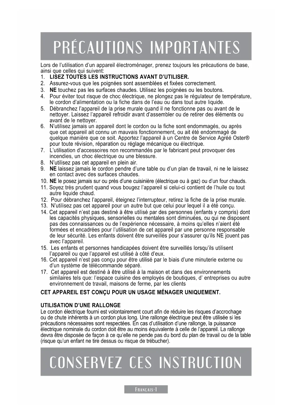 similaires tels que: l’espace cuisine des employés de boutiques, d’ entreprises ou autre environnement de travail, maisons de ferme, par les clients cet appaReil est conçu pouR un usage ménageR uniquement. utilisation d’une Rallonge Le cordon électrique fourni est volontairement court afin de réduire les risques d’accrochage ou de chute inhérents à un cordon plus long. Une rallonge électrique peut être utilisée si les précautions nécessaires sont respectées. En cas d’utilisation d’une rallonge, la puissance électrique nominale du cordon doit être au moins équivalente à celle de l’appareil. La rallonge devra être disposée de façon à ce qu’elle ne pende pas du bord du plan de travail ou de la table (risque qu’un enfant ne tire dessus ou risque de trébucher). CONSERVEZ CES INSTRUCTIONFrançais-2