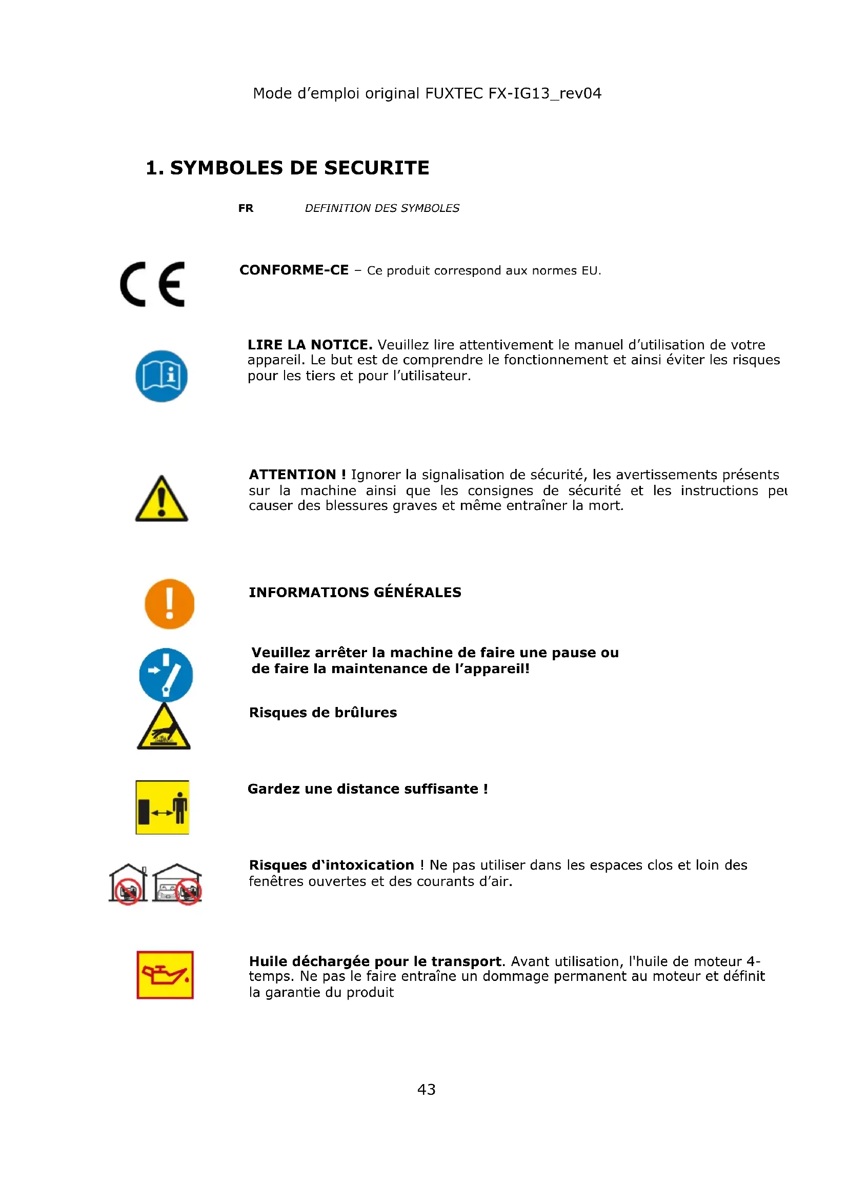 Les gaz d'échappement contiennent du monoxyde de carbone toxique. L'exposition peut provoquer l'inconscience et la mort.Mode d’emploi original FUXTEC FX-IG13_rev04