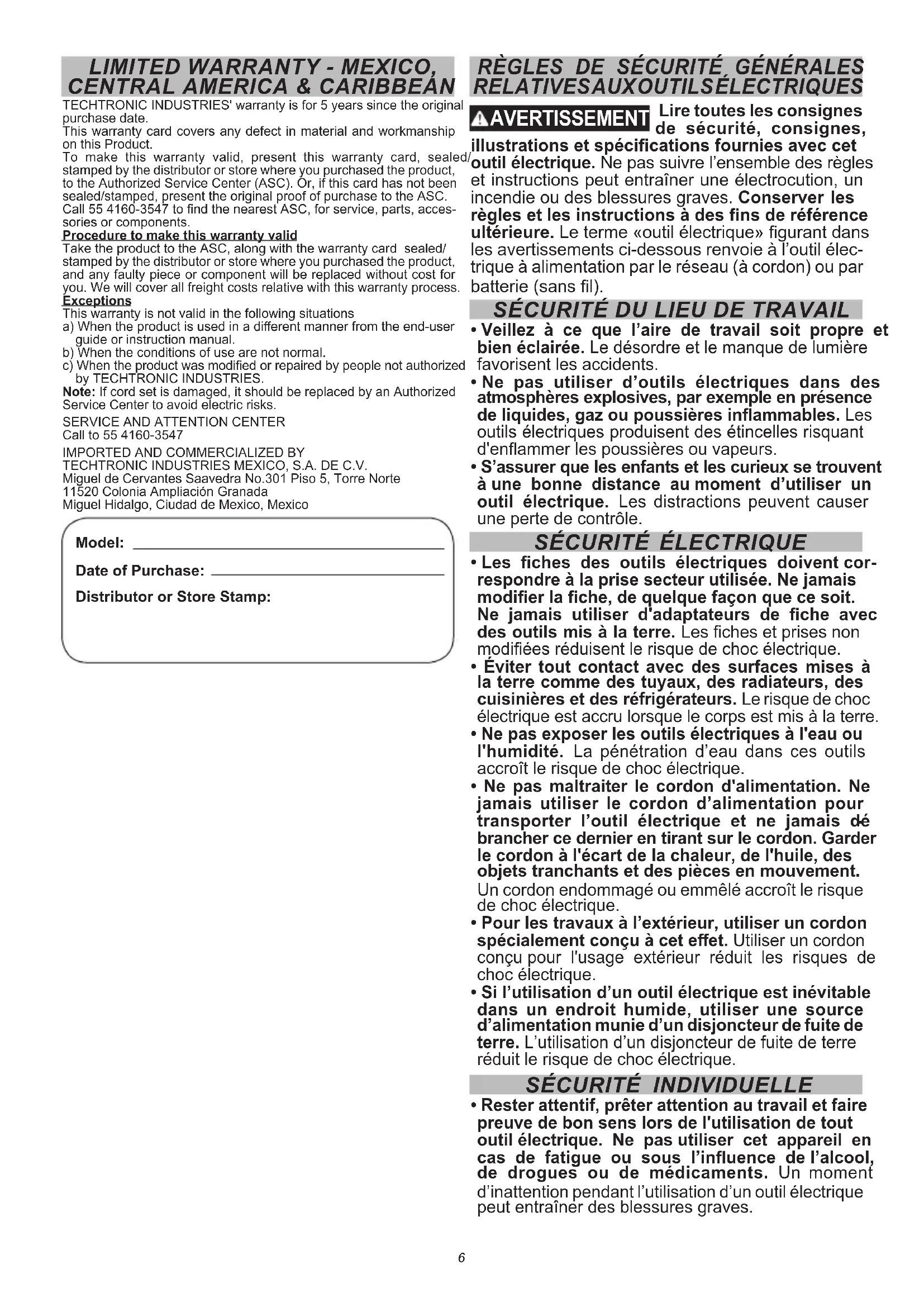 TECHTRONIC INDUSTRIES' garantit le produit pendant 5 ans à partir de la date d’achat d’origine. Le présent bon de garantie couvre tous les vices de matériau et de fabrication que peut acher ce produit. Pour assurer la validité de la présente garantie, veuillez présenter ce bon de garantie, estampillé du sceau du distributeur ou du magasin où le produit a été acheté, au centre de réparations agréé. Si le bon de garantie n’a pas été estampillé, veuillez fournir la preuve d’achat d’origine au centre de réparations agréé. Pour un entretien des pièces, des accessoires ou des composants, composer 55 4160-3547 an d’obtenir les coordonnées du centre de réparations agréé le plus près. Procédure pour assurer la validité de la garantie Présenter le produit au centre de réparations agréé, accompagné du bon de garantie estampillé du sceau du distributeur ou du magasin où le produit a été acheté. Toute pièce défectueuse ou tout composant défectueux sera remplacé(e) sans frais. Milwaukee assume tous les frais de transport liés à ce processus de garantie. Exceptions Cette garantie ne s’applique pas dans les situations suivantes : a) Si le produit a été utilisé pour une n autre que celle indiquée dans le guide de l’utilisateur nal ou le manuel d’instructions. b) Si les conditions d’utilisations ne sont pas habituelles. c) Si le produit a été modié ou réparé par une personne non autorisée par TECHTRONIC INDUSTRIES. Remarque : Si le cordon électrique est endommagé, il doit être remplacé par un centre de réparations agréé pour éviter les risques d’électrocution. CENTRE DE RÉPARATIONS ET DE SERVICE Composer le 55 4160-3547