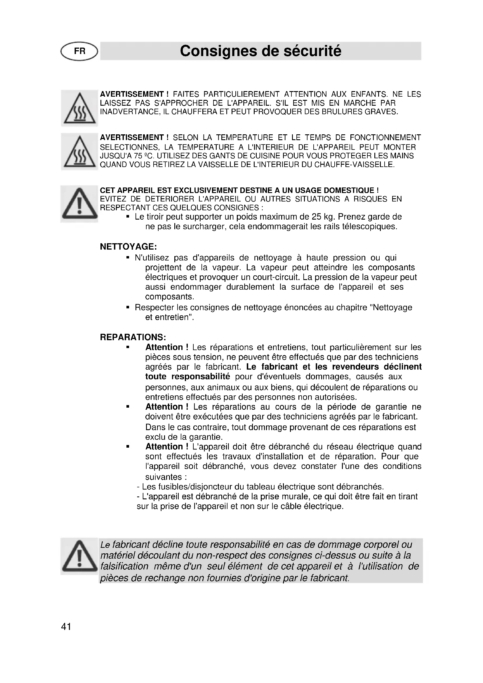 CET APPAREIL EST EXCLUSIVEMENT DESTINE A UN USAGE DOMESTIQUE ! EVITEZ DE DETERIORER L'APPAREIL OU AUTRES SITUATIONS A RISQUES EN RESPECTANT CES QUELQUES CONSIGNES : Le tiroir peut supporter un poids maximum de 25 kg. Prenez garde de ne pas le surcharger, cela endommagerait les rails télescopiques. NETTOYAGE: N'utilisez pas d'appareils de nettoyage à haute pression ou qui projettent de la vapeur. La vapeur peut atteindre les composants électriques et provoquer un court-circuit. La pression de la vapeur peut aussi endommager durablement la surface de l'appareil et ses composants. Respecter les consignes de nettoyage énoncées au chapitre "Nettoyage et entretien". REPARATIONS: Attention ! Les réparations et entretiens, tout particulièrement sur les pièces sous tension, ne peuvent être effectués que par des techniciens agréés par le fabricant. Le fabricant et les revendeurs déclinent toute responsabilité pour d'éventuels dommages, causés aux personnes, aux animaux ou aux biens, qui découlent de réparations ou entretiens effectués par des personnes non autorisées. Attention ! Les réparations au cours de la période de garantie ne doivent être exécutées que par des techniciens agréés par le fabricant. Dans le cas contraire, tout dommage provenant de ces réparations est exclu de la garantie. Attention ! L'appareil doit être débranché du réseau électrique quand sont effectués les travaux d'installation et de réparation. Pour que l'appareil soit débranché, vous devez constater l'une des conditions suivantes : - Les fusibles/disjoncteur du tableau électrique sont débranchés. - L'appareil est débranché de la prise murale, ce qui doit être fait en tirant sur la prise de l'appareil et non sur le câble électrique.