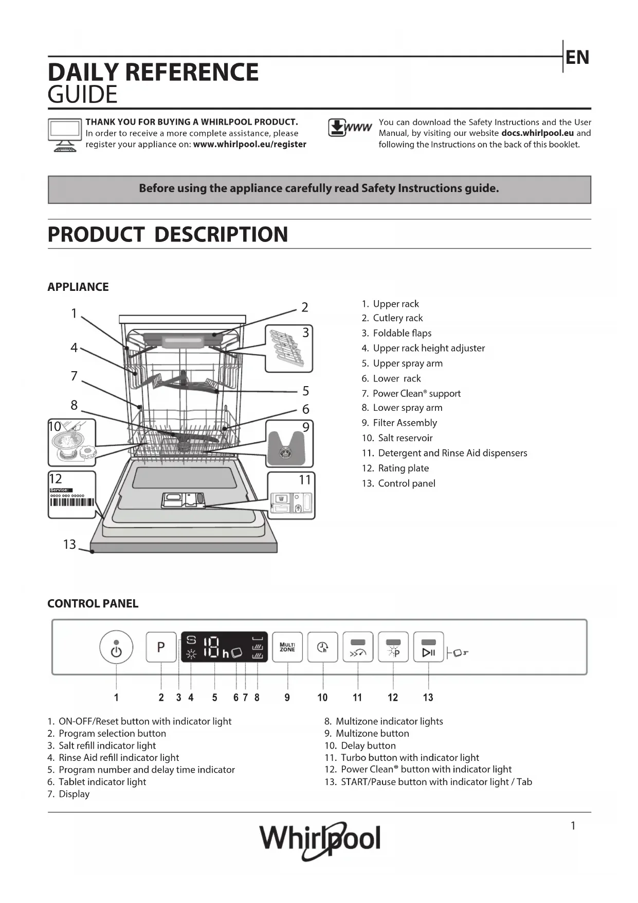 APPAREILPANNEAU DE COMMANDEMERCI D’AVOIR CHOISI UN PRODUIT WHIRLPOOL Afin de recevoir une assistance plus complète, merci d’enregistrer votre appareil sur on: www.whirlpool.eu/registerVous pouvez télécharger les Consignes de sécurité et le Manuel de l’utilisateur, en visitant notre site Internet docs.whirlpool.eu et en suivant les instructions figurant au verso du présent fascicule.1. Panier supérieur2. Compartiment a couvert3. Volets pliables4. Bouton de réglage de la hauteur du panier supérieur5. Bras d’aspersion supérieur6. Panier inférieur7. Supports PowerClean®8. Bras d’aspersion inférieur9. Ensemble ltre10. Réservoir à sel11. Distributeurs de détergent et liquide de rinçage12. Plaque signalétique13. Panneau de commande1. Touche Marche-Arrêt/Réinitialisation avec le voyant2. Sélecteur de programme3. Voyant de niveau de sel4. Voyant de niveau de liquide de rinçage5. Voyant pour le numéro du programme et le retard réglage6. Voyant Pastille7. Achage8. Voyant Multizone9. Touche Multizone10. Touche Diéré11. Touche Turbo avec le voyant12. Touche Power Clean® avec le voyant13. Touche Départ/Pause avec le voyant / Pastille0000 000 00000 Service: