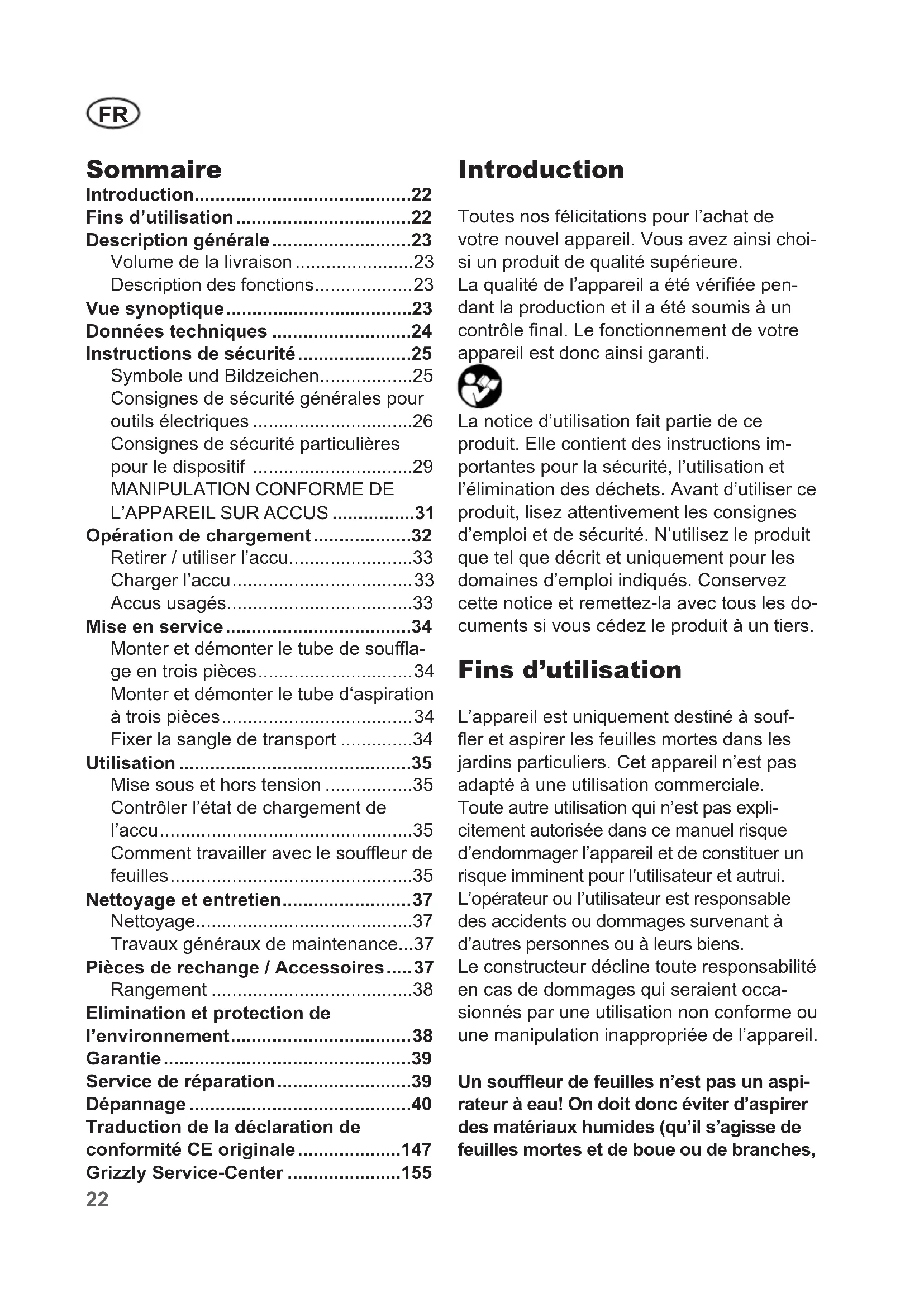 - Introduction Toutes nos félicitations pour l’achat de votre nouvel appareil. Vous avez ainsi choi- si un produit de qualité supérieure. La qualité de l’appareil a été vériée pen- dant la production et il a été soumis à un contrôle nal. Le fonctionnement de votre appareil est donc ainsi garanti. La notice d’utilisation fait partie de ce produit. Elle contient des instructions im- portantes pour la sécurité, l’utilisation et l’élimination des déchets. Avant d’utiliser ce produit, lisez attentivement les consignes d’emploi et de sécurité. N’utilisez le produit que tel que décrit et uniquement pour les domaines d’emploi indiqués. Conservez cette notice et remettez-la avec tous les do- cuments si vous cédez le produit à un tiers. Fins d’utilisation L’appareil est uniquement destiné à souf- er et aspirer les feuilles mortes dans les jardins particuliers. Cet appareil n’est pas adapté à une utilisation commerciale. Toute autre utilisation qui n’est pas expli- citement autorisée dans ce manuel risque d’endommager l’appareil et de constituer un risque imminent pour l’utilisateur et autrui. L’opérateur ou l’utilisateur est responsable des accidents ou dommages survenant à d’autres personnes ou à leurs biens. Le constructeur décline toute responsabilité en cas de dommages qui seraient occa- sionnés par une utilisation non conforme ou une manipulation inappropriée de l’appareil. Un soueur de feuilles n’est pas un aspi- rateur à eau! On doit donc éviter d’aspirer des matériaux humides (qu’il s’agisse de feuilles mortes et de boue ou de branches, Traduction de la déclaration de conformité CE originale p. 147
