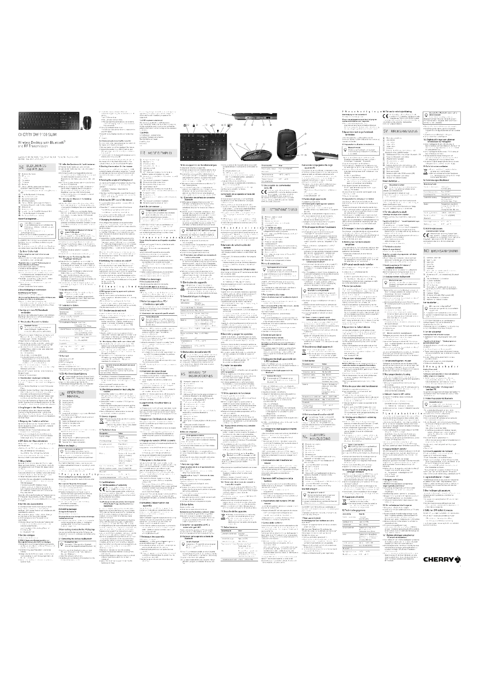 UK Authorised Representative:Authorised Representative ServiceThe Old Methodist ChapelGreat HucklowSK17 8RG ① Navigateur, démarrage② Blocage du PC③ Volume plus bas④ Activer/désactiver le son⑤ Volume plus fort⑥ Calculatrice⑦ LED d’état pour le niveau de charge de la batterie, connexion Bluetooth ou radio⑧ Commutateur radio (RF)/arrêt (position centrale)/Bluetooth (BT)⑨ Touche pour la connexion Bluetooth⑩ Prise pour le câble de recharge⑪ Prise pour le câble de recharge⑫ Commutateur de DPI⑬ LED d’état pour le niveau de charge de la batterie, résolution, connexion Bluetooth ou radio⑭ Navigation avant⑮ Navigation arrière⑯ Commutateur arrêt (off) / radio (RF) / Bluetooth (BT) ⑰ Touche pour la connexion Bluetooth⑱ Récepteur pour la connexion radio Avant de commencer ... CHERRY DW 9100 SLIM est une combinaison de clavier et de souris sans fil pour l’utilisation des PC / ordinateurs portables.Pour obtenir des informations sur d'autres produits, sur les téléchargements et bien d'autres choses, consultez le site www.cherry.de. 1Pour votre sécurité Risque d’étouffement en cas d’ingestion de petites pièces• Conserver l’appareil hors de portée des enfants de moins de 3 ans.LMR signifie "Lésion due aux mouvements répétitifs"Le syndrome LMR apparaît suite à de petits mouvements se répétant en permanence.• Organisez votre poste de travail de manière ergonomique.• Positionnez le clavier et la souris de telle façon que vos bras et vos poignets se trouvent latéralement par rapport au corps et soient étendus.• Modifiez l’inclinaison du clavier en montant la barre de support.• Faites plusieurs petites pauses, le cas échéant accompagnées d’exercices d’étirement.• Modifiez souvent votre attitude corporelle. 2 Éviter les dommages Endommagement du clavier• Ne retirez pas les cabochons de touche.Effacement des supports de données et endommagement des montres mécaniques par des aimants• Ne placez pas les supports de données (cartes magnétiques, disques durs externes, etc.) ou les montres mécaniques à moins de 10 cm de la souris ou de la barre de support du clavier. 3 Relier les appareils au PC / à l’ordinateur portable Vous pouvez relier les appareils au PC / à l’ordinateur portable par Bluetooth ou avec le récepteur via la connexion radio 2,4 GHz.