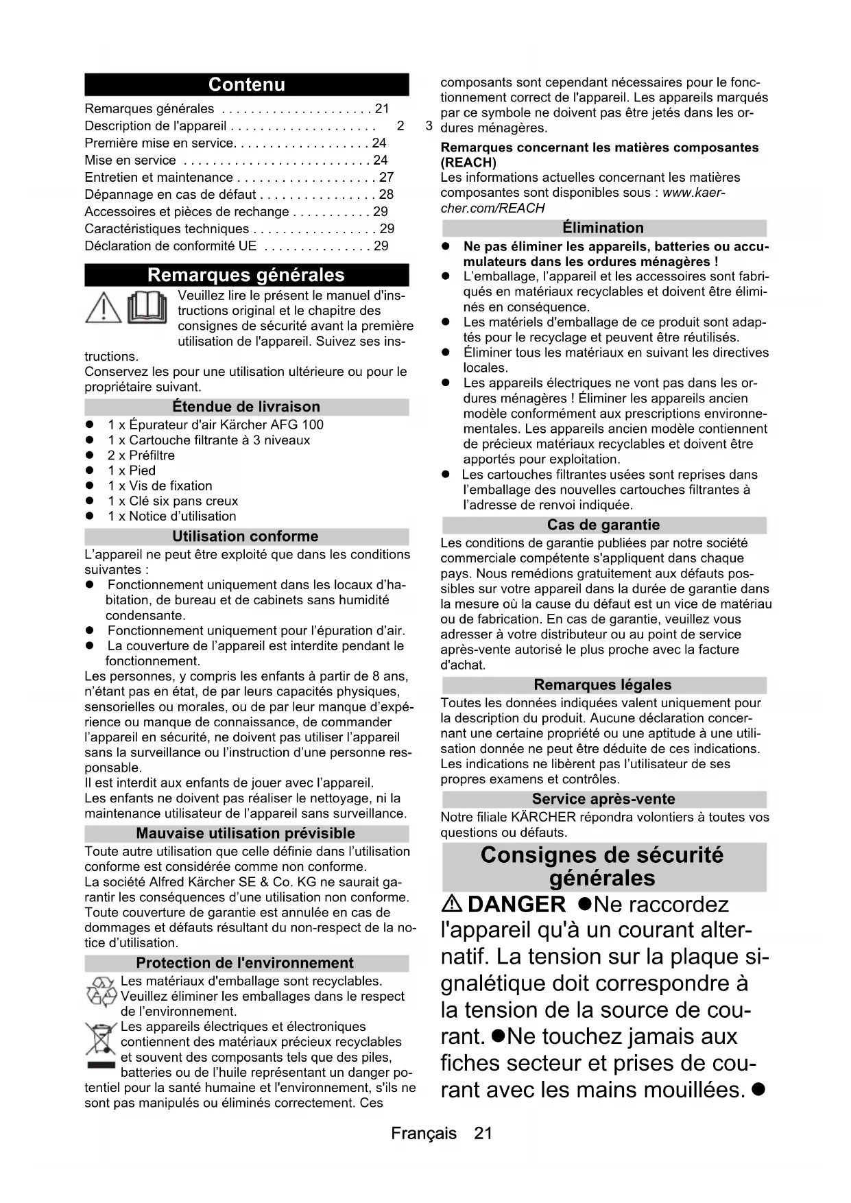 • dB(A) 37 - 65 Weight kg 13 Height mm 1120 Footplate diameter mm 320 Ambient temperature °C 10 - 30 Relative humidity % 20 - 80 Chairman of the Board of ManagementDirector Regulatory Affairs & Certification H. Jenner S. ReiserFrançais 21 Contenu Remarques générales Veuillez lire le présent le manuel d'ins- tructions original et le chapitre des consignes de sécurité avant la première utilisation de l'appareil. Suivez ses ins- tructions. Conservez les pour une utilisation ultérieure ou pour le propriétaire suivant. Étendue de livraison 1 x Épurateur d'air Kärcher AFG 100 1 x Cartouche filtrante à 3 niveaux 2 x Préfiltre 1 x Pied 1 x Vis de fixation 1 x Clé six pans creux 1 x Notice d’utilisation Utilisation conforme L’appareil ne peut être exploité que dans les conditions suivantes : Fonctionnement uniquement dans les locaux d’ha- bitation, de bureau et de cabinets sans humidité condensante. Fonctionnement uniquement pour l’épuration d’air. La couverture de l’appareil est interdite pendant le fonctionnement. Les personnes, y compris les enfants à partir de 8 ans, n’étant pas en état, de par leurs capacités physiques, sensorielles ou morales, ou de par leur manque d’expé- rience ou manque de connaissance, de commander l’appareil en sécurité, ne doivent pas utiliser l’appareil sans la surveillance ou l’instruction d’une personne res- ponsable. Il est interdit aux enfants de jouer avec l’appareil. Les enfants ne doivent pas réaliser le nettoyage, ni la maintenance utilisateur de l’appareil sans surveillance. Mauvaise utilisation prévisible Toute autre utilisation que celle définie dans l’utilisation conforme est considérée comme non conforme. La société Alfred Kärcher SE & Co. KG ne saurait ga- rantir les conséquences d’une utilisation non conforme. Toute couverture de garantie est annulée en cas de dommages et défauts résultant du non-respect de la no- tice d’utilisation. Protection de l'environnement Les matériaux d'emballage sont recyclables. Veuillez éliminer les emballages dans le respect de l’environnement. Les appareils électriques et électroniques contiennent des matériaux précieux recyclables et souvent des composants tels que des piles, batteries ou de l’huile représentant un danger po- tentiel pour la santé humaine et l'environnement, s'ils ne sont pas manipulés ou éliminés correctement. Ces composants sont cependant nécessaires pour le fonc- tionnement correct de l'appareil. Les appareils marqués par ce symbole ne doivent pas être jetés dans les or- dures ménagères. Remarques concernant les matières composantes (REACH) Les informations actuelles concernant les matières composantes sont disponibles sous : www.kaer- cher.com/REACH Élimination Ne pas éliminer les appareils, batteries ou accu- mulateurs dans les ordures ménagères ! L’emballage, l’appareil et les accessoires sont fabri- qués en matériaux recyclables et doivent être élimi- nés en conséquence. Les matériels d'emballage de ce produit sont adap- tés pour le recyclage et peuvent être réutilisés. Éliminer tous les matériaux en suivant les directives locales. Les appareils électriques ne vont pas dans les or- dures ménagères ! Éliminer les appareils ancien modèle conformément aux prescriptions environne- mentales. Les appareils ancien modèle contiennent de précieux matériaux recyclables et doivent être apportés pour exploitation. Les cartouches filtrantes usées sont reprises dans l’emballage des nouvelles cartouches filtrantes à l’adresse de renvoi indiquée. Cas de garantie Les conditions de garantie publiées par notre société commerciale compétente s'appliquent dans chaque pays. Nous remédions gratuitement aux défauts pos- sibles sur votre appareil dans la durée de garantie dans la mesure où la cause du défaut est un vice de matériau ou de fabrication. En cas de garantie, veuillez vous adresser à votre distributeur ou au point de service après-vente autorisé le plus proche avec la facture d'achat. Remarques légales Toutes les données indiquées valent uniquement pour la description du produit. Aucune déclaration concer- nant une certaine propriété ou une aptitude à une utili- sation donnée ne peut être déduite de ces indications. Les indications ne libèrent pas l’utilisateur de ses propres examens et contrôles. Service après-vente Notre filiale KÄRCHER répondra volontiers à toutes vos questions ou défauts. Consignes de sécurité générales DANGER Ne raccordez l'appareil qu'à un courant alter- natif. La tension sur la plaque si- gnalétique doit correspondre à la tension de la source de cou- rant. Ne touchez jamais aux fiches secteur et prises de cou- rant avec les mains mouillées. Remarques générales p. 21