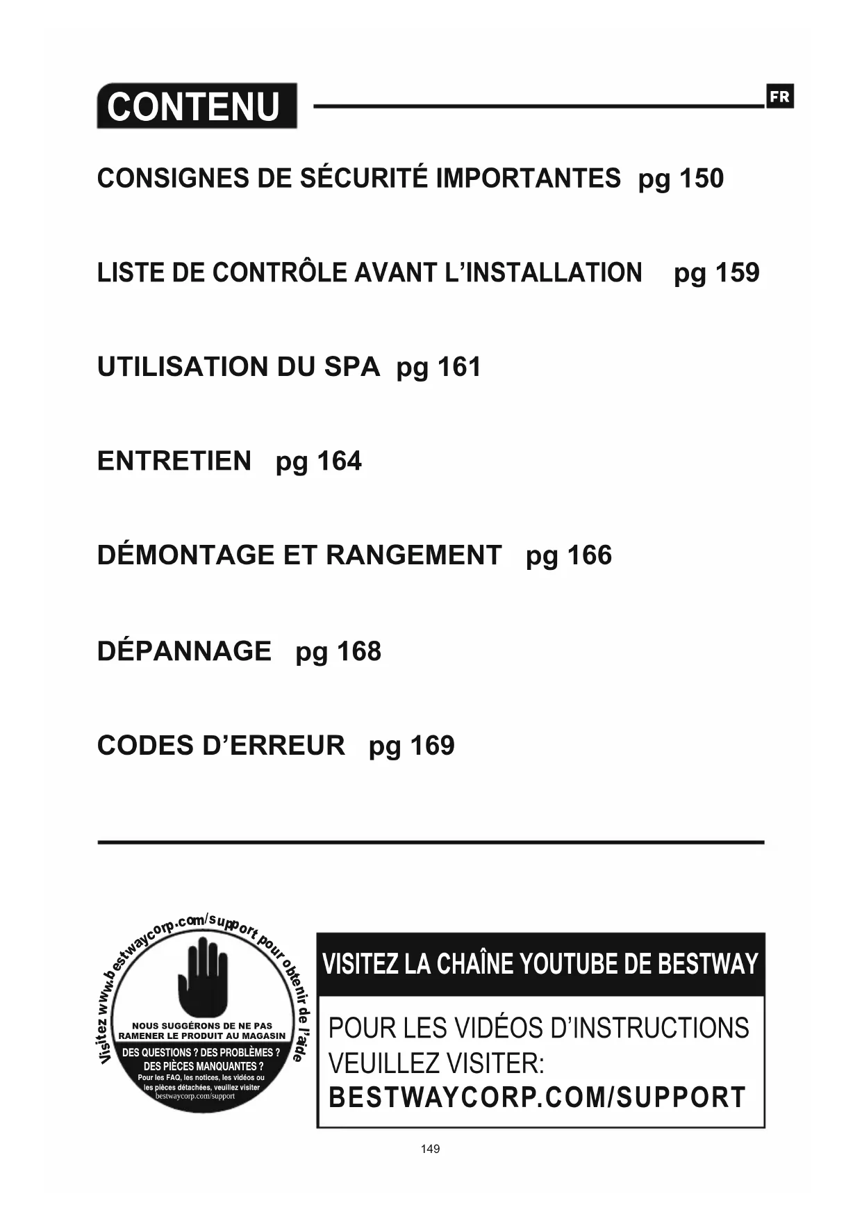 DES QUESTIONS ? DES PROBLÈMES ? DES PIÈCES MANQUANTES ? Pour les FAQ, les notices, les vidéos ou les pièces détachées, veuillez visiter bestwaycorp.com/support