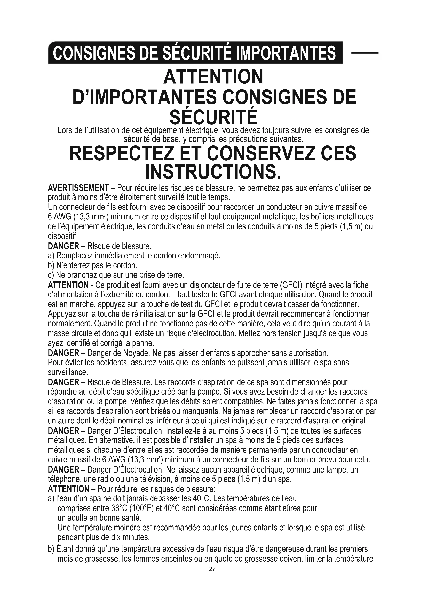 ) minimum à un connecteur de fils sur un bornier prévu pour cela. DANGER – Danger D’Électrocution. Ne laissez aucun appareil électrique, comme une lampe, un téléphone, une radio ou une télévision, à moins de 5 pieds (1,5 m) d’un spa. ATTENTION – Pour réduire les risques de blessure: a) l’eau d’un spa ne doit jamais dépasser les 40°C. Les températures de l'eau comprises entre 38°C (100°F) et 40°C sont considérées comme étant sûres pour un adulte en bonne santé. Une température moindre est recommandée pour les jeunes enfants et lorsque le spa est utilisé pendant plus de dix minutes. b) Étant donné qu’une température excessive de l’eau risque d’être dangereuse durant les premiers mois de grossesse, les femmes enceintes ou en quête de grossesse doivent limiter la température de l’eau à 38°C (100°F). c) Avant d’entrer dans le spa, l’utilisateur doit mesurer la température de l’eau avec un thermomètre précis étant donné que la tolérance des appareils de réglage de la température de l’eau varie. d) La consommation d’alcool, de drogue ou de médicament avant ou en pendant l’utilisation d’un Spa peut faire perdre connaissance et engendre donc un risque de noyade. e) Les personnes obèses et avec des antécédents cardiaques, des problèmes de tension artérielle, de circulation du sang ou de diabète doivent consulter un médecin avant d’utiliser le Spa. f ) Les personnes sous traitement doivent consulter un médecin avant d’utiliser un spa car certains médicaments peuvent engendrer un risque de noyade ou encore avoir des effets sur le rythme cardiaque, la pression artérielle et la circulation du sang. ATTENTION : POUR EVITER LES RISQUES D’ELECTROCUTION, NE PAS UTILISER LE SPA EN CAS DE PLUIE. ATTENTION : L’eau attire les enfants; Toujours recouvrir le spa de sa protection après chaque usage. ATTENTION – POUR RÉDUIRE LES RISQUES DE BLESSURE: N’ajoutez jamais d’eau ayant une température supérieure à 40°C (104°F) dans le spa.