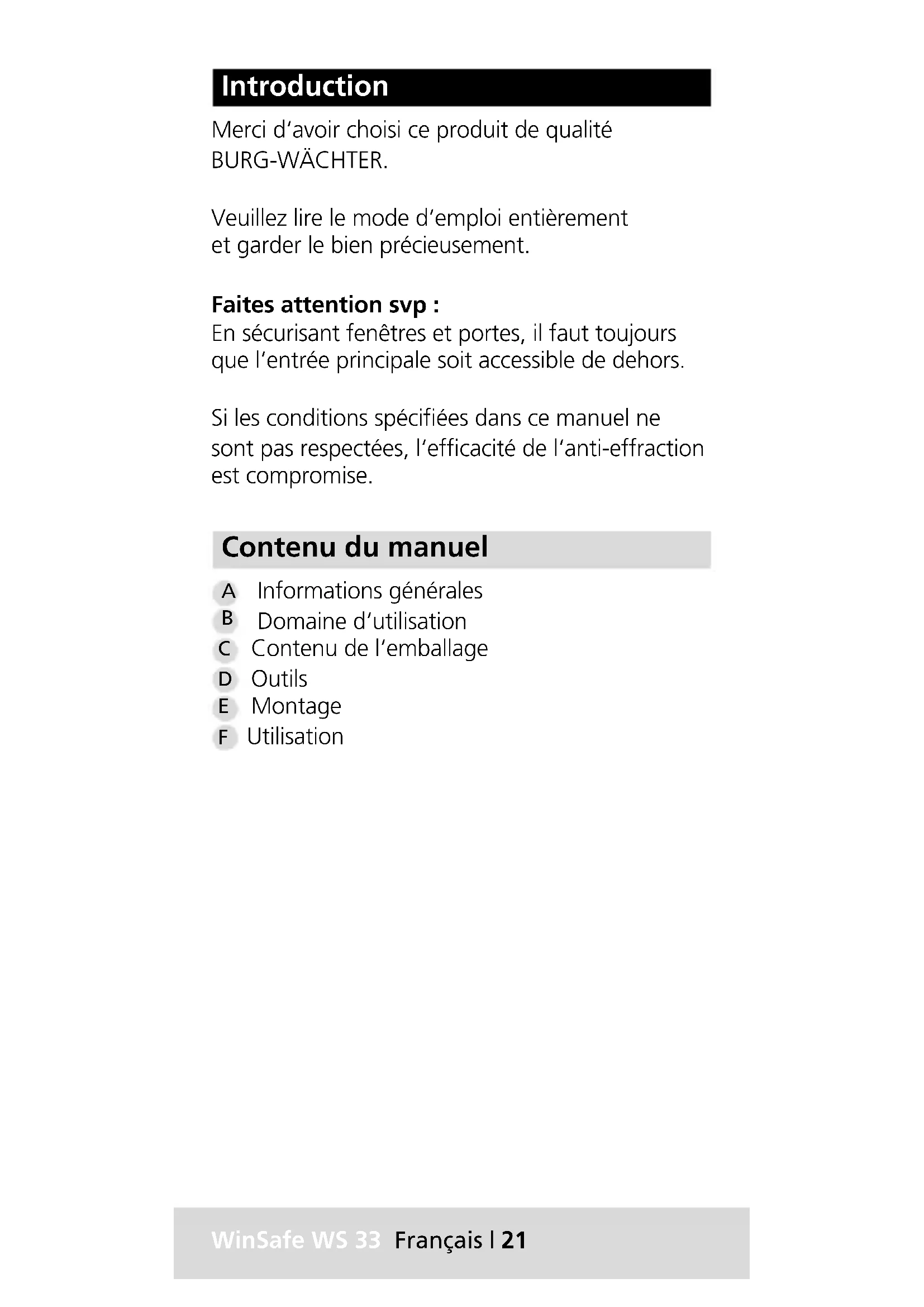 The arrow points to the opened lock: The window protection is unlocked In this position, the window protection can be closed with the slider. By a slight clockwise rotation of the lock cylinder, the window protection can be opened again. The open state is signaled by a red box: Warning! The window protection is open.WinSafe WS 33 Français | 21 Introduction Merci d‘avoir choisi ce produit de qualité BURG-WÄCHTER. Veuillez lire le mode d‘emploi entièrement et garder le bien précieusement. Faites attention svp : En sécurisant fenêtres et portes, il faut toujours que l‘entrée principale soit accessible de dehors. Si les conditions spécifiées dans ce manuel ne sont pas respectées, l‘efficacité de l‘anti-effraction est compromise. Contenu du manuel
