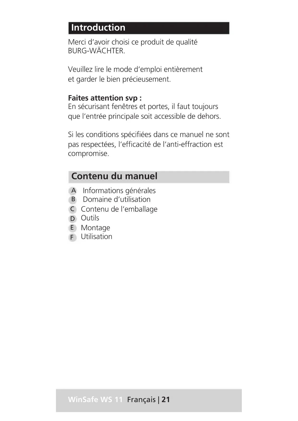 The arrow points to the opened lock: The window protection is unlocked In this position the pivot lever can be easily moved in the latching positions. The window protection is unlocked.WinSafe WS 11 Français | 21 Introduction Merci d‘avoir choisi ce produit de qualité BURG-WÄCHTER. Veuillez lire le mode d‘emploi entièrement et garder le bien précieusement. Faites attention svp : En sécurisant fenêtres et portes, il faut toujours que l‘entrée principale soit accessible de dehors. Si les conditions spéciées dans ce manuel ne sont pas respectées, l‘efcacité de l‘anti-effraction est compromise. Contenu du manuel