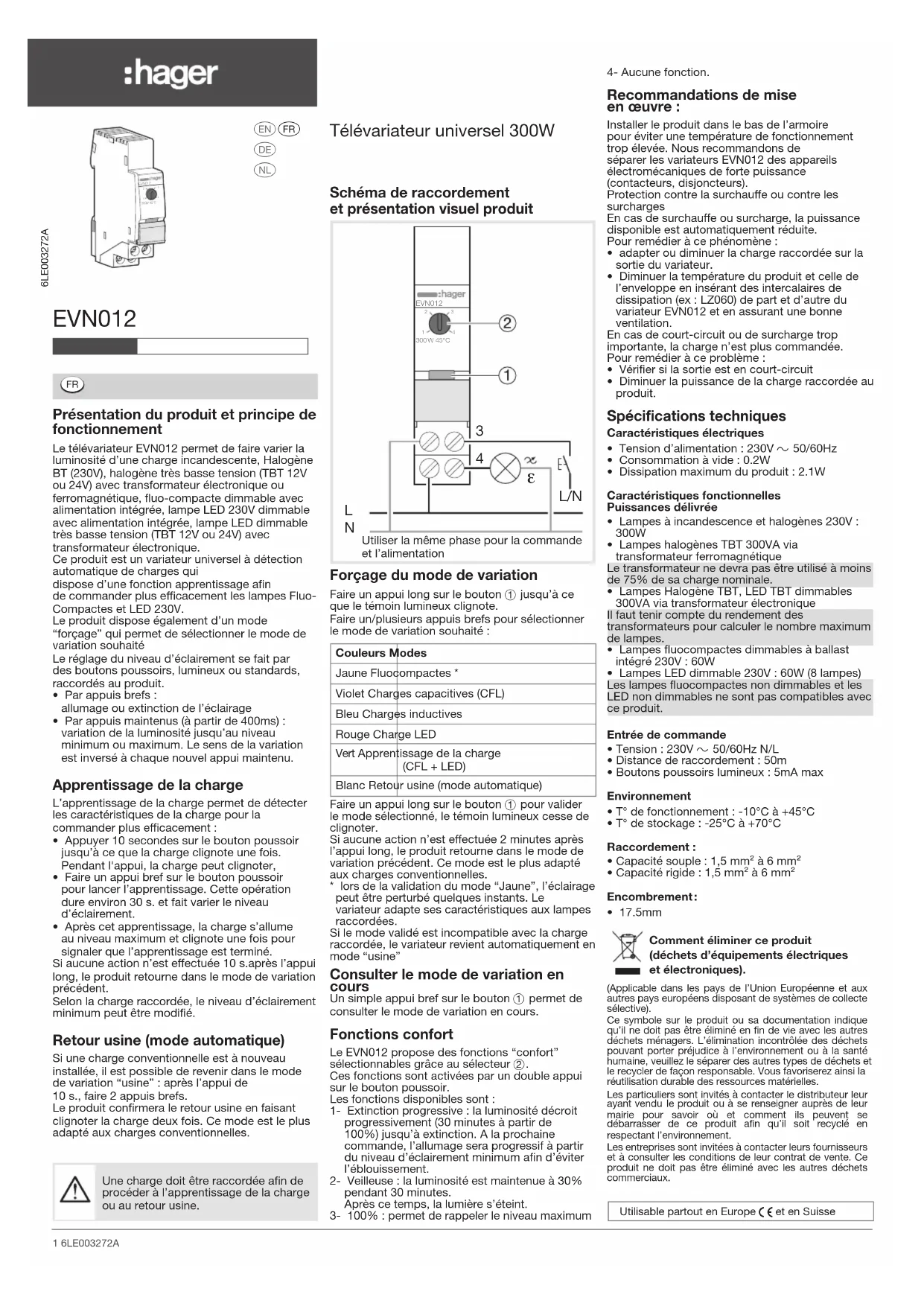 Présentation du produit et principe de fonctionnementLe télévariateur EVN012 permet de faire varier la luminosité d’une charge incandescente, Halogène BT (230V), halogène très basse tension (TBT 12V ou 24V) avec transformateur électronique ou ferromagnétique, fluo-compacte dimmable avec alimentation intégrée, lampe LED 230V dimmable avec alimentation intégrée, lampe LED dimmable très basse tension (TBT 12V ou 24V) avec transformateur électronique. Ce produit est un variateur universel à détection automatique de charges qui dispose d’une fonction apprentissage afin de commander plus ecacement les lampes Fluo-Compactes et LED 230V.Le produit dispose également d’un mode “forçage” qui permet de sélectionner le mode de variation souhaitéLe réglage du niveau d’éclairement se fait par des boutons poussoirs, lumineux ou standards, raccordés au produit.• Par appuis brefs : allumage ou extinction de l’éclairage• Par appuis maintenus (à partir de 400ms) : variation de la luminosité jusqu’au niveau minimum ou maximum. Le sens de la variation est inversé à chaque nouvel appui maintenu.Apprentissage de la chargeL’apprentissage de la charge permet de détecter les caractéristiques de la charge pour la commander plus ecacement :• Appuyer 10 secondes sur le bouton poussoir jusqu’à ce que la charge clignote une fois. Pendant l'appui, la charge peut clignoter,• Faire un appui bref sur le bouton poussoir pour lancer l’apprentissage. Cette opération dure environ 30 s. et fait varier le niveau d’éclairement.• Après cet apprentissage, la charge s’allume au niveau maximum et clignote une fois pour signaler que l’apprentissage est terminé.Si aucune action n’est eectuée 10 s.après l’appui long, le produit retourne dans le mode de variation précédent.Selon la charge raccordée, le niveau d’éclairement minimum peut être modifié.Retour usine (mode automatique)Si une charge conventionnelle est à nouveau installée, il est possible de revenir dans le mode de variation “usine” : après l’appui de 10 s., faire 2 appuis brefs. Le produit confirmera le retour usine en faisant clignoter la charge deux fois. Ce mode est le plus adapté aux charges conventionnelles. Utilisable partout en Europe M et en SuisseFonctions confortLe EVN012 propose des fonctions “confort” sélectionnables grâce au sélecteur 2. Ces fonctions sont activées par un double appui sur le bouton poussoir. Les fonctions disponibles sont :1- Extinction progressive : la luminosité décroit progressivement (30 minutes à partir de 100%) jusqu’à extinction. A la prochaine commande, l’allumage sera progressif à partir du niveau d’éclairement minimum afin d’éviter l’éblouissement.2- Veilleuse : la luminosité est maintenue à 30% pendant 30 minutes. Après ce temps, la lumière s’éteint.3- 100% : permet de rappeler le niveau maximumUtiliser la même phase pour la commande et l’alimentationSchéma de raccordement et présentation visuel produit6LE003272A1 6LE003272A