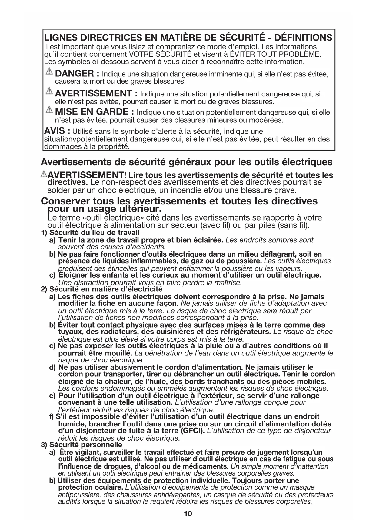ellen’estpasévitée,pourraitcauserlamortoudegravesblessures. MISE EN GARDE : Indiqueunesituationpotentiellementdangereusequi,sielle n’estpasévitée,pourraitcauserdesblessuresmineuresoumodérées. AVIS : Utilisésanslesymboled’alerteàlasécurité,indiqueune situationvpotentiellementdangereusequi,siellen’estpasévitée,peutrésulterendes dommagesàlapropriété.1111 c) Empêcher les démarrages intempestifs. S’assurer que l’interrupteur se trouve à la position d’arrêt avant de relier l’outil à une source d’alimentation et/ou d’insérer un bloc-piles, de ramasser ou de transporter l’outil. Transporter un outil électrique alors que le doigt repose sur l’interrupteur ou brancher un outil électrique dont l’interrupteur est à la position de marche risque de provoquer un accident. d) Retirer toute clé de réglage ou clé standard avant de démarrer l’outil. Une clé standard ou une clé de réglage attachée à une partie pivotante peut causer des blessures. e) Ne pas trop tendre les bras. Conserver son équilibre en tout temps. Cela permet de mieux maîtriser l’outil électrique dans les situations imprévues. f) S’habiller de manière appropriée. Ne pas porter de vêtements amples ni de bijoux. Garder les cheveux, les vêtements et les gants à l’écart des pièces mobiles. Les vêtements amples, les bijoux ou les cheveux longs risquent de rester coincés dans les pièces mobiles. g) Si des composants sont fournis pour le raccordement de dispositifs de dépoussiérage et de ramassage, s’assurer que ceux-ci sont bien raccordés et utilisés. L’utilisation d’un dispositif de dépoussiérage peut réduire les dangers engendrés par les poussières.