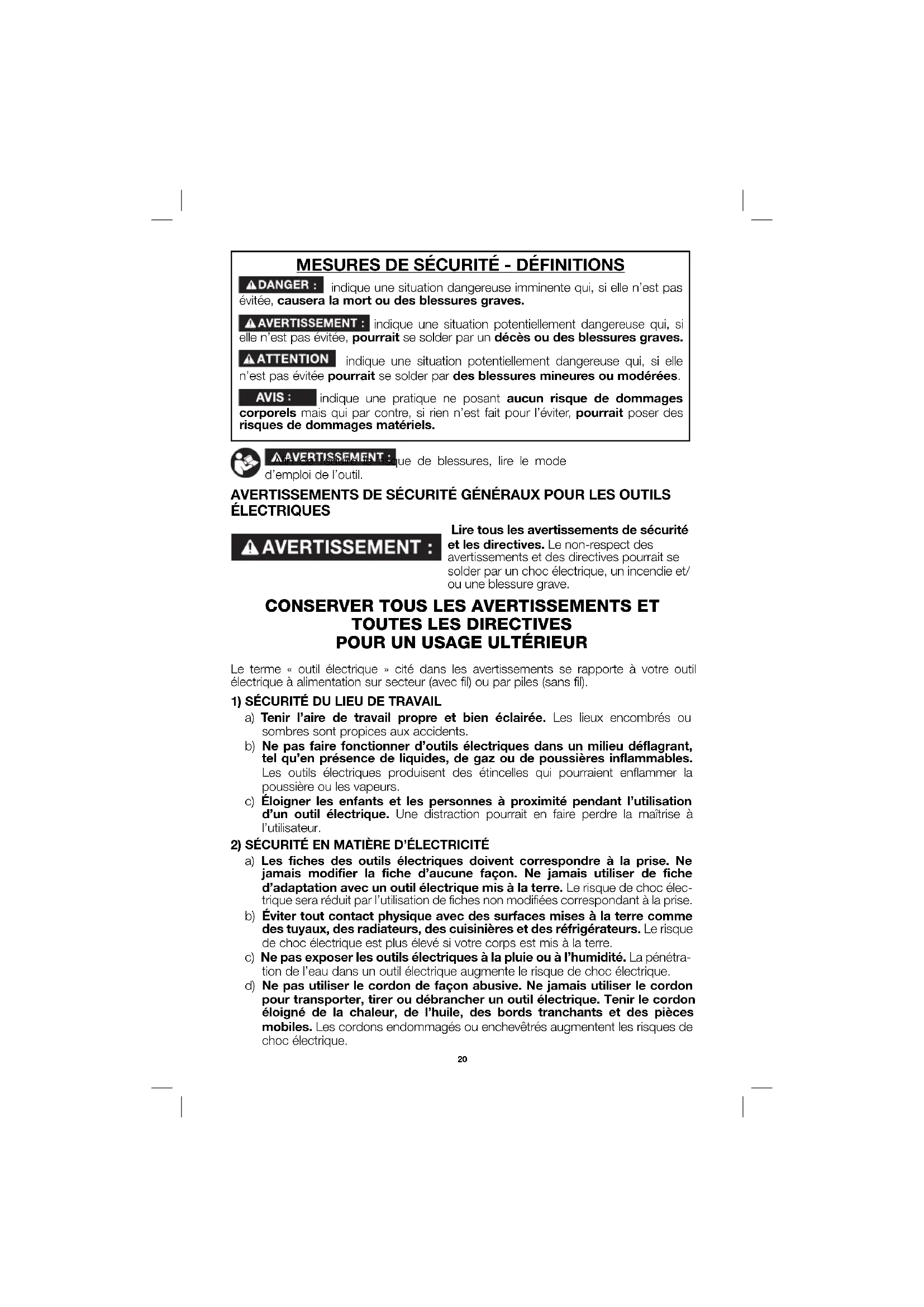 MESURES DE SÉCURITÉ - DÉFINITIONS indique une situation dangereuse imminente qui, si elle n’est pas évitée, causera la mort ou des blessures graves. indique une situation potentiellement dangereuse qui, si elle n’est pas évitée, pourrait se solder par un décès ou des blessures graves. indique une situation potentiellement dangereuse qui, si elle n’est pas évitée pourrait se solder par des blessures mineures ou modérées. indique une pratique ne posant aucun risque de dommages corporels mais qui par contre, si rien n’est fait pour l’éviter, pourrait poser des risques de dommages matériels. Afin de réduire le risque de blessures, lire le mode d’emploi de l’outil. AVERTISSEMENTS DE SÉCURITÉ GÉNÉRAUX POUR LES OUTILS ÉLECTRIQUES Lire tous les avertissements de sécurité et les directives. Le non-respect des avertissements et des directives pourrait se solder par un choc électrique, un incendie et/ ou une blessure grave.