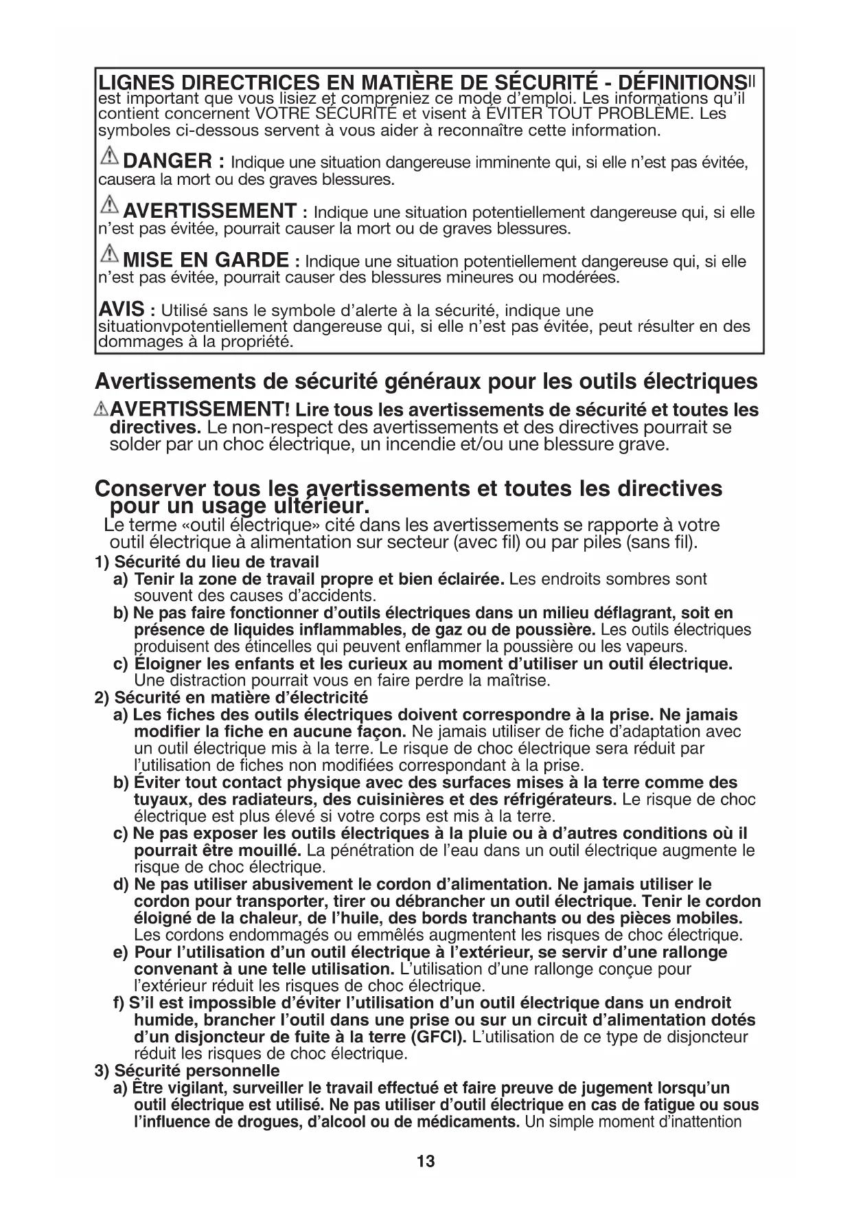 a) Être vigilant, surveiller le travail effectué et faire preuve de jugement lorsqu’un outil électrique est utilisé. Ne pas utiliser d’outil électrique en cas de fatigue ou sous l’influence de drogues, d’alcool ou de médicaments. Un simple moment d’inattention LIGNES DIRECTRICES EN MATIÈRE DE SÉCURITÉ - DÉFINITIONS