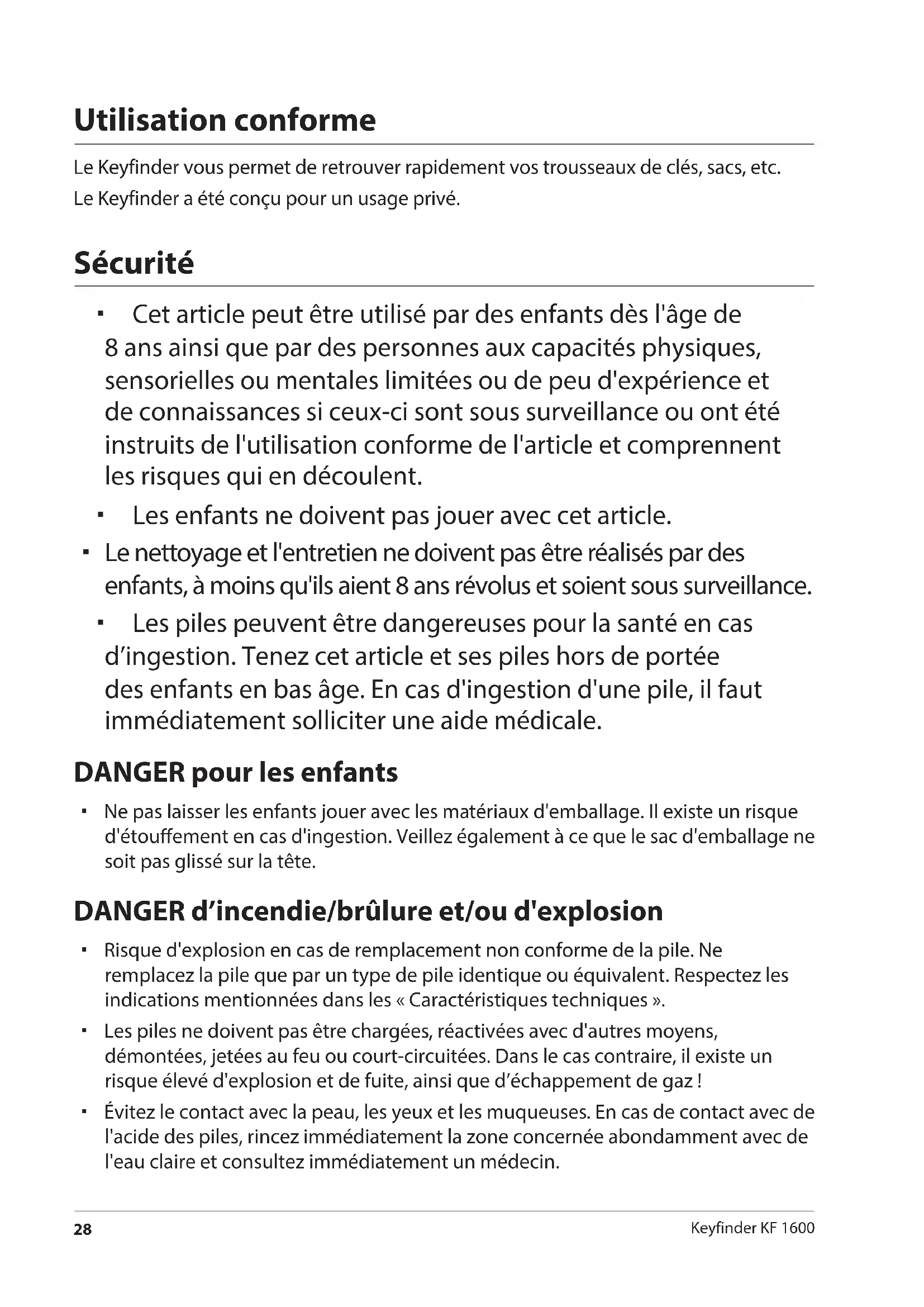 Keyfinder KF 1600 Utilisation conforme Le Keyfinder vous permet de retrouver rapidement vos trousseaux de clés, sacs, etc. Le Keyfinder a été conçu pour un usage privé. Sécurité Cet article peut être utilisé par des enfants dès l'âge de 8ans ainsi que par des personnes aux capacités physiques, sensorielles ou mentales limitées ou de peu d'expérience et de connaissances si ceux-ci sont sous surveillance ou ont été instruits de l'utilisation conforme de l'article et comprennent les risques qui en découlent. Les enfants ne doivent pas jouer avec cet article. Le nettoyage et l'entretien ne doivent pas être réalisés par des enfants, à moins qu'ils aient 8 ans révolus et soient sous surveillance. Les piles peuvent être dangereuses pour la santé en cas d’ingestion. Tenez cet article et ses piles hors de portée des enfants en bas âge. En cas d'ingestion d'une pile, il faut immédiatement solliciter une aide médicale. DANGER pour les enfants Ne pas laisser les enfants jouer avec les matériaux d'emballage. Il existe un risque d'étouement en cas d'ingestion. Veillez également à ce que le sac d'emballage ne soit pas glissé sur la tête. DANGER d’incendie/brûlure et/ou d'explosion Risque d'explosion en cas de remplacement non conforme de la pile. Ne remplacez la pile que par un type de pile identique ou équivalent. Respectez les indications mentionnées dans les «Caractéristiques techniques». Les piles ne doivent pas être chargées, réactivées avec d'autres moyens, démontées, jetées au feu ou court-circuitées. Dans le cas contraire, il existe un risque élevé d'explosion et de fuite, ainsi que d’échappement de gaz! Évitez le contact avec la peau, les yeux et les muqueuses. En cas de contact avec de l'acide des piles, rincez immédiatement la zone concernée abondamment avec de l'eau claire et consultez immédiatement un médecin. Druckbuch Key Finder.indb 28 20.04.2016 14:38:46Sécurité