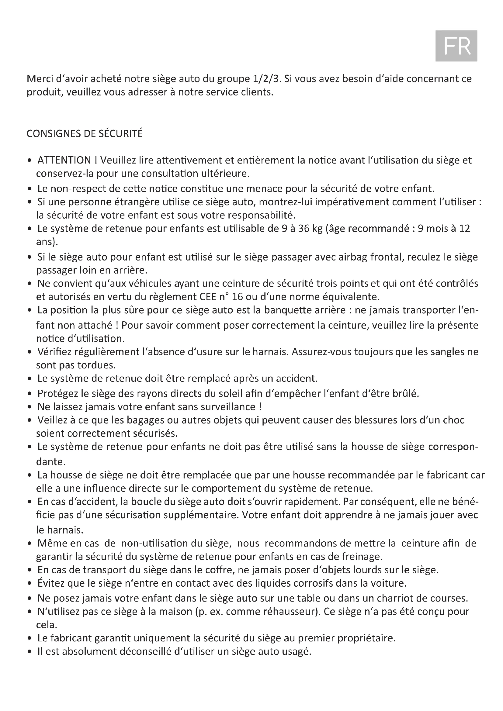 Système universel de retenue : pour les voitures sans Isofi x Le type de ceinture de sécurité homologuée que vous devriez avoir Sangle d‘épaule Sangle de bassin Sangle d‘épaule Sangle de bassin Ne convient qu‘aux véhicules ayant une ceinture trois points et qui ont été cont- rôlés et autorisés en vertu du règlement CEE n° 16 ou d‘une norme équivalente. Ce type de siège enfant est compa ble avec les autres sièges auto. En cas de doutes, veuillez consulter le fabricant ou le vendeur.FR U lisa on pour 9-18 kg (Groupe I, env. de 9 mois à 4 ans) Installez le siège enfant dans le sens de la marche. Étape 1 : Placez le siège enfant sur le siège du véhicule, en vous as- surant qu’il est bien appuyé contre le dossier du siège. Étape 3 : Prudence : Vu de derrière, assurez-vous que la ceinture de sécurité passe sous la ceinture du siè- ge enfant, si elle passe dessus, l’installa on n’est pas correcte. C’est très important. Étape 4 : Assurez-vous que la ceinture de sécurité n’est pas tordue. Véri ez également que la sangle de la ceinture abdominale passe sous les accoudoirs et que la par e diagonale de la sangle de la ceinture passe sous la pince rouge. Serrez bien la ceinture dans la boucle, assurez-vous que vous entendez un « clic », puis a achez la ceinture. Étape 2 : A achez ensemble le cous- sin et le dossier du siège, tel que montré sur l’image. Étape 2 : A achez ensemble le cous-FR U lisa on pour 9-18 kg (Groupe I, env. de 9 mois à 4 ans) Étape 1 : Tel que montré dans l’image ci-des- sus, une main appuie sur le disposi f de réglage du harnais pendant que l’autre libère les bretelles, ensuite, il est possible de libérer les bretelles à leur plus grande longueur. Étape 3 : Asseyez votre bébé dans le siège enfant, replacez les bretelles dans leur posi on origina- le. Réglez bien les bretelles selon la taille des épaules de votre enfant. Fermez l’insert et faites le entrer dans la boucle. Assurez-vous que vous entendez un « clic ». Véri ez ensuite que la ceinture de sécurité n’est pas tordue. Serrez bien la par e de la ceinture sur les épaules, et en n réglez la hauteur de l’appuie-tête, selon la taille de votre enfant. Étape 2 : Tel que montré dans l’image ci-dessus, appuyez sur le bouton rouge pour libérer la bouc- le, puis placez les bretelles de chaque côté des accoudoirs.U lisa on pour 15-36 kg (Groupe II & III, env. de 3 ans à 12 ans) Étape 1 : Placez le siège enfant sur le siège du véhicule, en vous assurant de bien appuyer celui-ci contre le dossier du siège du véhicule. Étape 2 : Asseyez l’enfant dans le siège enfant. Étape 3 : Serrez bien la ceinture de sécurité, en véri ant que a) la sangle de la ceinture abdominale passe sur l’entrejambe de l’enfant ; b) la par e diagonale de la sangle de la ceinture passe au-des- sus des épaules de l’enfant. Assurez-vous que la sangle de la ceinture abdominale passe sous les accoudoirs, puis a achez-la dans la boucle. Étape 4 : Assurez-vous que la ceinture de sécurité n’est pas tordue. Véri ez que les par es diagona- les de la sangle de la ceinture passent par la rainure des accoudoirs. En même temps, les bretelles doivent être réglées à une hauteur, juste au-dessus du cou de votre enfant. Étape 5 : Réglez la hauteur de l’appuie-tête, assurez-vous que le crochet sur l’appuie-tête est à 1 cm au-dessus de l’épaule de votre enfant. Étape 6 : Serrez bien la ceinture de sécurité vers le haut, véri ez que le siège est bien installé. Prudence: Assurez-vous que la ceinture de sécurité n’est pas tordue. Véri ez également que le capot est correctement installé et qu’il est bien adapté à la ceinture de sécurité. FRSystème universel de retenue : pour les voitures avec Isofi x Sangle d‘épaule Iso x Top-tether ajustage Sangle de bassin Ne convient qu‘aux véhicules ayant une ceinture trois points et qui ont été cont- rôlés et autorisés en vertu du règlement CEE n° 16 ou d‘une norme équivalente. Ce type de siège enfant est compa ble avec les autres sièges auto. En cas de doutes, veuillez consulter le fabricant ou le vendeur. FRU lisa on pour 9-18 kg (Groupe I, env. de 9 mois à 4 ans) Étape 1 : Placez la rainure de guidage iso x en posi on dans les points d’ancrage Iso x. Étape 2 : Faites tourner les connecteurs iso x vers l’extérieur jusqu’à ce que vous entendiez un « clic ». Véri ez que les connecteurs iso x se déplacent dans un angle de 15° et ne peuvent se retourner. Étape 3 : Ensuite, re rez le revêtement en plas que noir des connecteurs iso x, a n de placer ceux-ci dans la fenêtre rouge. La couleur rouge signi e que les connecteurs iso x sont débloqués. Poussez la base iso x vers les points xes, assurez-vous que la base iso x est enclenchée sur les points xes. Véri ez que le connecteur iso x est en fenêtre verte. Installez le siège enfant dans le sens de la marche. Étape 3 : Ensuite, re rez le revêtement en plas que noir des connecteurs iso x, a n de placer ceux-ci dans la fenêtre rouge. La couleur rouge signi e que les connecteurs iso x sont débloqués. Poussez la base iso x vers les points xes, assurez-vous que la base iso x est enclenchée sur les points xes. Véri ez que le connecteur iso x est en fenêtre verte. Fermé: Vert Points d‘ancrage Iso x Ouvert: Rouge FRÉtape 4 : Ouvrez le capot du connecteur de verrouillage, laissez le crochet d’ancrage supérieur bloquer les points d’ancrage de verrouillage et assurez-vous qu’il est bien serré (Les points d’ancrage de verrouillage sont légèrement di érents selon les voitu- res, veuillez lire a en vement le manuel de la voiture). PRUDENCE : Assurez-vous que la ceinture de sécurité n’est pas tordue. Étape 5 : Serrez le plus possible les ceintures et véri ez que le connecteur de verrouillage apparait en fenêtre verte. Ainsi, le siège enfant est bien appuyé contre le dossier du sièg