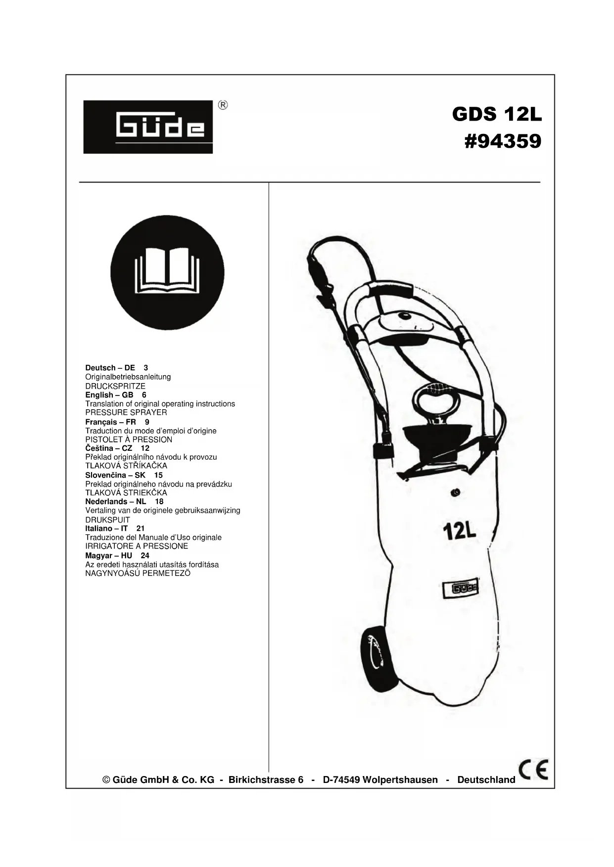 Poids Déclaration de conformité CE Nous, Güde GmbH & Co. KG Birkichstraße 6 74549 Wolpertshausen Allemagne Déclarons par la présente que les appareils indiqués ci-dessous répondent du point de vue de leur conception, construction ainsi que de leur réalisation mise sur le marché, aux exigences fondamentales correspondantes des directives de la CE en matière de sécurité et d’hygiène. Cette déclaration perd sa validité après une modification de l’appareil sans notre approbation préalable. 10Désignation de l’appareil: pistolet à pression GDS 12L N° de commande: #94359 Date/Signature du fabricant: 28.10.2010