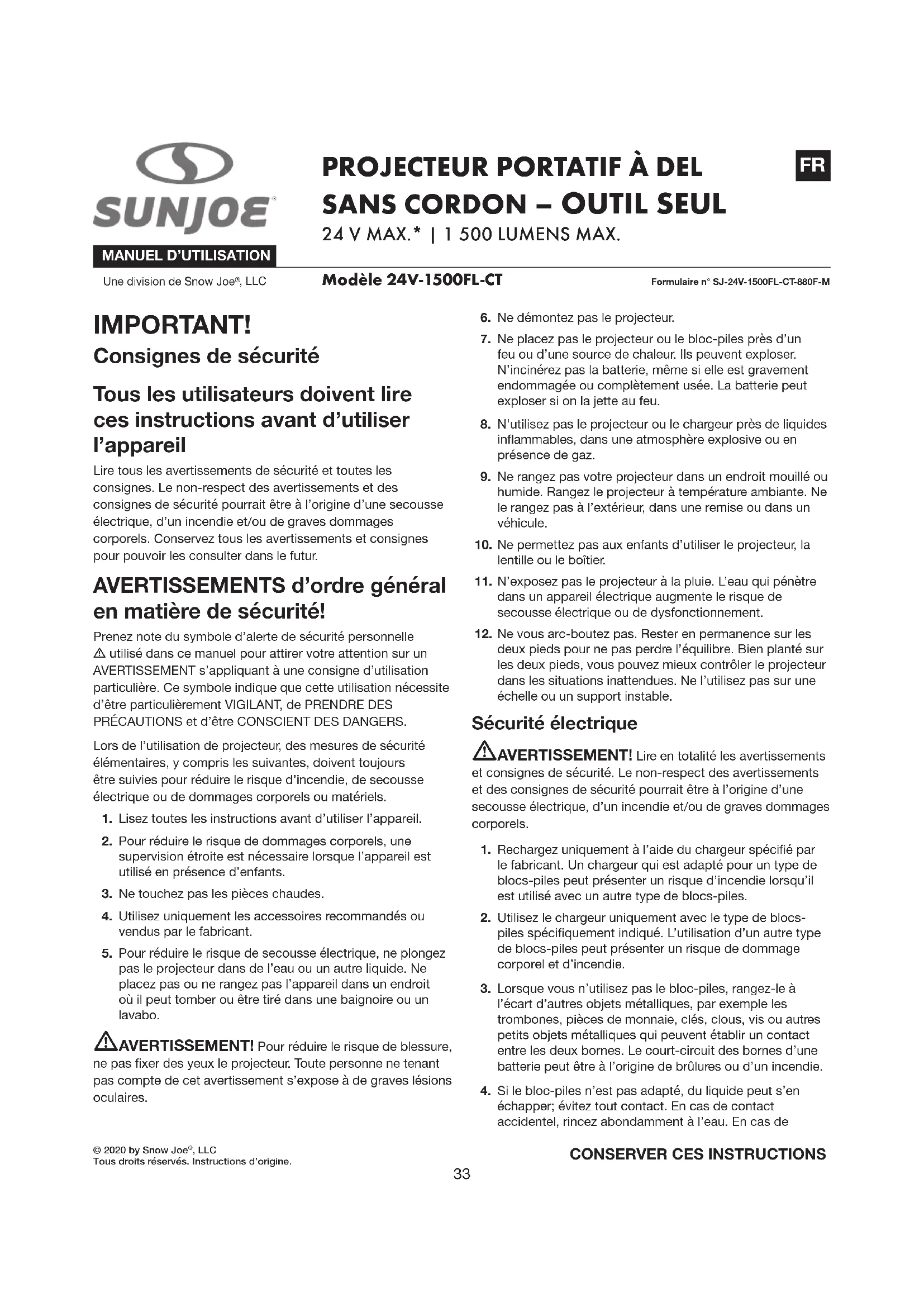 MODE D'EMPLOI 24V1500FLCT Sun Joe