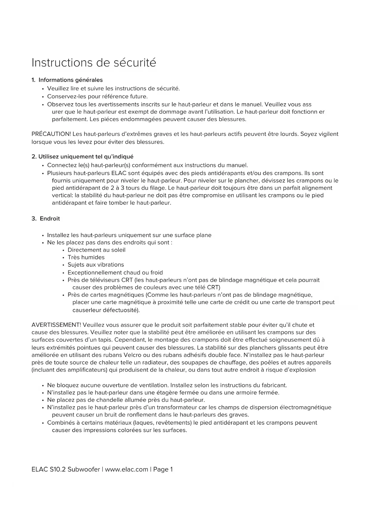 Ce haut-parleur des graves est uniquement conçu pour être connecté à aux tensions indiquées à l’arrière du panneau ou de l’enceinte. Une connexion à toute autre tension peut causer des dommages irréversibles au haut-parleur des graves et il annulera la garantie. L’utilisation d’adaptateur de fiche n’est pas recommandée car ils peuvent permettre des tensions autres que celle imprimées à l’arrière de ce haut-parleur des graves. ELAC S10.2 Subwoofer | www.elac.com | Page 2Philosophie Merci d’avoir acheté ce produit ELAC. Depuis ses débuts (1926), ELAC a toujours aspiré à la meilleure qualité. Vos nouveaux haut-parleurs ELAC sont construits selon les plus hautes normes de l’industrie en utilisant les composantes de la plus grande qualité, soigneusement fabriqués pour produire un son de qualité supérieure. Ils sont développés par un groupe d’individus passionnés voués à vous orir un niveau de son de qualité supérieure à la maison. Bonne écoute! Avant d’utiliser Évitez les dommages aux haut-parleurs et aux autres composantes :