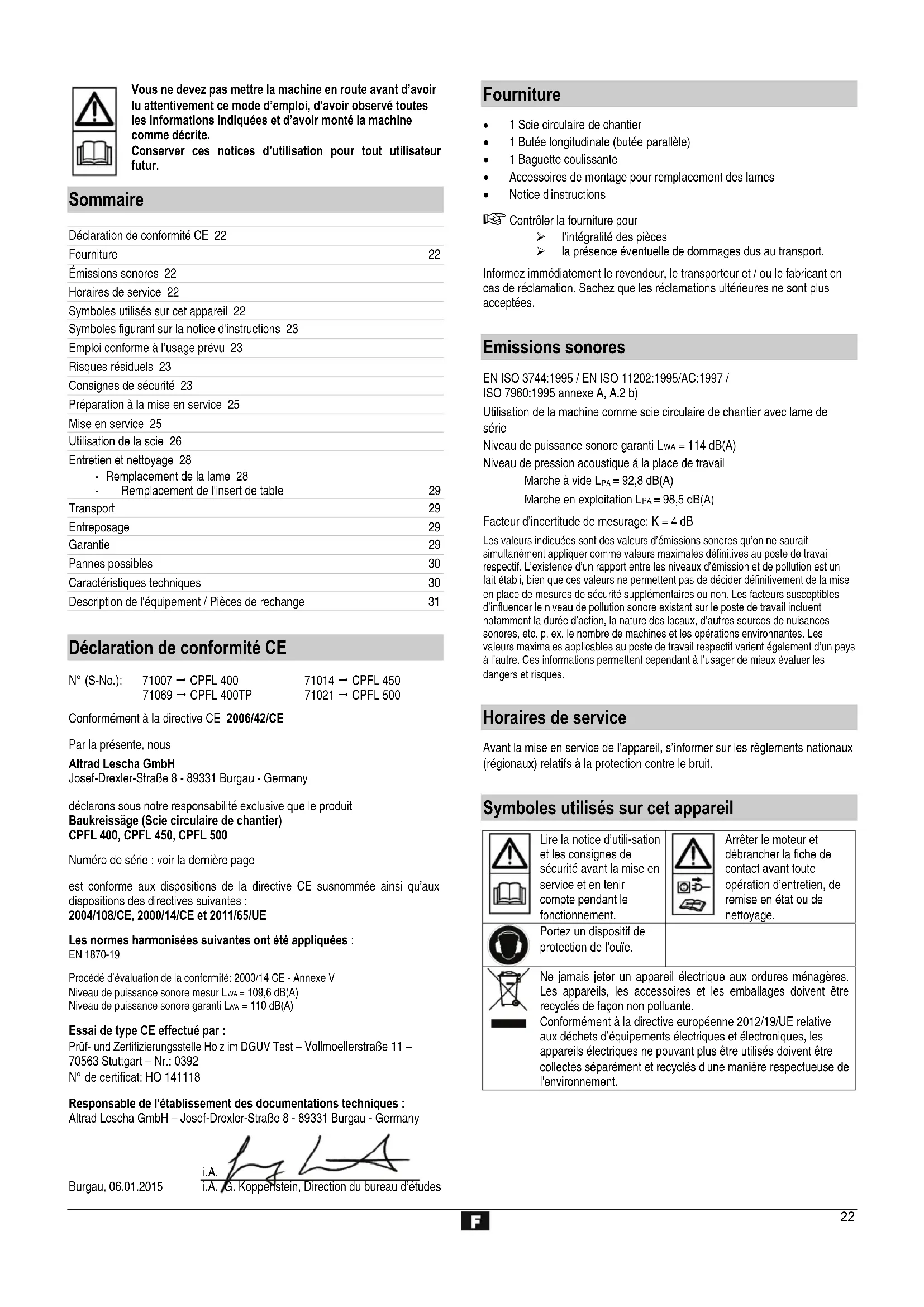 Emploi conforme à l’usage prévu La scie circulaire de chantier doit exclusivement être utilisée pour la découpe longitudinale et transversale de bois massif et de panneaux de fibres, de panneaux lattés et de panneaux de fibres de moyenne densité, à section carré ou rectangulaire d'une épaisseur/hauteur de 150 mm max., à l'extérieur de locaux fermés, en utilisant des lames en carbure selon EN 847-1. L'épaisseur du bois ne doit pas être supérieure aux valeurs suivantes : CPFL 400: 126 mm CPFL 450: 150 mm CPFL 500: 175 mm Le diamètre des lames doit se situer entre les valeurs suivantes : CPFL 400: 395 – 400 mm CPFL 450: 445 – 450 mm CPFL 500: 495 – 500 mm Les coupes transversales doivent uniquement être réalisées à l’aide de la butée transversale. Traiter uniquement des pièces pouvant être posées sur la machine en toute sécurité. Ne pas utiliser des lames en acier HSS (alliages d'acier à coupe rapide), étant donné que ce type d'acier est dur et cassant. Risque de blessures par la casse de la lame et les projections des débris de celle-ci. Font également partie de l’emploi conforme le respect des conditions de service, de maintenance et d’entretien prescrites par le fabricant et le respect des avis de sécurité contenus dans l’instruction. Les prescriptions de prévention des accidents applicables au site d’exploitation ainsi que les dispositions de médecine du travail et de sécurité technique générales sont à respecter. Tout emploi autre que celui défini est considéré comme non conforme. Le fabricant ne portera aucune responsabilité pour tous les dommages, de quelle nature qu’ils soient, résultant d’un emploi non conforme: l’utilisateur en portera tous les risques et périls. Le fabricant décline également toute responsabilité pour les trans- formations effectuées par l’usager de son propre chef comme pour les dommages en résultant. L'appareil ne doit être utilisé, entretenu et ajusté que par des personnes connaissant l'appareil et averties des risques qui y sont liés. Les travaux d’entretien doivent être uniquement effectués par nous ou par le service après-vente que nous avons désigné. La machine ne doit pas être utilisée en présence d'atmosphères explosibles. Retirer impérativement les pièces métalliques (clous, etc.) du bois à scier.