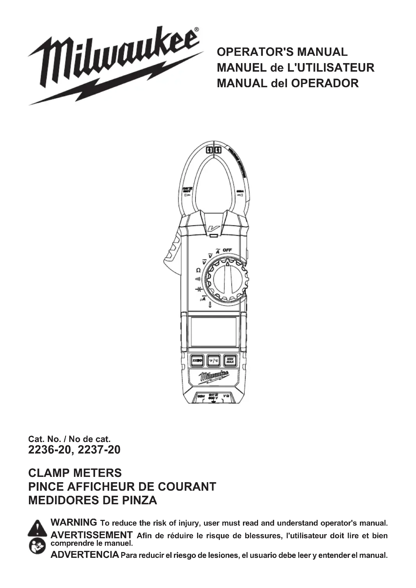 TOUTES LES INSTRUCTIONS. Ne pas suivre l’ensemble des avertissements et des instructions peut entraîner une électrocution, un incendie ou des blessures graves, en plus d’endommager le testeur et l’équipement testé. Conserver ces instructions – Ce manuel contient des instructions importantes de sécurité et de fonctionnement pour la pince afcheur de cou- rant MILWAUKEE. Avant d’employer l’instrument, lire le présent manuel d’utilisation ainsi que toutes les étiquettes se trouvant sur la pince afcheur de courant. DANGER Ne jamais prendre une mesure sur un circuit dont la tension est supérieure à 600 V c.a. Utiliser uniquement des ls qui résistent à une tension d’au moins 600 V. Ne pas tenter de prendre une mesure en présence de gaz inammables. L’utilisation de l’instrument peut causer des étincelles, ce qui peut entraîner une explosion. Les extrémités de type « mâchoires » du trans- formateur sont conçues pour empêcher les courts-circuits en cours d’essai. Si l’équipement mis à l’essai comporte des pièces conductrices à découvert, il est nécessaire de prendre des précautions supplémentaires pour minimiser la possibilité d’un court-circuit. Ne jamais tenter d’utiliser l’instrument si sa sur- face est mouillée ou si vos mains le sont. Ne pas excéder l’alimentation maximale permise de toute plage de mesure. Effectuer des essais uniquement sur des circuits hors tension, à moins qu’il soit absolument néces- saire de procéder autrement. Vérier d’abord le fonctionnement de l’outil sur un circuit connu. Ne jamais tenir pour acquis que l’outil fonctionne. Présumer que les circuits sont sous tension jusqu’à ce qu’il soit conrmé qu’ils sont hors tension. Ne pas mettre l’instrument à la terre au moment de prendre une mesure. Éviter tout contact avec des surfaces mises à la terre comme des tuyaux, des radiateurs, des cuisinières et des réfrigérateurs. Ne jamais ouvrir le couvercle des piles au moment de prendre une mesure. L’instrument doit être utilisé uniquement pour les applications et les conditions pour lesquelles il a été conçu. Autrement, les fonctions de sécurité de l’instrument failliront et des dommages à l’outil ain- si que des blessures graves peuvent en découler. Pour réduire le risque de blessures découlant d’une décharge ou de l’explosion d’un arc électrique, porter de l’équipement de protection individuel au moment de travailler dans un endroit renfermant des conducteurs sous tension et non protégés. AVERTISSEMENT Ne jamais tenter de prendre une mesure dans des conditions anormales par exemple, si le boîtier de l’instrument est cassé et que des pièces métal- liques sont exposées. Ne pas tourner le cadran rotatif si les ls d’essai sont branchés. S’assurer du bon fonctionnement de l’instrument sur une source d’alimentation connue avant de l’utiliser ou d’agir en se fondant sur ce qu’il indique. N’installer aucune pièce de remplacement sur l’instrument et ne le modier sous aucun pré- texte. Pour procéder à une réparation ou à un ré étalonnage, coner l’outil à un bureau d’entretien en usine ou de soutien des ventes, ou à un poste d’entretien agréé. Ne pas tenter de remplacer les piles si la surface de l’instrument est mouillée. Débrancher tous les cordons et les câbles de l’objet mis à l’essai et éteindre l’instrument avant d’ouvrir le couvercle du compartiment des piles pour procéder à leur remplacement. Cet outil fonctionne avec deux piles AA qui doi- vent être installées correctement dans la pince afcheur de courant MILWAUKEE. Ne pas tenter d’utiliser le produit à une autre tension ou avec un autre type d’alimentation. Installer les piles en respectant la polarité (+ et –) indiquée. Ne pas laisser les piles à la portée des enfants. Ne pas mélanger des piles neuves et usées. Ne pas mélanger des piles de marques différentes (ou des piles de même marque, mais de types différents). Se débarrasser convenablement des piles usées. Ne pas brûler ou démonter les piles. Éviter tout contact avec le liquide pouvant être éjecté d’une pile en cas de manutention abusive. En cas de contact accidentel, rincer abondamment avec de l’eau. Si le liquide entre en contact avec les yeux, consulter un médecin. L’électrolyte qui s’échappe de la pile peut causer des démangeai- sons ou des brûlures. ATTENTION Régler le cadran à une position appropriée avant de commencer à mesurer. Insérer fermement les ls d’essai. Débrancher les ls d’essai de l’instrument pour obtenir la mesure réelle. Ne pas exposer directement l’instrument au so- leil, à des températures élevées, à l’humidité ou à la rosée. Conçu pour une altitude de 2 000 m ou moins. Convient pour des températures de -10°C à 50°C. Garder l’instrument à l’écart de l’excédent de poussière et d’eau. S’assurer d’éteindre l’instrument après l’utilisation. Lorsque l’instrument n’est pas utilisé pendant une longue période, l’entreposer après avoir retiré les piles. Utiliser un chiffon trempé dans l’eau ou du dé- tergent neutre pour nettoyer l’instrument. Ne pas utiliser de nettoyeurs abrasifs ou de solvants.9 DESCRIPTION FONCTIONNELLE No de Cat. 2237-20No de Cat. 2236-20