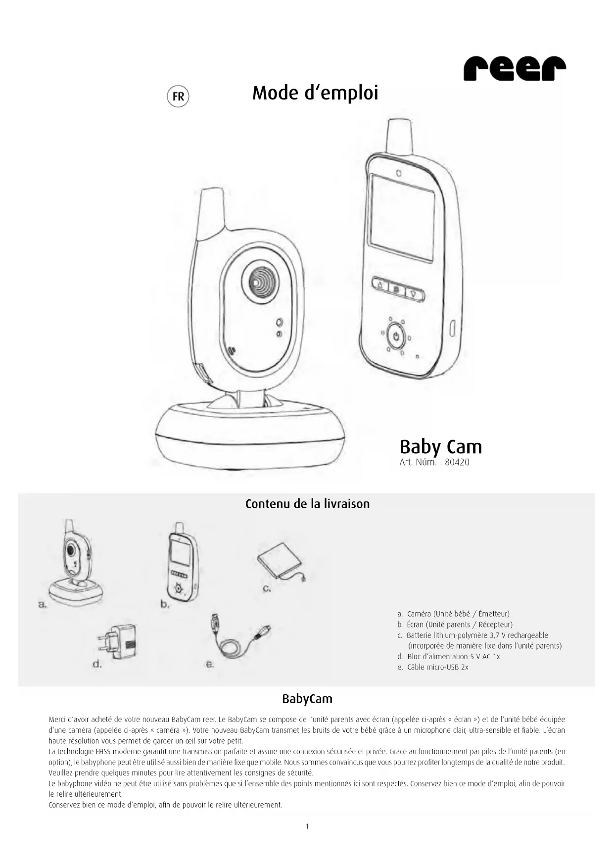 - Reubique la cámara y la pantalla 5Garantía Conserve el justificante de compra, el manual de instrucciones y el número de artículo. Las reclamaciones de garantía o por compromisos de garantía deben tramitarse exclusivamente a través del distribuidor.Todos los datos técnicos, la información y las propiedades del producto descritos en este manual han sido editadas al mejor saber y entender, y corresponden al estado del mismo en el momento de la publica- ción. La información puesta a disposición por reer es correcta y fiable. Sin embargo, la empresa reer no asume, ninguna responsabilidad de posibles errores de este documento y se reserva el derecho a realizar modificaciones sin previo aviso del diseño del producto o de las especificaciones. Cualquier reproducción y transmisión de la información de esta obra, protegida por la Ley de propiedad intelectual, en cualquier método o modo, gráfica, electrónica o mecánica, por fotocopias, grabación en cinta o grabación en un sistema de consulta de datos (también la parcial) precisa la autorización por escrito de la empresa reer. Indicaciones sobre la protección medioambiental Ese producto no debe ser desechado en la basura doméstica cuando haya concluido su vida útil, sino que debe ser entregado en un punto de recogida encar- gado del reciclaje de dispositivos eléctricos. El símbolo en el producto, en las instrucciones de uso o en el embalaje lo indica claramente. El símbolo en el pro- ducto, en las instrucciones de uso o en el embalaje lo indica claramente. Reutilizando los dispositivos, reciclando sus materiales o con otras formas de utilizaci- ón de dispositivos usados contribuye a proteger el medio ambiente. Consulte en su ayuntamiento dónde está el organismo de eliminación de residuos respectivo. reer GmbH Muehlstr. 41 • 71229 Leonberg • Germany www.reer.de Funcionamiento permitido en los siguientes países: DE, CH, AT, IT, FR, BE, NL, ES, LU, GR, HU, CZ, SI, PL, CY, DK, FI, IS, LI, LT, NO, RO, SE, SK, TR Por la presente, reer GmbH declara que el tipo de sistema radioeléctrico Video Babyphone (n.º de art. 80420) cumple la Directiva 2014/53/UE. El texto completo de la declaración de conformidad de la UE está disponible en la siguiente dirección de Internet: http://www.reer.de Rev. 014919 6Mode d‘emploi Baby Cam Art. Núm. : 80420 Contenu de la livraison a. Caméra (Unité bébé / Émetteur) b. Écran (Unité parents / Récepteur) c. Batterie lithium-polymère 3,7 V rechargeable (incorporée de manière fixe dans l‘unité parents) d. Bloc d‘alimentation 5 V AC 1x e. Câble micro-USB 2x BabyCam Merci d‘avoir acheté de votre nouveau BabyCam reer. Le BabyCam se compose de l‘unité parents avec écran (appelée ci-après « écran ») et de l‘unité bébé équipée d‘une caméra (appelée ci-après « caméra »). Votre nouveau BabyCam transmet les bruits de votre bébé grâce à un microphone clair, ultra-sensible et fiable. L‘écran haute résolution vous permet de garder un œil sur votre petit. La technologie FHSS moderne garantit une transmission parfaite et assure une connexion sécurisée et privée. Grâce au fonctionnement par piles de l‘unité parents (en option), le babyphone peut être utilisé aussi bien de manière fixe que mobile. Nous sommes convaincus que vous pourrez profiter longtemps de la qualité de notre produit. Veuillez prendre quelques minutes pour lire attentivement les consignes de sécurité. Le babyphone vidéo ne peut être utilisé sans problèmes que si l‘ensemble des points mentionnés ici sont respectés. Conservez bien ce mode d‘emploi, afin de pouvoir le relire ultérieurement. Conservez bien ce mode d‘emploi, afin de pouvoir le relire ultérieurement. 1Technologie FHSS numérique avec modulation par déplacement de fréquence (MDF) Fréquence 2,4 GHz Émetteur caméra unité bébé Alimentation électrique Récepteur écran unité parents Alimentation électrique par bloc d‘alimentation ou en option avec batterie lithium-polymère 3.7 V 1600 mAh/rechargeable (incorporée de manière fixe dans l‘unité parents) Input 100 – 240 V / 50 Hz / 0.15 A max. Output 5 V / 600 mA max. Puissance de l‘émetteur TX: 17 dBm / RX: 17dBm Champ de vision de la lentille 50° Portée Jusqu‘à 300 m Longueur de câble 1,50 m Température de fonctionnement 0°C – +50°C Durée maximale de la batterie unité parents (écran ; en veille) 14 heures maximum Données techniques Consignes générales de sécurité ! Avant chaque utilisation, contrôlez que l‘appareil n‘a pas de défaut apparent. Si vous constatez un défaut, cet appareil ne doit pas être utilisé. ! N‘utilisez que le chargeur et l‘adaptateur fournis avec l‘appareil. Assurez-vous que la tension de la prise de courant correspond à celle de l‘adaptateur. Contrôlez, surtout en voyage à l‘étranger, que la tension locale corresponde à celle de l‘appareil ou de l‘adaptateur. ! Les appareils et adaptateurs ne doivent pas être ouverts, car il y a risque de décharge électrique. Si l‘appareil est défectueux, n‘essayez PAS de résoudre le problème vous-même. Dans ce cas, veuillez vous adresser à votre commerçant. ! Évitez de toucher les piles ou les contacts électriques de l‘appareil avec des objets métalliques. ! Cet article n‘est pas un jouet! Ne laissez pas les enfants jouer avec cet appareil. ATTENTION! Ce babyphone a été conçu exclusivement comme moyen pour la surveillance de votre nourrisson. Il ne peut remplacer l‘obligation de surveillance des parents et ne peut pas être considéré comme un dispositif médical! Consignes de sécurité concernant l‘installation ! Placez le babyphone hors de portée de l‘enfant (distance minimum d‘un mètre). ! Ne placez jamais le babyphone dans le berceau, le lit de l‘enfant ou dans son parc. ! Afin d‘éviter que l‘enfant ne s‘étrangle, assurez le câble hors de sa portée. N‘utilisez pas de rallo