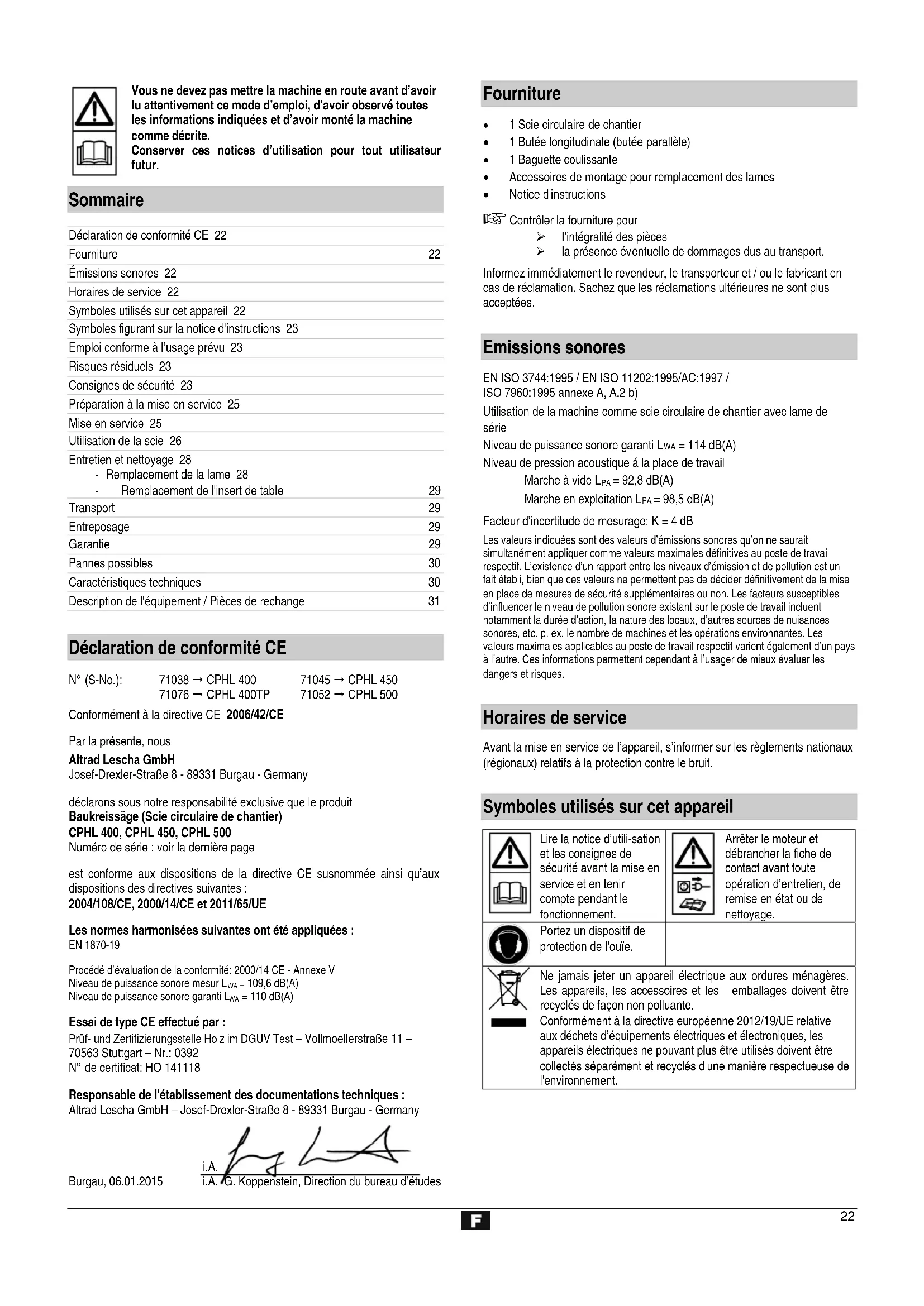 Numéro de série : voir la dernière page est conforme aux dispositions de la directive CE susnommée ainsi qu’aux dispositions des directives suivantes : 2004/108/CE, 2000/14/CE et 2011/65/UE Les normes harmonisées suivantes ont été appliquées : EN 1870-19 Procédé d’évaluation de la conformité: 2000/14 CE - Annexe V Niveau de puissance sonore mesur L = 109,6 dB(A) Niveau de puissance sonore garanti L = 110 dB(A) Essai de type CE effectué par : Prüf- und Zertifizierungsstelle Holz im DGUV Test – Vollmoellerstraße 11 – 70563 Stuttgart – Nr.: 0392 N° de certificat: HO 141118 Responsable de l'établissement des documentations techniques : Altrad Lescha GmbH – Josef-Drexler-Straße 8 - 89331 Burgau - Germany