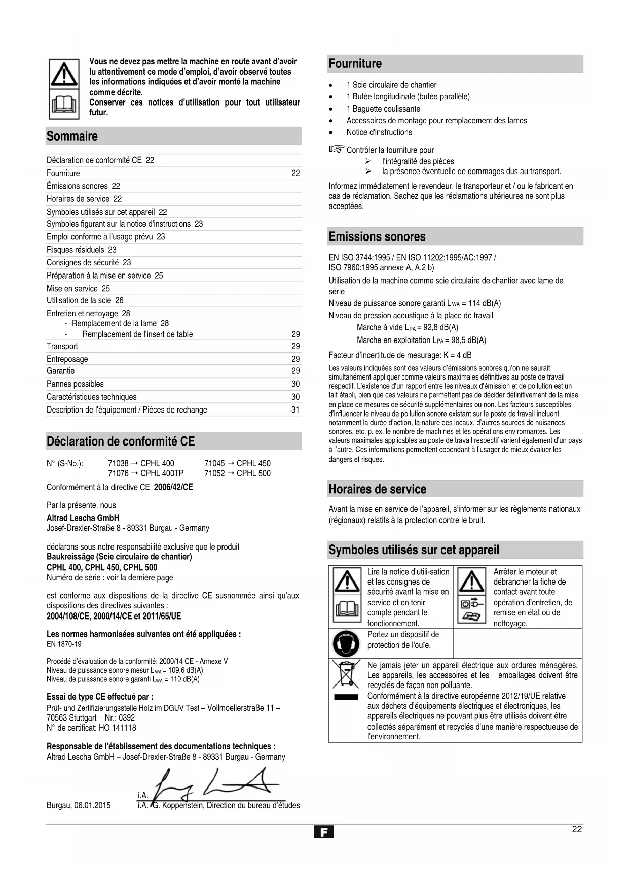 Numéro de série : voir la dernière page est conforme aux dispositions de la directive CE susnommée ainsi qu’aux dispositions des directives suivantes : 2004/108/CE, 2000/14/CE et 2011/65/UE Les normes harmonisées suivantes ont été appliquées : EN 1870-19 Procédé d’évaluation de la conformité: 2000/14 CE - Annexe V Niveau de puissance sonore mesur L = 109,6 dB(A) Niveau de puissance sonore garanti L = 110 dB(A) Essai de type CE effectué par : Prüf- und Zertifizierungsstelle Holz im DGUV Test – Vollmoellerstraße 11 – 70563 Stuttgart – Nr.: 0392 N° de certificat: HO 141118 Responsable de l'établissement des documentations techniques : Altrad Lescha GmbH – Josef-Drexler-Straße 8 - 89331 Burgau - Germany