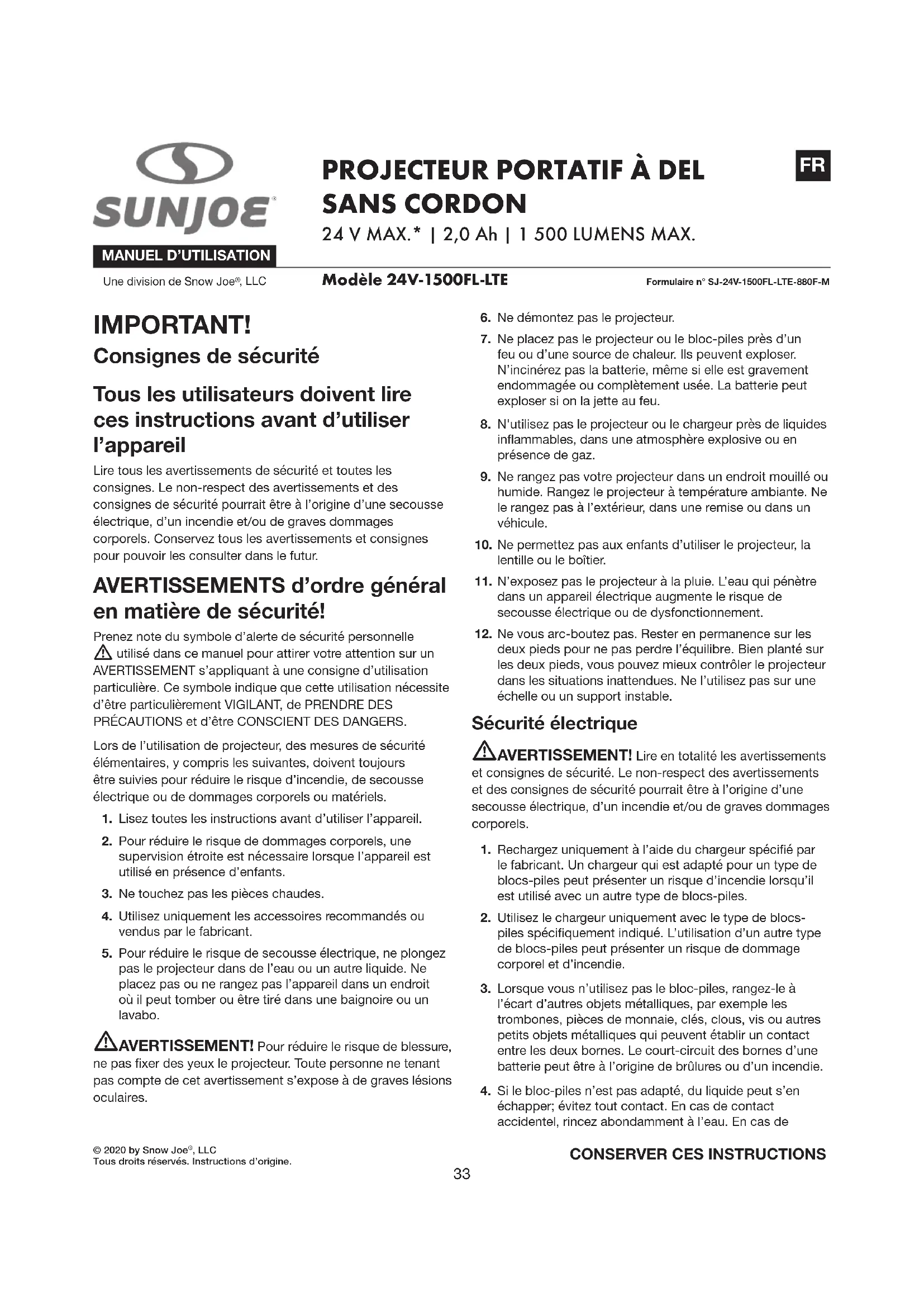 MODE D'EMPLOI 24V1500FLLTE Sun Joe