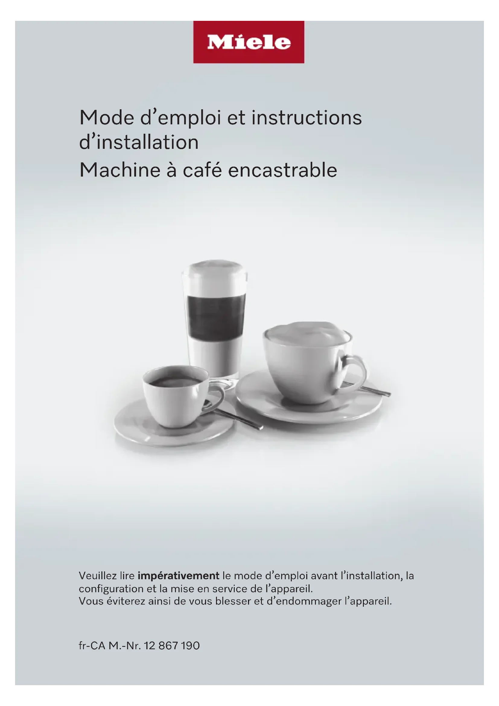 Mode d’emploi et instructions d’installation Machine à café encastrable Veuillez lire impérativement le mode d’emploi avant l’installation, la configuration et la mise en service de l’appareil. Vous éviterez ainsi de vous blesser et d’endommager l’appareil. fr-CA M.-Nr. 12 867 190Table des matières