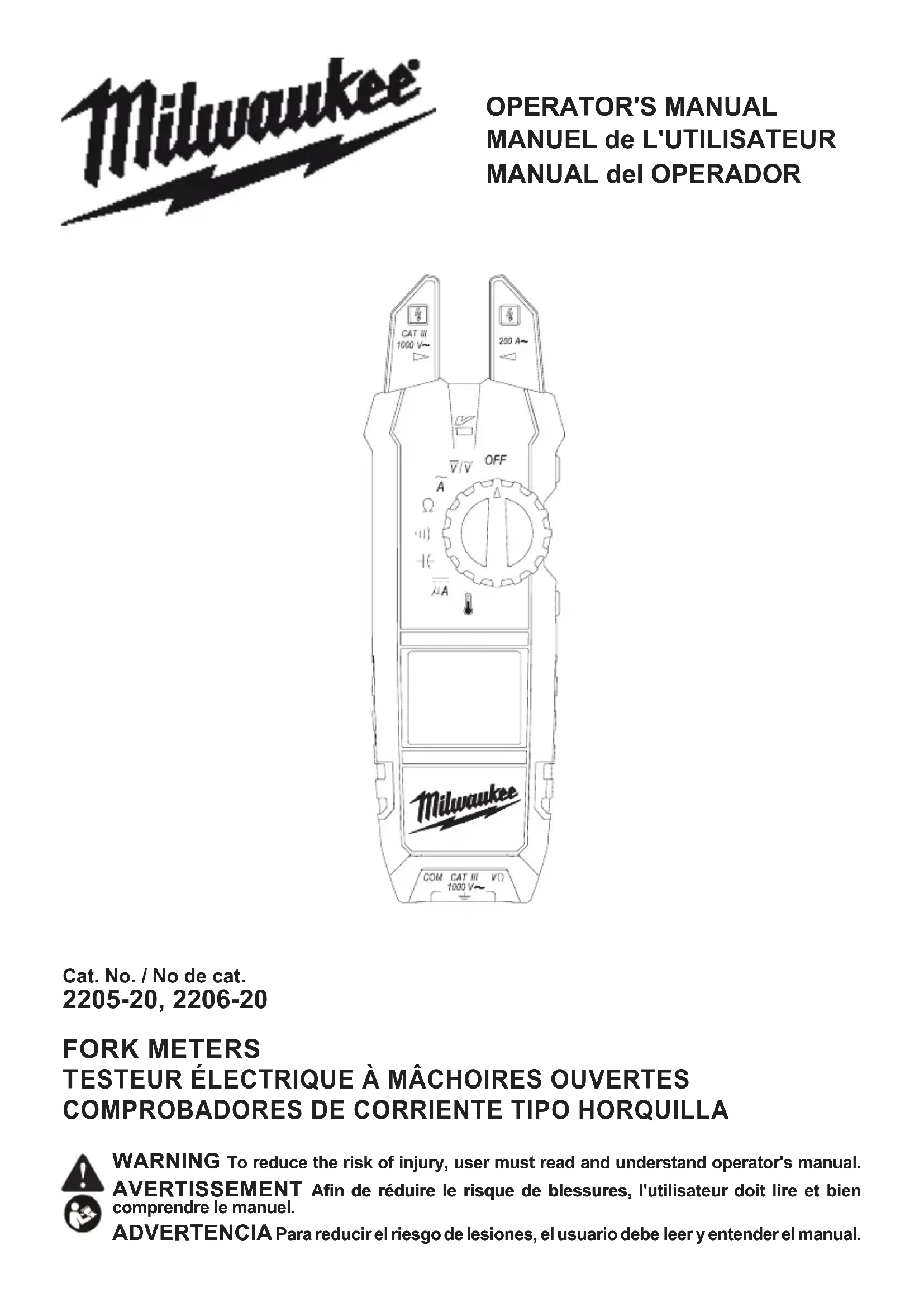 LES INSTRUCTIONS. Ne pas suivre l’ensemble des avertissements et des instructions peut entraîner une électrocution, un incendie ou des blessures graves, en plus d’endommager le testeur et l’équipement testé. Conserver ces instructions – Ce manuel con- tient des instructions importantes de sécurité et de fonctionnement pour le testeur électrique à mâchoires ouvertes MILWAUKEE. Avant d’employer l’instrument, lire le présent manuel d’utilisation ainsi que toutes les étiquettes se trouvant sur le testeur électrique à mâchoires ouvertes. DANGER Ne jamais prendre une mesure sur un circuit dont la tension est supéri- eure à 1 000 V c.a. Utiliser uniquement des ls qui résistent à une tension d’au moins 1 000 V. Ne pas tenter de prendre une mesure en présence de gaz inammables. L’utilisation de l’instrument peut causer des étincelles, ce qui peut entraîner une explosion. Ne jamais tenter d’utiliser l’instrument si sa sur- face est mouillée ou si vos mains le sont. Ne pas excéder l’alimentation maximale permise de toute plage de mesure. Eectuer uniquement des essais sur des circuits hors tension, à moins qu’il soit absolument nécessaire de procéder autrement. Vérier d’abord le fonctionnement de l’outil sur un circuit connu. Ne jamais tenir pour acquis que l’outil fonctionne. Présumer que les circuits sont sous tension jusqu’à ce qu’il soit conrmé qu’ils sont hors tension. Ne pas mettre l’instrument à la terre au moment de prendre une mesure. Éviter tout contact avec des surfaces mises à la terre comme des tuyaux, des radiateurs, des cuisinières et des réfrigérateurs. Ne jamais ouvrir le couvercle des piles au mo- ment de prendre une mesure. Cet instrument doit être utilisé uniquement pour eectuer les applications pour lesquelles il est conçu, et il doit fonctionner uniquement dans les conditions recommandées. Autrement, il est possible que les fonctions de sécurité de l’instrument défaillent, ce qui peut entraîner des blessures graves et endommager l’instrument. AVERTISSEMENT Ne jamais tenter de pren- dre une mesure dans des conditions anormales par exemple, si le boîtier de l’instrument est cassé et que des pièces mé- talliques sont exposées. Ne pas tourner le cadran rotatif si les ls d’essai sont branchés. S’assurer du bon fonctionnement de l’instrument sur une source d’alimentation connue avant de l’utiliser ou d’agir en se fondant sur ce qu’il indique. N’installer aucune pièce de remplacement sur l’instrument et ne le modier sous aucun pré- texte. Pour procéder à une réparation ou à un ré étalonnage, coner l’outil à un bureau d’entretien en usine ou de soutien des ventes, ou à un poste d’entretien agréé. Ne pas tenter de remplacer les piles si la surface de l’instrument est mouillée. Débrancher tous les cordons et les câbles de l’objet mis à l’essai et éteindre l’instrument avant d’ouvrir le couvercle du compartiment des piles pour procéder à leur remplacement. Cet outil fonctionne avec deux piles AA qui doi- vent être installées correctement dans le testeur électrique à mâchoires ouvertes MILWAUKEE. Ne pas tenter d’utiliser le produit à une autre tension ou avec un autre type d’alimentation. Installer les piles en respectant la polarité (+ et –) indiquée. Ne pas laisser les piles à la portée des enfants. Ne pas mélanger des piles neuves et usées. Ne pas mélanger des piles de marques diérentes (ou des piles de même marque, mais de types diérents). Se débarrasser convenablement des piles usées. Ne pas brûler ou démonter les piles. Éviter tout contact avec le liquide pouvant être éjecté d’une pile en cas de manutention abusive. En cas de contact accidentel, rincer abondamment avec de l’eau. Si le liquide entre en contact avec les yeux, consulter un médecin. L’électrolyte qui s’échappe de la pile peut causer des démangeaisons ou des brûlures. ATTENTION Régler le cadran à une position appropriée avant de commencer à mesurer. Insérer fermement les ls d’essai. Débrancher les ls d’essai de l’instrument pour mesurer le courant. Ne pas exposer directement l’instrument au soleil, à des températures élevées, à l’humidité ou à la rosée. Conçu pour une altitude de 2 000 m ou moins. Convient pour des températures de –10 °C à 50 °C. Garder l’instrument à l’écart de l’excédent de poussière et d’eau. S’assurer d’éteindre l’instrument après l’utilisation. Lorsque l’instrument n’est pas utilisé pendant une longue période, l’entreposer après avoir retiré les piles. Utiliser un chion trempé dans l’eau ou du dé- tergent neutre pour nettoyer l’instrument. Ne pas utiliser de nettoyeurs abrasifs ou de solvants.9 PICTOGRAPHIE Lire le manuel d’utilisation Double isolation Risque de décharge électrique Indique que cet instrument peut se xer sur des conducteurs nus au moment de mesurer une tension correspondant à la catégorie de mesure applicable, qui est indiquée à côté de ce symbole. Prise de terre Danger, avertissement ou attention- Consulter le manuel d’utilisation an de prendre connaissance des renseignements de sécurité supplémentaires. Compartiment des piles Marque de conformité aux normes européennes