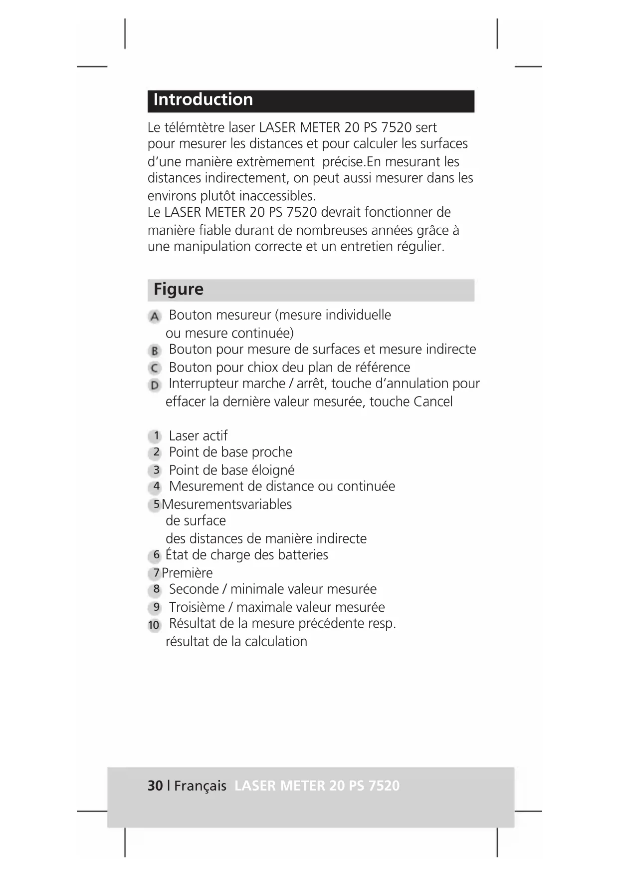Printing and typographical errors as well as technical alterations reserved.30 | Français LASER METER 20 PS 7520 Introduction Le télémtètre laser LASER METER 20 PS 7520 sert pour mesurer les distances et pour calculer les surfaces d‘une manière extrèmement précise.En mesurant les distances indirectement, on peut aussi mesurer dans les environs plutôt inaccessibles. Le LASER METER 20 PS 7520 devrait fonctionner de manière fiable durant de nombreuses années grâce à une manipulation correcte et un entretien régulier. Figure Bouton mesureur (mesure individuelle ou mesure continuée) Bouton pour mesure de surfaces et mesure indirecte Bouton pour chiox deu plan de référence Interrupteur marche / arrêt, touche d‘annulation pour effacer la dernière valeur mesurée, touche Cancel