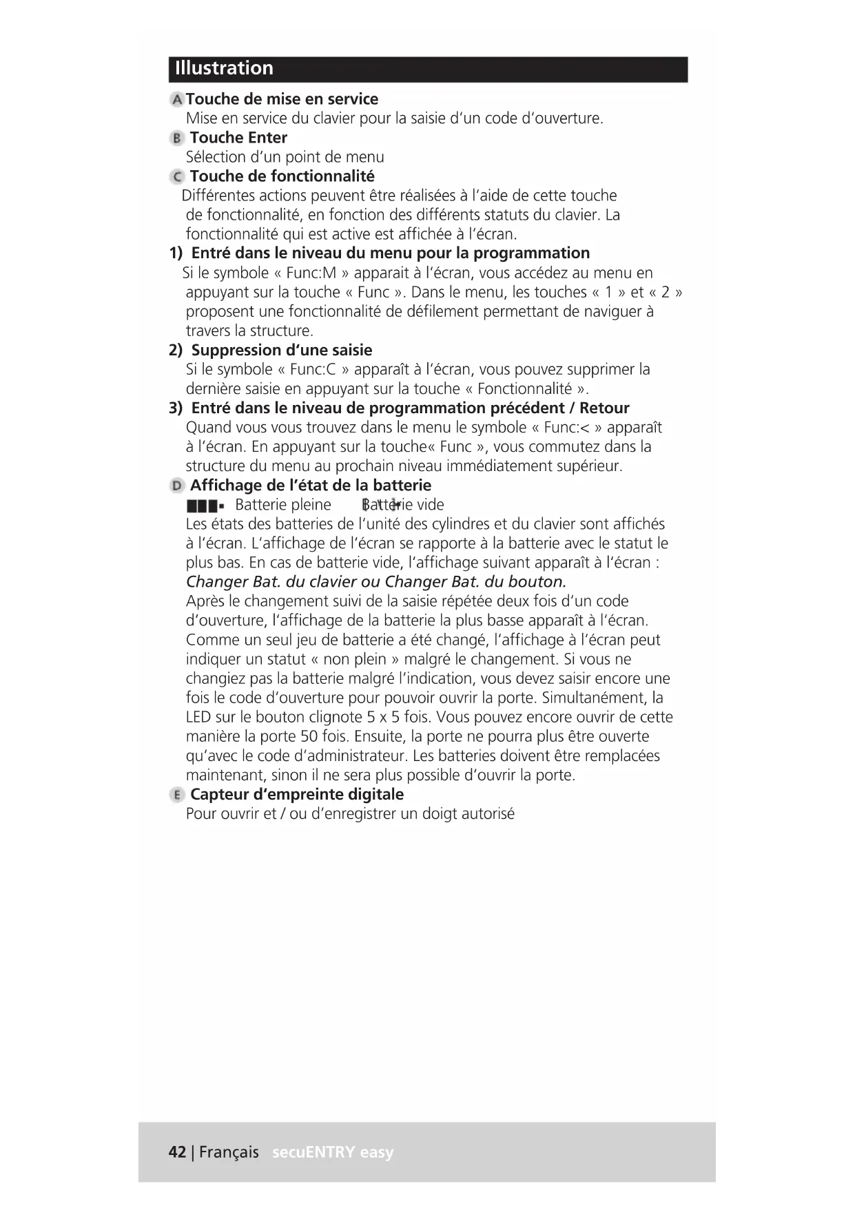 Quand vous vous trouvez dans le menu le symbole «Func:<» apparaît à l‘écran. En appuyant sur la touche«Func», vous commutez dans la structure du menu au prochain niveau immédiatement supérieur. Afchage de l’état de la batterie Batterie pleine Batterie vide Les états des batteries de l‘unité des cylindres et du clavier sont afchés à l‘écran. L‘afchage de l‘écran se rapporte à la batterie avec le statut le plus bas. En cas de batterie vide, l‘afchage suivant apparaît à l‘écran : Changer Bat. du clavier ou Changer Bat. du bouton. Après le changement suivi de la saisie répétée deux fois d‘un code d‘ouverture, l‘afchage de la batterie la plus basse apparaît à l‘écran. Comme un seul jeu de batterie a été changé, l‘afchage à l‘écran peut indiquer un statut «non plein» malgré le changement. Si vous ne changiez pas la batterie malgré l‘indication, vous devez saisir encore une fois le code d‘ouverture pour pouvoir ouvrir la porte. Simultanément, la LED sur le bouton clignote 5 x 5 fois. Vous pouvez encore ouvrir de cette manière la porte 50 fois. Ensuite, la porte ne pourra plus être ouverte qu‘avec le code d‘administrateur. Les batteries doivent être remplacées maintenant, sinon il ne sera plus possible d‘ouvrir la porte. Capteur d‘empreinte digitale Pour ouvrir et / ou d‘enregistrer un doigt autorisésecuENTRY easy Français | 43 Cher client, Nous vous remercions beaucoup d’avoir choisi le système de fermeture électronique secuENTRY easy de la société BURG-WÄCHTER. Ce système a été développé et / ou produit selon les dernières possibilités techniques et répond à des exigences de sécurité très élevées. Le montage du cylindre électronique ne pose aucun problème. On l’installe sans perçage ni pose de câbles sur toute porte ayant une perforation pour cylindre prolé jusqu’à une épaisseur de porte de 118 mm (59 / 59 mm mesurée au milieu de la vis de xation). Le cylindre électronique est parfaitement adaptée pour une nouvelle installation ou un rééquipement.En outre, vous pouvez choisir entre les options les plus diverses, par ex. le médium d’identication que vous désirez utiliser. Pour plus de détails veuillez consulter les pages suivantes. Enlever la bande de sécurité de la batterie sur le bouton intérieur an de mettre le cylindre sous tension. Important: Veuillez lire le mode d’emploi en entier avant de commencer la programmation. Nous vous souhaitons de proter pleinement de votre nouveau système de fermeture. Généralités sur secuENTRY easy Le secuENTRY existe en deux déclinaisons :