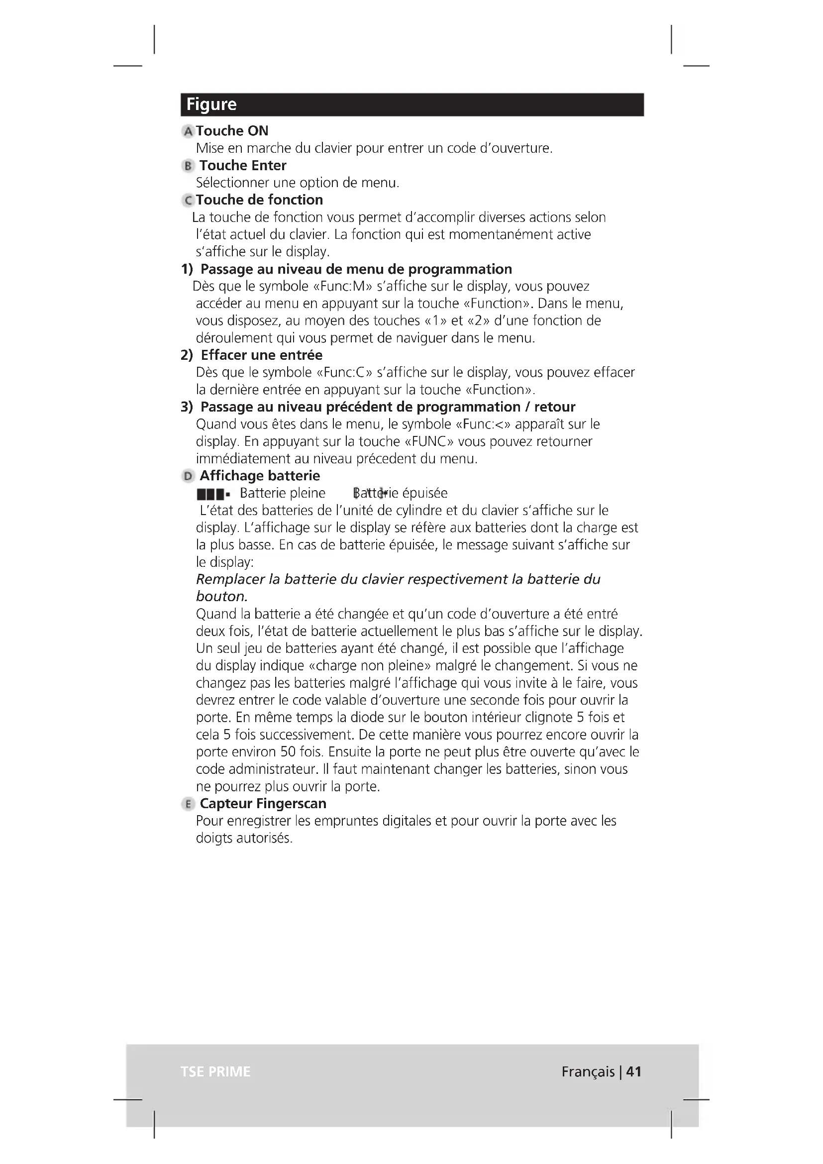 - Mode économie d’énergie En activant le mode économie d’énergie, une consommation optimale de l’énergie est garantie. Le mode économie d’énergie peut être activé ou non. Lorsque le mode est activé, aucune programmation de l’unité peut-être fait via le logiciel PC. Lors de la livraison, le mode économie d’énergie est activé, c’est-à- dire que si vous désirez programmer celui-ci via le logiciel PC, le mode économie d’énergie doit être désactivé. Activation du mode économie d’énergie – Mettez le clavier en service avec la touche – Appuyez ensuite sur FUNC, le menu / modication de code apparait – Vous pouvez faire déler le menu avec les touches 1 et/ou 2 jusqu‘au menu d‘administrateur – Validez avec – Vous pouvez faire déler le menu avec les touches 1 et/ou 2 jusqu‘à ce que le menu «TSE-Setup » apparaisse – Validez avec – Faites déler le menu avec les touches 1 et/ou 2 jusqu’à ce que le menu «Power save» apparaisse – Validez avec – Saisissez le code administrateur de l‘unité à programmer – Grâce aux touchez 1 et 2, vous pouvez par exemple désactiver le mode économie d’énergie – Validez avec – «Les données ont été enregistrées» apparait à l‘écran Sous-menu FS-Reset (Fonction uniquement activé pour l’unité TSE) Tous les Fingerscans enregistrés sont effacés, cependant les utilisateurs correspondants demeurent. En cas d’erreurs répétées lors de l’utilisation du Fingerscan, sélectionnez ce menu et suivez les indications afchées sur le display. Menu Synchronisation E-KEY Cette option de menu permet d’ajuster le canal radio de la E-KEY sur celui de l’unité d’entrée. Cette fonction devient nécessaire dès que le canal radio du cylindre est modié bien qu‘il y ait encore des EKEYs qui fonctionnent sur l’ancien réglage de canal radio. – Mettez le clavier en service avec la touche – Appuyez ensuite sur FUNC, le menu / modication de code apparait – Vous pouvez faire déler le menu avec les touches 1 et/ou 2 jusqu‘à50 | Français TSE PRIME TSE PRIME Français | 51 ce que le menu « Synchronisation E-KEY » apparaisse – Validez avec – Saisissez le code administrateur de l‘unité à programmer – «Les données ont été enregistrées» apparait à l‘écran après la connexion réussie Attention ! Assurez-vous qu‘aucune autre unité TSE sous tension le se trouve à proximité immédiate lors de la connexion d‘un nouveau clavier et/ou d‘un nouveau cylindre car il pourrait être interpellé à tort. En cas de doute, ces unités doivent être mises hors tension (retirez les batteries). Menu Info Le numéro de version et le numéro de série du système sont afchés sus cette fonctionnalité. Pour des raisons de sécurité le numéro de série complet n‘est afché qu‘en mode d‘administrateur. – Mettez le clavier en service avec la touche – Appuyez ensuite sur FUNC, le menu / modication de code apparait – Faites déler le menu avec la touche 2 jusqu‘à ce que le menu d‘informations apparaisse – Validez avec Les numéros de série du clavier (EA) et du cylindre (AA) sont afchés. Remarque: Pour des raisons de sécurité le numéro de série (AA) complet du cylindre n‘est afché qu‘après la saisie du mot de passe valable d‘administrateur. Mode d’emploi TSE E-KEY La E-KEY est un émetteur qui débloque le cylindre. On peut programmer la E-KEY au moyen d’un Keypad ou d’un logiciel TSE. La portée du E-KEY est de 3 m. Le principe de fonctionnement est semblable à celui du système de fermeture d’une voiture. Pour actionner le cylindre il suft d’appuyer une fois sur la touche. Fonctions de la E-KEY Ouverture de porte: – 1 xbrièvement, la diode verte clignote – Fonction automatique (seulement en combinaison avec Keypad) Appuyer sur la touche pendant 6 sec. la diode verte clignote deux fois brièvement – Mode permanent (seulement en combinaison avec le logiciel optionnel) appuyer 2 fois, la diode verte clignote chaque fois 2 fois brièvement En mode automatique il est possible d’ouvrir la porte rien qu’en appuyant sur la touche du Keypad. Pour cela le EKEY doit se trouver à proximité. Après 15 minutes cette fonction se désactive automatiquement. En mode permanent, la porte est débloquée pour la durée dénie dans le logiciel et ce sans entrée d’un code d’ouverture. Si on entre un code d’ouverture pendant cette période, l’ouverture permanente est annulée. Mode de programmation: Le mode de programmation a trois fonctions:52 | Français TSE PRIME – Enregistrement des E-KEYs au moyen d’un Keypad ou d‘un logiciel TSE. – Synchronisation du réglage de canal radio du E-KEY avec celui du réglage de canal dans la serrure. – Recherche du E-KEY dans le logiciel TSE. Programmer la E-KEY Lors de la toute première programmation du E-KEY, veuillez, après y avoir été invité par le clavier ou le logiciel, appuyer une fois sur le bouton (la diode verte clignote). Pour les programmations ultérieures du E-KEY, veuillez appuyer chaque fois sur le bouton pendant 10 sec. jusqu’à ce que la diode verte ait clignoté 3 fois consécutives. Ensuite relâcher le bouton. Remarque: Si, après avoir appuyé une fois sur le bouton de l’E-KEY, vous constatez que l‘ouverture de la porte est retardée de 3 à 7 secondes et que simultanément la diode rouge clignote, il faut changer immédiatement la batterie (CR2032). Si, après avoir appuyé une fois sur le bouton du E-KEY, vous constatez que la porte ne s’ouvre qu’après 3 à 7 secondes sans clignotement de la diode rouge, il faut changer les batteries dans le cylindre (2x 1,5V LR06 Alcaline). Ceci vaut également pour le clavier, s‘il y en a un. Changement de batterie du E-KEY 1 Ouvrez le couvercle du boîtier en levant prudemment le mécanisme d‘enclenchement. 2 Soulevez la natte de silicone et changez la batterie. 3 Rabattez la natte de silicone et re