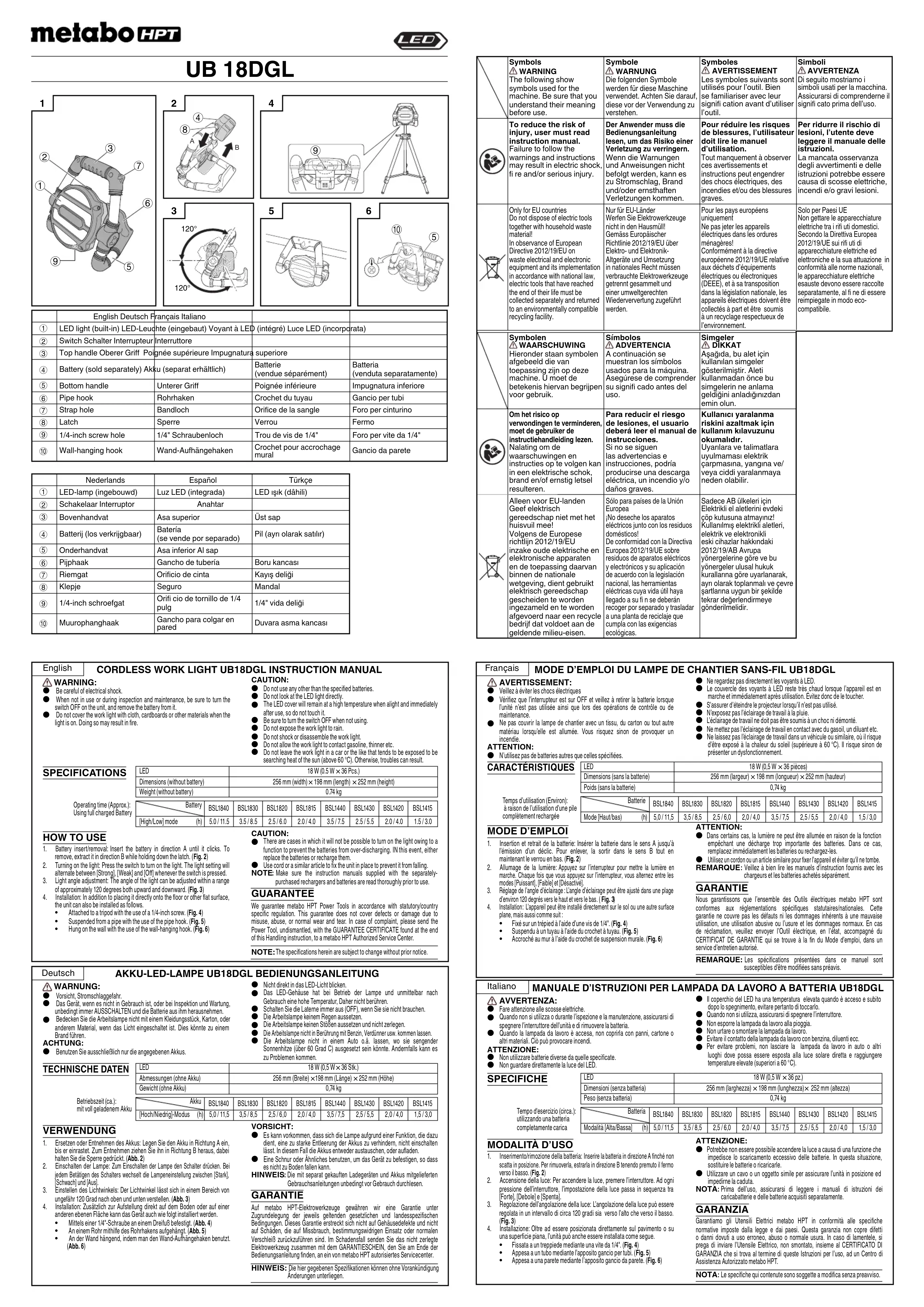 Utilisez un cordon ou un article similaire pour fi xer l’appareil et éviter qu'il ne tombe. REMARQUE : Veillez à bien lire les manuels d’instruction fournis avec les chargeurs et les batteries achetés séparément. GARANTIE Nous garantissons que l’ensemble des Outils électriques metabo HPT sont conformes aux réglementations spécifi ques statutaires/nationales. Cette garantie ne couvre pas les défauts ni les dommages inhérents à une mauvaise utilisation, une utilisation abusive ou l’usure et les dommages normaux. En cas de réclamation, veuillez envoyer l’Outil électrique, en l’état, accompagné du CERTIFICAT DE GARANTIE qui se trouve à la fi n du Mode d’emploi, dans un service d’entretien autorisé. REMARQUE: Les spécifi cations présentées dans ce manuel sont susceptibles d'être modifi ées sans préavis. Italiano MANUALE D’ISTRUZIONI PER LAMPADA DA LAVORO A BATTERIA UB18DGL AVVERTENZA: