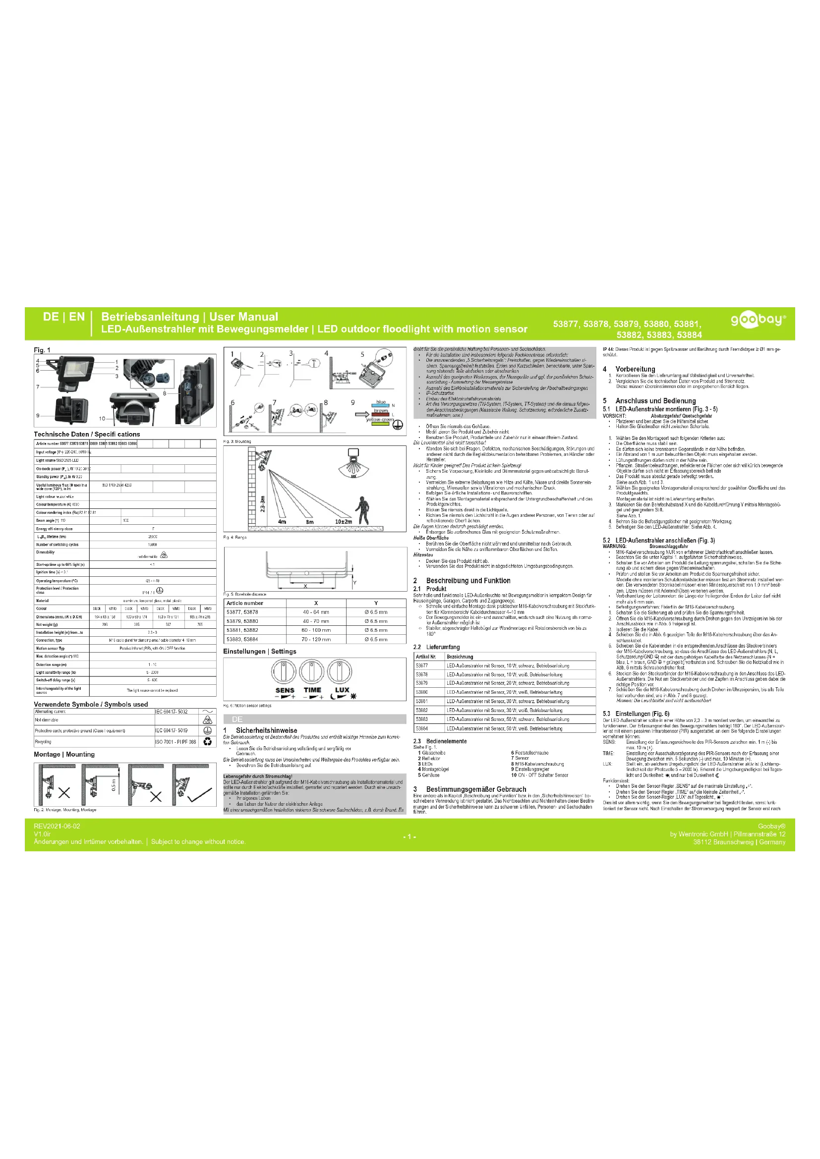 Le projecteur extérieur à LED doit être monté à une hauteur de 2,3 à 3 m pour fonctionner cor-rectement. L‘angle de détection du détecteur de mouvement est de 180°. Le projecteur extérieur à LED est équipé d‘un capteur infrarouge passif (PIR) sur lequel vous pouvez effectuer les rég-lages suivants :SENS : Réglage de la plage de détection du capteur PIR entre min. 1 m (-) et max. 10 m (+). TIME : Défi nit le délai de désactivation du capteur PIR après la détection d‘un mouvement entre min. 5 secondes (-) et max. 10 minutes (+). LUX : Défi nit à partir de quelle lumière ambiante le projecteur extérieur à LED est actif (sensibilité lumineuse de la cellule photoélectrique 5 - 2000 lx). Détecte la luminosité ambiante en plein jour et dans l‘obscurité , et uniquement dans l‘obscurité .Test de fonctionnement :• Tournez la commande du capteur „SENS“ sur le réglage maximum „+“.• Tournez la commande du capteur „TIME“ sur la plus petite unité de temps „-“.• Tournez la commande du capteur „LUX“ sur la lumière du jour „ Ceci est particulièrement important lorsque vous testez le détecteur de mouvement à la lumière du jour, sinon le capteur ne fonctionnera pas. Après la mise sous tension, le capteur ne réagit FR | IT Mode démploi | Istruzioni per l‘uso Sous réserve de modifi cations. | Con riserva di modifi che.53877, 53878, 53879, 53880, 53881, 53882, 53883, 53884 Goobay® by Wentronic GmbH | Pillmannstraße 12 38112 Braunschweig | Germany