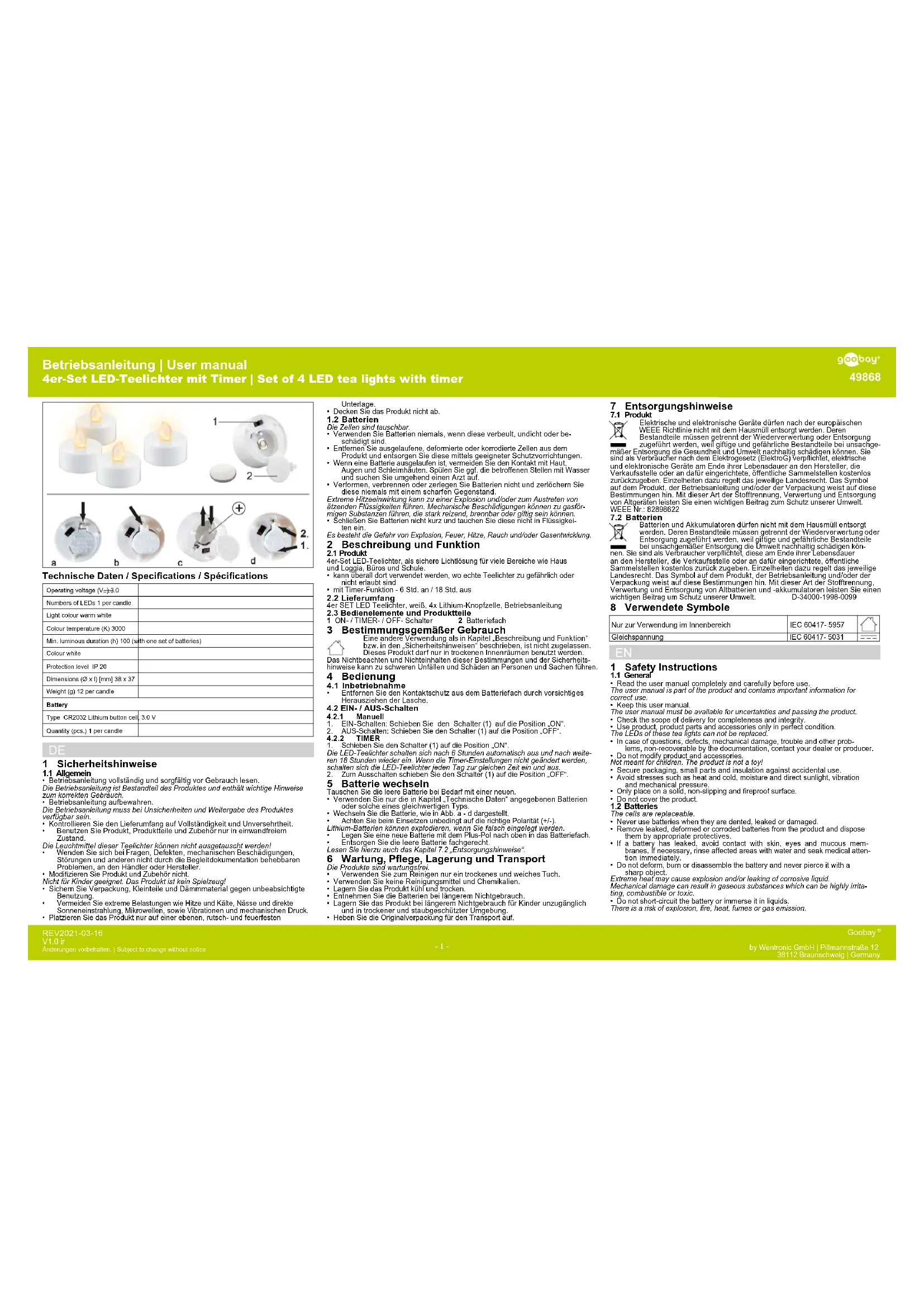 49868 - Bougie LED Goobay - Notice d'utilisation et mode d'emploi gratuit