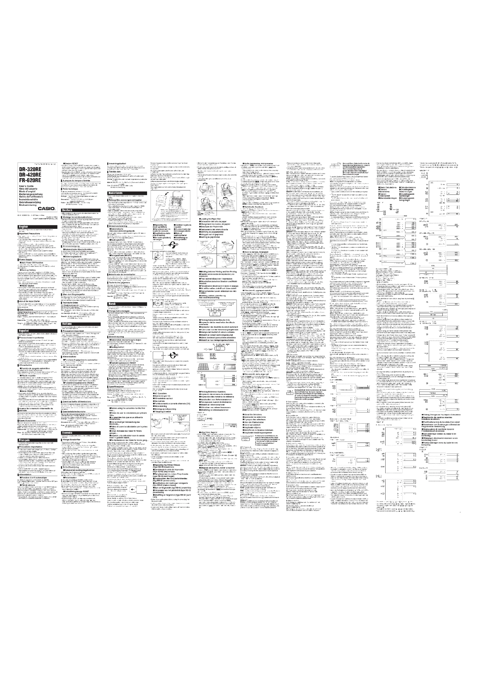 - Une pression sur le bouton RESET supprime tout le contenu de la mémoire. Conservez toujours des copies des réglages et des données numériques que vous jugez importants pour vous protéger contre une perte éventuelle.• Appuyez sur le bouton RESET au dos de la calculatrice lorsque la calculatrice fonctionne mal pour rétablir un fonctionnement normal. Si la calculatrice ne fonctionne toujours pas normalement après une pression de ce bouton, adressez-vous à votre détaillant ou au revendeur le plus proche. A propos du tampon d’entrée Le tampon d’entrée de cette calculatrice mémorise 16 opérations de touches afin que vous puissiez continuer vos entrées de touches pendant la réalisation d’une autre opération. Fiche technique Plage de température de travail : 0 °C à 40 °CAlimentation de fonctionnement : La courant et la tension nominaux sont imprimés sur la calculatrice.Horloge : Précision dans des températures normales : ±3 secondes par jourDimensions : 111,2 (H) × 204,5 (L) × 376,5 (P) mm, support de rouleau sortiPoids : DR-320RE/FR-620RE: Environ 1,4 kg DR-420RE: Environ 1,5 kg Deutsch