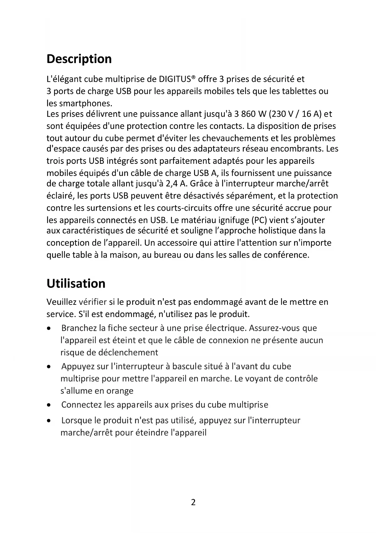 Guide d'installation rapide DA-706232 Description L'élégant cube multiprise de DIGITUS® offre 3 prises de sécurité et 3 ports de charge USB pour les appareils mobiles tels que les tablettes ou les smartphones. Les prises délivrent une puissance allant jusqu'à 3 860 W (230 V / 16 A) et sont équipées d'une protection contre les contacts. La disposition de prises tout autour du cube permet d'éviter les chevauchements et les problèmes d'espace causés par des prises ou des adaptateurs réseau encombrants. Les trois ports USB intégrés sont parfaitement adaptés pour les appareils mobiles équipés d'un câble de charge USB A, ils fournissent une puissance de charge totale allant jusqu'à 2,4 A. Grâce à l'interrupteur marche/arrêt éclairé, les ports USB peuvent être désactivés séparément, et la protection contre les surtensions et les courts-circuits offre une sécurité accrue pour les appareils connectés en USB. Le matériau ignifuge (PC) vient s’ajouter aux caractéristiques de sécurité et souligne l’approche holistique dans la conception de l’appareil. Un accessoire qui attire l'attention sur n'importe quelle table à la maison, au bureau ou dans les salles de conférence. Utilisation Veuillez vérifier si le produit n'est pas endommagé avant de le mettre en service. S'il est endommagé, n'utilisez pas le produit.