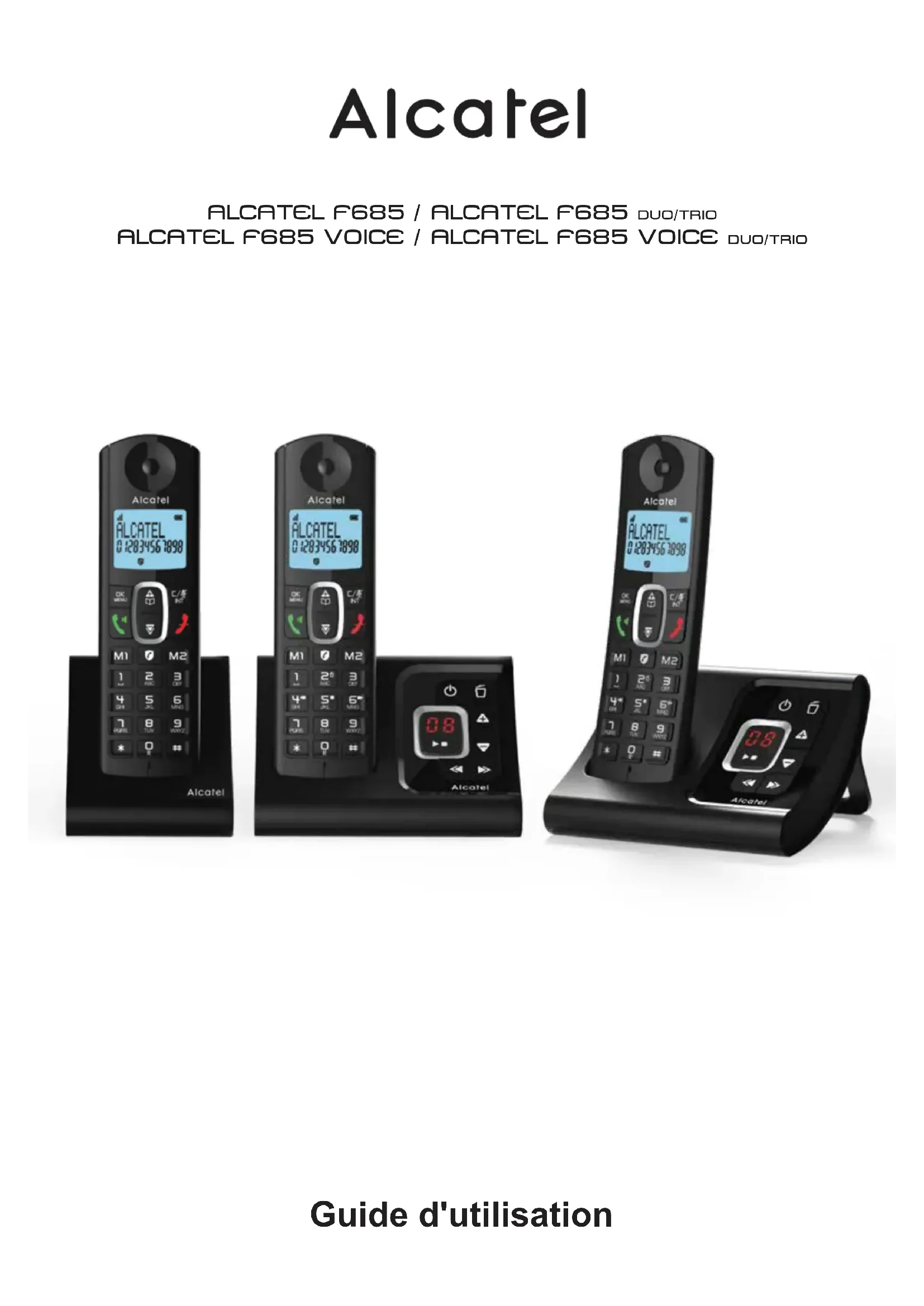 - ALCATEL F685 VOICE / ALCATEL F685 VOICE DUO/TRIOALCATEL F685 / ALCATEL F685 DUO/TRIO ALCATEL F685 VOICE / ALCATEL F685 VOICE DUO/TRIO L'emballage contient les éléments suivants : Alcatel F685 / F685 Voice - la base, - le cordon de ligne, - 1 prise téléphonique en forme de T, - le combiné, - l’alimentation électrique, - le guide rapide. Alcatel F685 / F685 Voice duo/trio - le(s) combiné(s) supplémentaire(s) - le(s) chargeur(s) - les batteries Afin de vous familiariser avec votre téléphone Alcatel F685 / F685 Voice, nous vous recommandons de lire attentivement ce manuel, ainsi que les consignes de sécurité avant toute utilisation. Nous vous invitons également à communiquer et partager les avertissements détaillés dans ce guide avec l’ensemble de votre famille et notamment vos enfants. Il est rappelé aux parents et personnes en charge de très jeunes enfants qu’ils doivent veiller d’une façon générale à ce que les enfants ne portent pas à la bouche des objets métalliques, des pièces ou éléments plastiques, hors ceux à usage alimentaire.1. PREMIÈRE UTILISATION p. 3