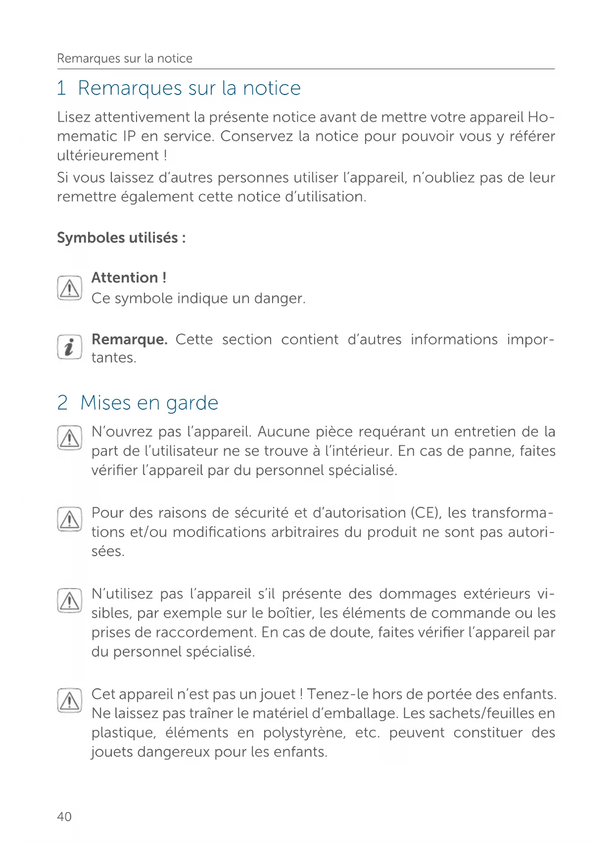 - 11 Caractéristiques techniques Remarques sur la notice 1 Remarques sur la notice Lisez attentivement la présente notice avant de mettre votre appareil Ho- mematic IP en service. Conservez la notice pour pouvoir vous y référer ultérieurement! Si vous laissez d’autres personnes utiliser l’appareil, n’oubliez pas de leur remettre également cette notice d’utilisation. Symboles utilisés: Attention! Ce symbole indique un danger. Remarque. Cette section contient d’autres informations impor- tantes. 2 Mises en garde N’ouvrez pas l’appareil. Aucune pièce requérant un entretien de la part de l’utilisateur ne se trouve à l’intérieur. En cas de panne, faites vérifier l’appareil par du personnel spécialisé. Pour des raisons de sécurité et d’autorisation(CE), les transforma- tions et/ou modifications arbitraires du produit ne sont pas autori- sées. N’utilisez pas l’appareil s’il présente des dommages extérieurs vi- sibles, par exemple sur le boîtier, les éléments de commande ou les prises de raccordement. En cas de doute, faites vérifier l’appareil par du personnel spécialisé. Cet appareil n’est pas un jouet ! Tenez-le hors de portée des enfants. Ne laissez pas traîner le matériel d’emballage. Les sachets/feuilles en plastique, éléments en polystyrène, etc. peuvent constituer des jouets dangereux pour les enfants.41 Fonction et aperçu de l‘appareil Notre responsabilité ne saurait être engagée en cas de dommages matériels ou de dommages corporels dus au maniement inappro- prié ou au non-respect des mises en garde. Dans de tels cas, tout droit à la garantie est annulé ! Nous ne pouvons être tenus respon- sables des dommages indirects occasionnés ! Installez l’appareil à un endroit protégé des intempéries. Éviter l’exposition aux vibrations, au soleil et aux autres rayonnements thermiques, ainsi qu’aux charges mécaniques. L’appareil convient uniquement pour l’utilisation dans des environ- nements d’habitat. Toute application autre que celle décrite dans le présent mode d’emploi n’est pas conforme et entraîne l’exclusion de la garantie et de la responsabilité. 3 Fonction et aperçu de l‘appareil Allié au Mécanisme de serrure Homematic IP, le Keypad Homematic IP vous permet d’accorder l’accès à votre Smart Home à jusqu’à 8 membres de votre famille, amis, etc. La saisie d’un code PIN ouvre, verrouille ou dé- verrouille la porte. De plus, les éléments Homematic IP complémentaires contribuent à créer des scénarios variés pour le retour ou le départ de la maison (par ex. l’activation de l’éclairage du couloir). La configuration ainsi que l’achage de l’état actuel de la porte sont réa- lisés au moyen de l’application gratuite HomematicIP. Grâce à la communication radio et au fonctionnement sur pile, le lieu de montage peut être déterminé librement. Aucun raccordement au réseau n’est nécessaire à proximité de la porte. Le montage à l’emplacement choisi peut être réalisé au moyen des vis et chevilles fournies.42 Informations générales sur le système Le détecteur de capacité intégré vous ore un confort supplémentaire. Ainsi, même en cas de luminosité extérieure faible, vous pouvez toujours déceler les touches du Keypad équipé d’un éclairage intégré. Vue d’ensemble de l’appareil (voir les figures 1 et 2): (A) Support mural (B) Keypad (C) Clavier numérique avec les touches 0-9 (D) Touche «Verrouiller» (E) Touche «Déverrouiller» (F) Détecteur de proximité (G) LED de l’appareil (H) Touche système (touche d’apprentissage) (I) Contact anti-sabotage (J) Compartiment à piles (couvercle) (K) Orifice pour l’écoulement des eaux de pluie (L) Trous de vis (M) Dispositif d’encliquetage 4 Informations générales sur le système Cet appareil fait partie du système Smart Home de Homematic IP et com- munique par le biais du Homematic IP Protocole radio. Tous les appareils du système peuvent être configurés facilement et individuellement avec un smartphone à l’aide de l’application Homematic IP. Vous avez également la possibilité d’utiliser les appareils Homematic IP via la centrale CCU3 ou en association avec de nombreuses solutions de partenaires. Vous trou- verez dans le manuel de l’utilisateur Homematic IP l’étendue des fonctions du système en association avec d’autres composants. Vous trouverez tous les documents techniques actuels et les dernières mises à jour sur www.homematic-ip.com.43 Mise en service 5 Mise en service p. 5440