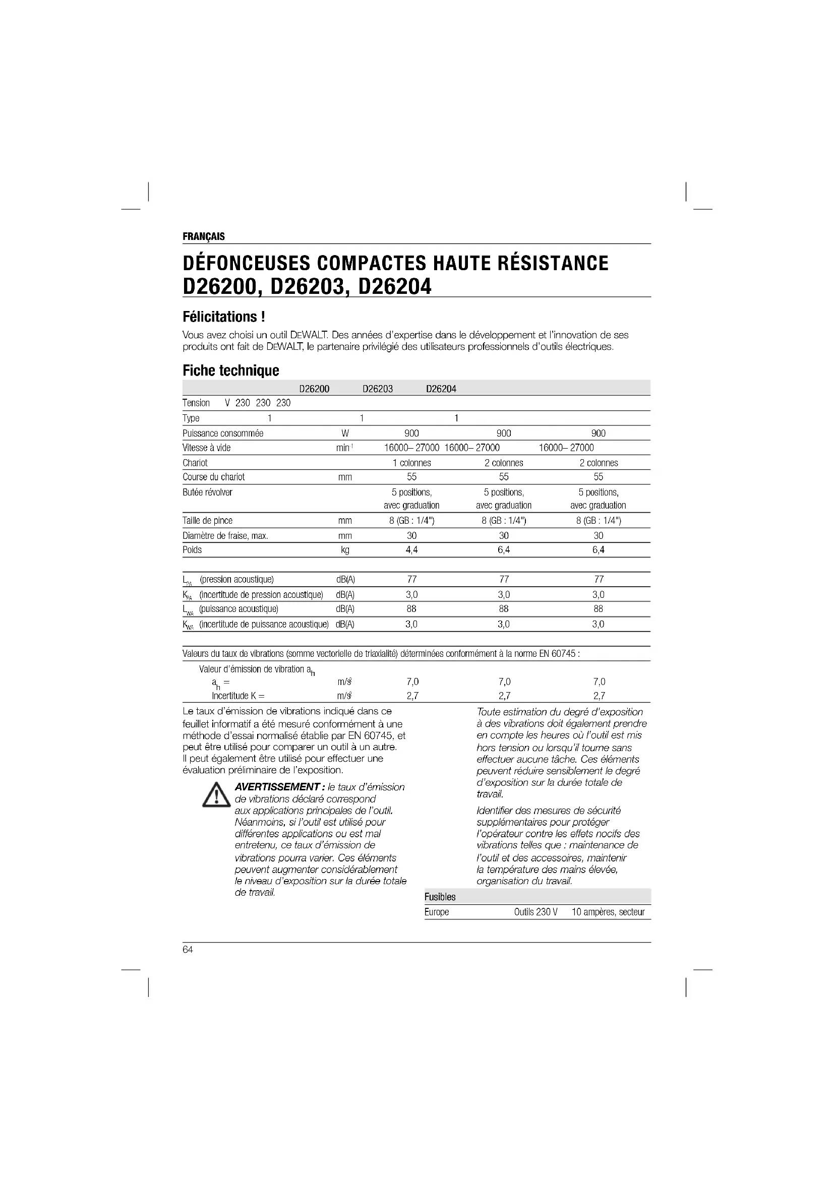 D26200, D26203, D26204 Félicitations! Vous avez choisi un outil DEWALT. Des années d’expertise dans le développement et l’innovation de ses produits ont fait de DEWALT, le partenaire privilégié des utilisateurs professionnels d’outils électriques. Fiche technique D26200 D26203 D26204 Tension V 230 230 230 Type 1 1 1 Puissance consommée W 900 900 900 Vitesse à vide min