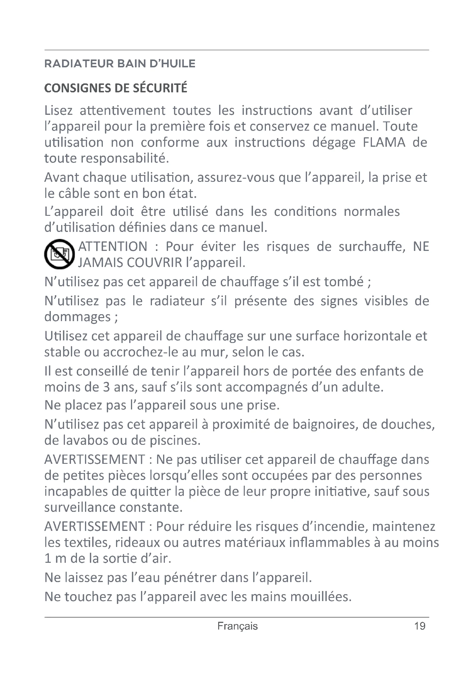 Lisez aenvement toutes les instrucons avant d’uliser l’appareil pour la première fois et conservez ce manuel. Toute ulisaon non conforme aux instrucons dégage FLAMA de toute responsabilité. Avant chaque ulisaon, assurez-vous que l’appareil, la prise et le câble sont en bon état. L’appareil doit être ulisé dans les condions normales d’ulisaon dénies dans ce manuel. ATTENTION : Pour éviter les risques de surchaue, NE JAMAIS COUVRIR l’appareil. N’ulisez pas cet appareil de chauage s’il est tombé ; N’ulisez pas le radiateur s’il présente des signes visibles de dommages ; Ulisez cet appareil de chauage sur une surface horizontale et stable ou accrochez-le au mur, selon le cas. Il est conseillé de tenir l’appareil hors de portée des enfants de moins de 3 ans, sauf s’ils sont accompagnés d’un adulte. Ne placez pas l’appareil sous une prise. N’ulisez pas cet appareil à proximité de baignoires, de douches, de lavabos ou de piscines.