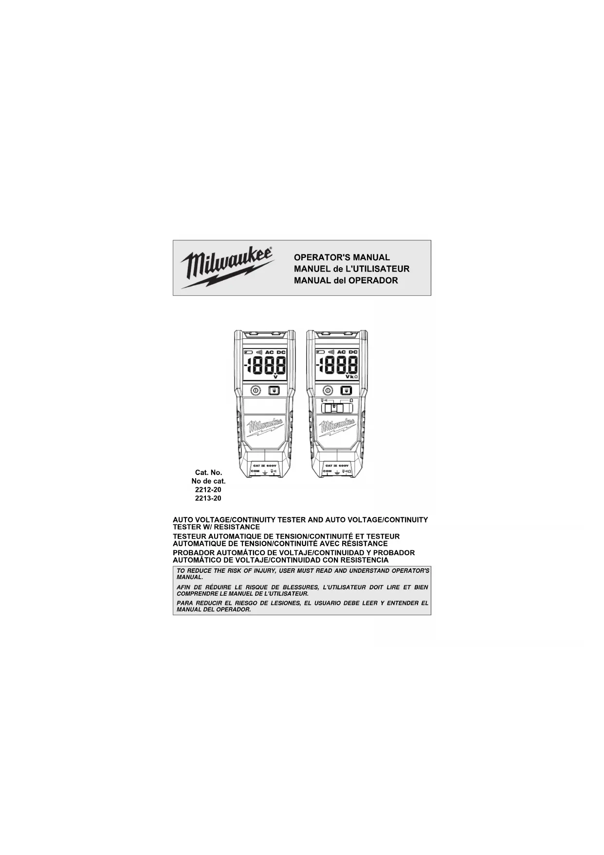 Téléchargez la notice de votre Multimètre au format PDF gratuitement ! Retrouvez votre notice 221220 - MILWAUKEE et reprennez votre appareil électronique en main. Sur cette page sont publiés tous les documents nécessaires à l'utilisation de votre appareil 221220 de la marque MILWAUKEE.