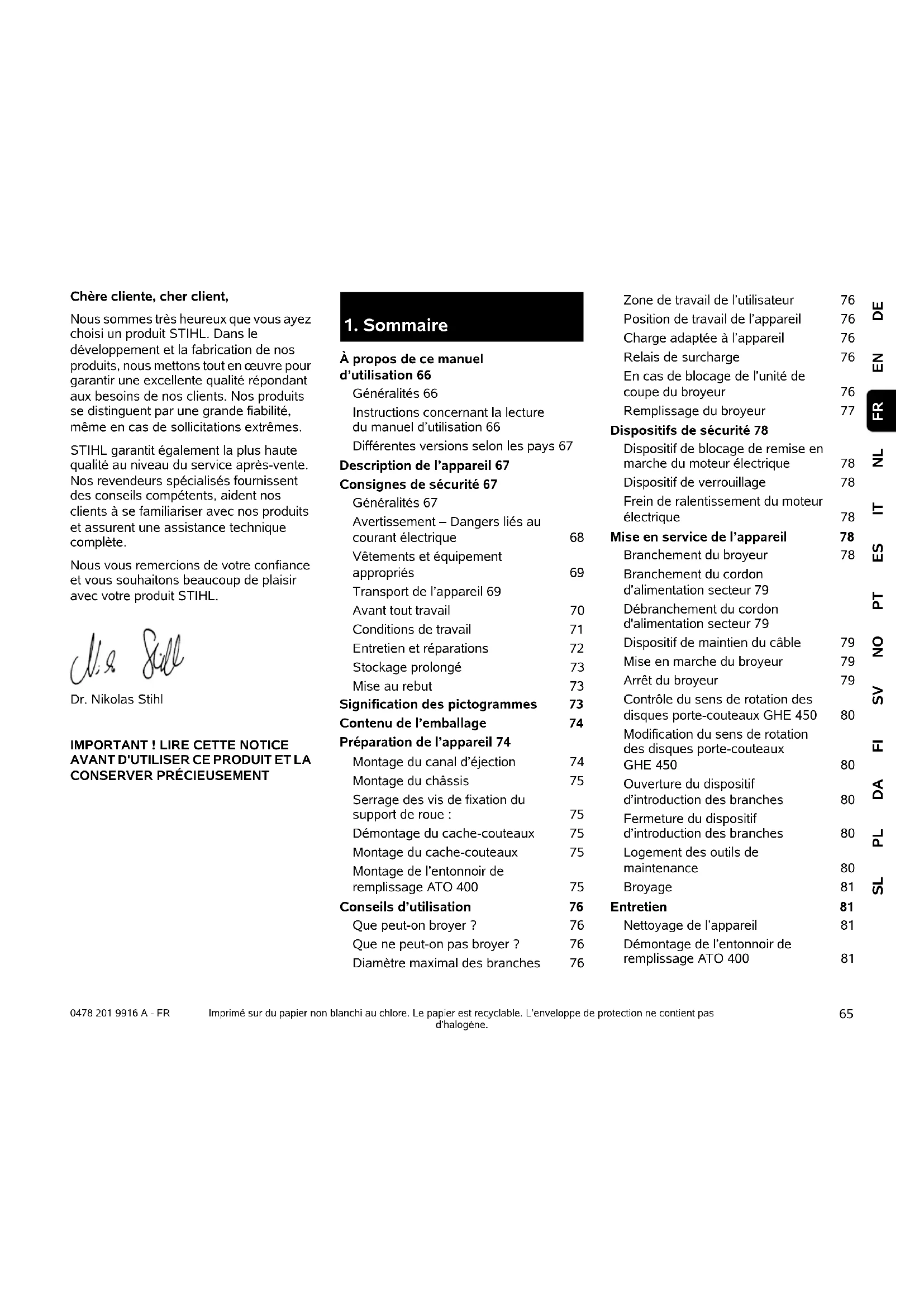 À propos de ce manuel d’utilisation 66 Généralités 66 Instructions concernant la lecture du manuel d’utilisation 66 Différentes versions selon les pays 67 Description de l’appareil 67 Consignes de sécurité 67 Généralités 67 Avertissement – Dangers liés au courant électrique 68 Vêtements et équipement appropriés 69 Transport de l’appareil 69 Avant tout travail 70 Conditions de travail 71 Entretien et réparations 72 Stockage prolongé 73 Mise au rebut 73 Signification des pictogrammes 73 Contenu de l’emballage 74 Préparation de l’appareil 74 Montage du canal d’éjection 74 Montage du châssis 75 Serrage des vis de fixation du support de roue : 75 Démontage du cache-couteaux 75 Montage du cache-couteaux 75 Montage de l’entonnoir de remplissage ATO 400 75 Conseils d’utilisation 76 Que peut-on broyer ? 76 Que ne peut-on pas broyer ? 76 Diamètre maximal des branches 76 Zone de travail de l’utilisateur 76 Position de travail de l’appareil 76 Charge adaptée à l’appareil 76 Relais de surcharge 76 En cas de blocage de l’unité de coupe du broyeur 76 Remplissage du broyeur 77 Dispositifs de sécurité 78 Dispositif de blocage de remise en marche du moteur électrique 78 Dispositif de verrouillage 78 Frein de ralentissement du moteur électrique 78 Mise en service de l’appareil 78 Branchement du broyeur 78 Branchement du cordon d’alimentation secteur 79 Débranchement du cordon d'alimentation secteur 79 Dispositif de maintien du câble 79 Mise en marche du broyeur 79 Arrêt du broyeur 79 Contrôle du sens de rotation des disques porte-couteaux GHE 450 80 Modification du sens de rotation des disques porte-couteaux GHE 450 80 Ouverture du dispositif d’introduction des branches 80 Fermeture du dispositif d’introduction des branches 80 Logement des outils de maintenance 80 Broyage 81 Entretien 81 Nettoyage de l’appareil 81 Démontage de l’entonnoir de remplissage ATO 400 810478 201 9916 A - FR