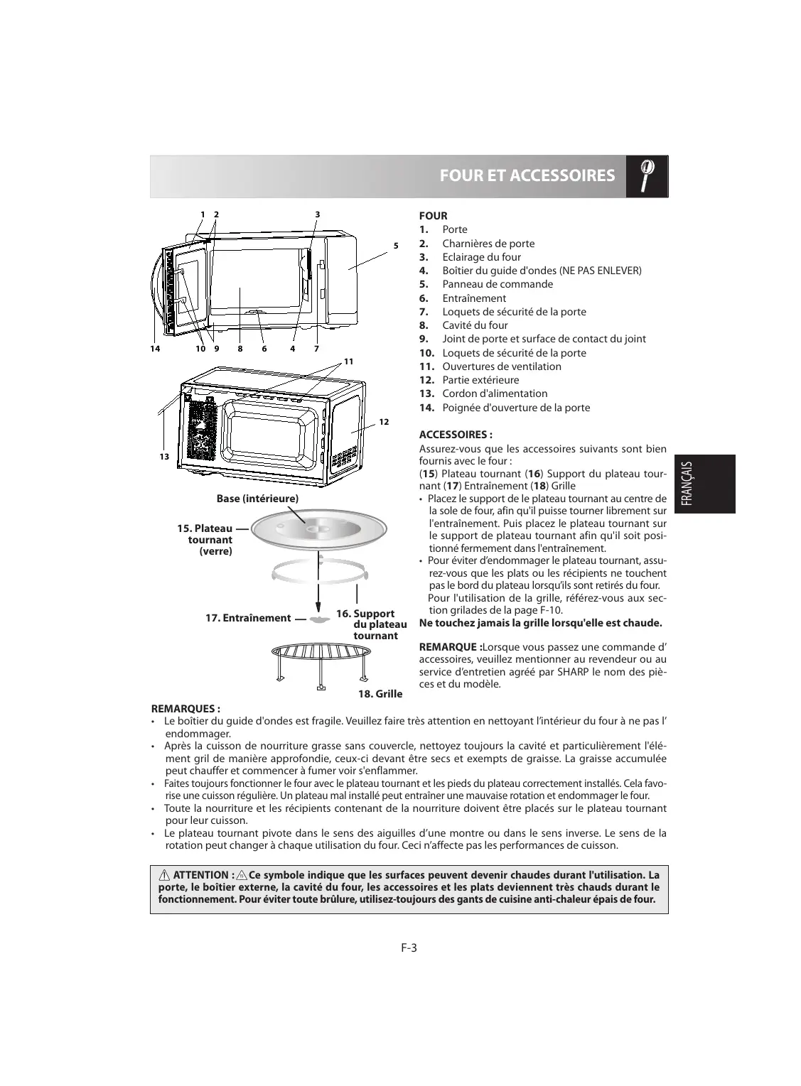 Les accessoires tels que la plateau tournant, le support de la plateau tournant et la grille doivent être nettoyés dans une solution de liquide vaisselle doux et sechéés. Le nettoyage au lave-vaisselle est possible.