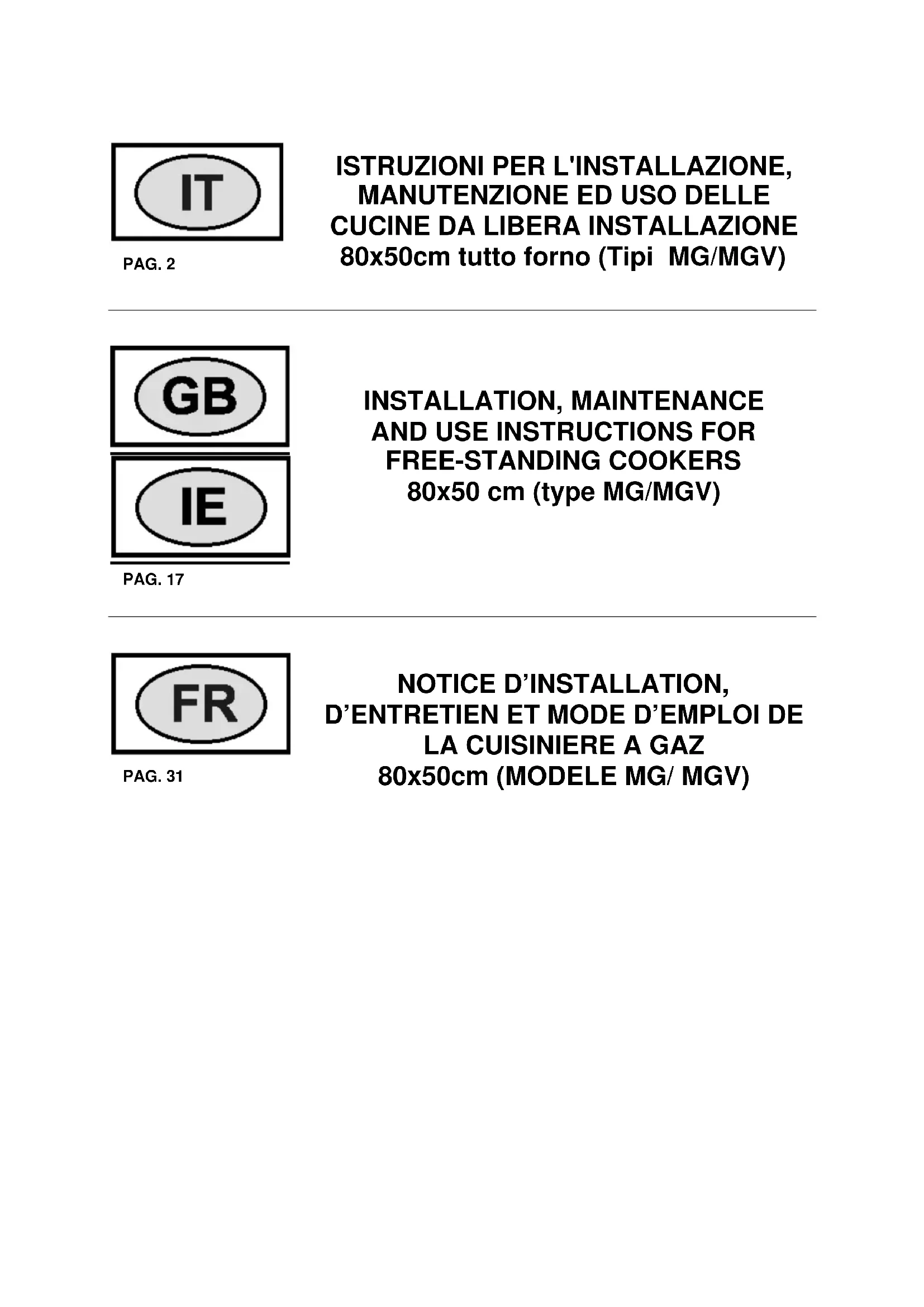 ET MODE D’EMPLOI DE LA CUISINIERE A GAZ 80x50cm (MODELE MG/ MGV) LIRE ATTENTIVEMENT LE CONTENU DE CETTE NOTICE AVANT D’INSTALLER OU D’UTILISER LA CUISINIERE. Cette notice n’est valable que dans les pays de destination dont les sigles figurent sur la couverture et sur l’étiquette de la cuisinière. Le fabricant décline toute responsabilité en cas de dommages à des personnes ou à des biens provoqués par une mauvaise installation ou un usage impropre de la cuisinière. Le fabricant ne saurait être retenu responsable des inexactitudes éventuelles dues à des erreurs d’impression ou de transcription, contenues dans cette notice. Les dessins sont purement indicatifs. Le fabricant se réserve le droit d’apporter les modifications qu’il jugera utiles à tout moment et sans préavis, mais sans modifier les caractéristiques essentielles de sécurité et de fonctionnement. INDEX : NOTICE TECHNIQUE DESTINEE A L’INSTALLATEUR ................................................................................ page 32 Installation de la cuisinière - Conseils importants sur l’installation ................................................................. page 33 Ventilation et aération de la pièce .................................................................................................................. page 33 Raccordement au réseau de distribution du gaz ............................................................................................. page 33 Adaptation aux différents type de gaz et réglage des brûleurs ........................................................................ page 34-35 Raccordement électrique ................................................................................................................................ page 35-36 ENTRETIEN DE L'APPAREIL - Changement des composants ...................................................................... page 36 NOTICE D’EMPLOI ET D’ENTRETIEN .......................................................................................................... page 37 Description des plans de cuisson .................................................................................................................... page 37 Description du tableau de bord et des commandes ........................................................................................ page 37 Utilisation des brûleurs .................................................................................................................................... page 38 Utilisation des plaques elestriques ................................................................................................................. page 38-39 Utilisation du four à gaz ................................................................................................................................... page 39-40 Utilisation du thermostat avec commutateur en serie - Utilisation du thermostat électrique ............................ page 40-41 Utilisation des commutateur 4+0 et commutateur 9+0 .................................................................................... page 41-42 Utilisation du four électrique a convection naturelle ........................................................................................ page 42 Utilisation du four électrique statique a convection ventilée ............................................................................ page 43 Utilisation du four électrique ventilé ........................................................................................ ......................... page 43-44 Utilisation du grill a gaz ................................................................................................................................... page 44 Utilisation du grill électrique statique - Utilisation du grill électrique ventilé ..................................................... page 45 Utilisation de la minuterie - Utilisation du programmateur electronique ........................................................... page